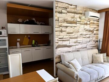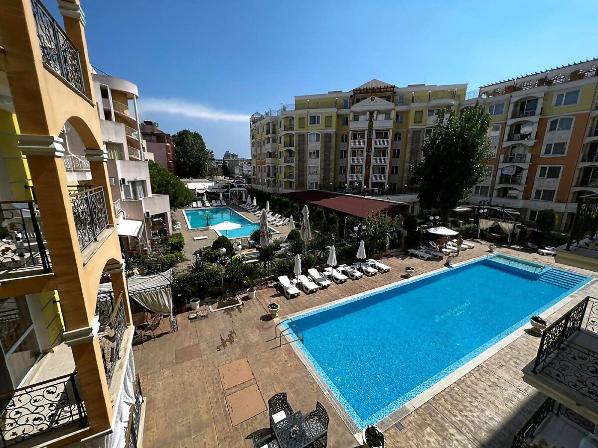 Апартаментът е с площ 57кв.м. и се състои от просторна и светла всекидневна с кухненски блок, голяма спалня, баня и тераса с гледка към басейна.