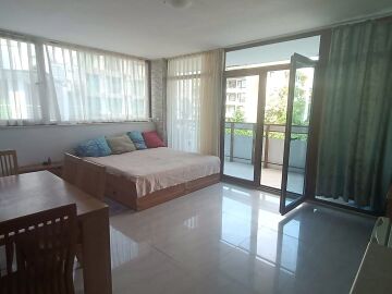 Студиото се намира на трети етаж и е с площ от 57,95кв.м., състои се от голяма тераса с гледка към басейна, всекидневна с кухненски блок и баня.