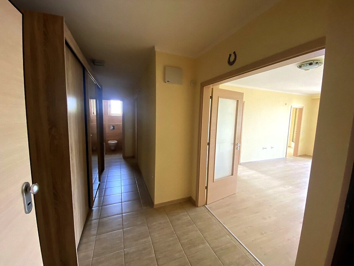 Апартаментът се намира на трети етаж и е с площ от 114кв.м., състои се от антре, всекидневна с кухненски блок, две спални, две бани и голяма тераса с гледка към двора