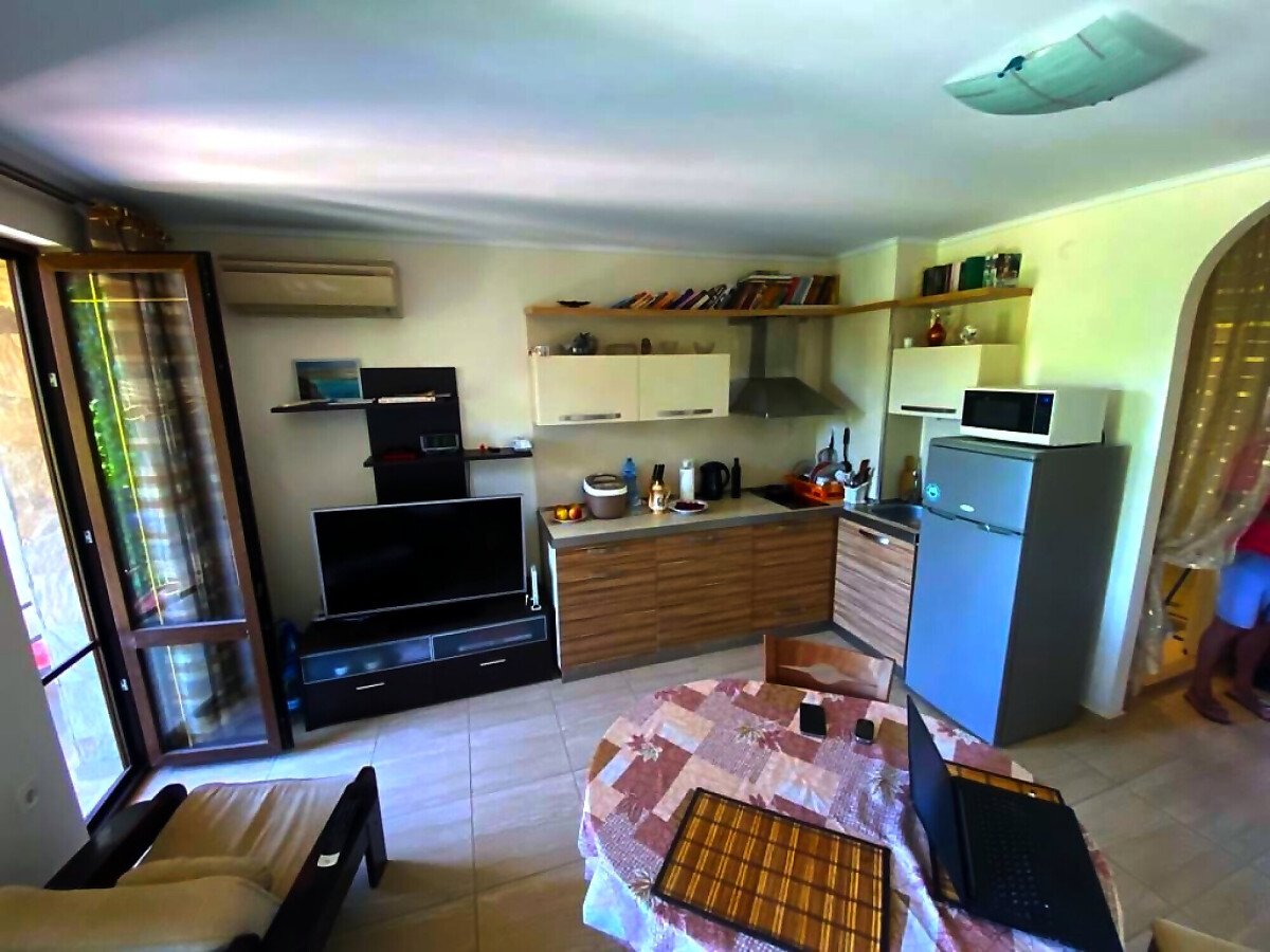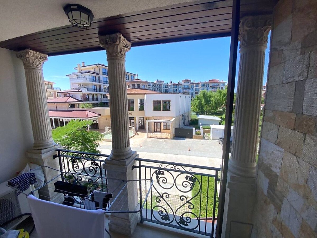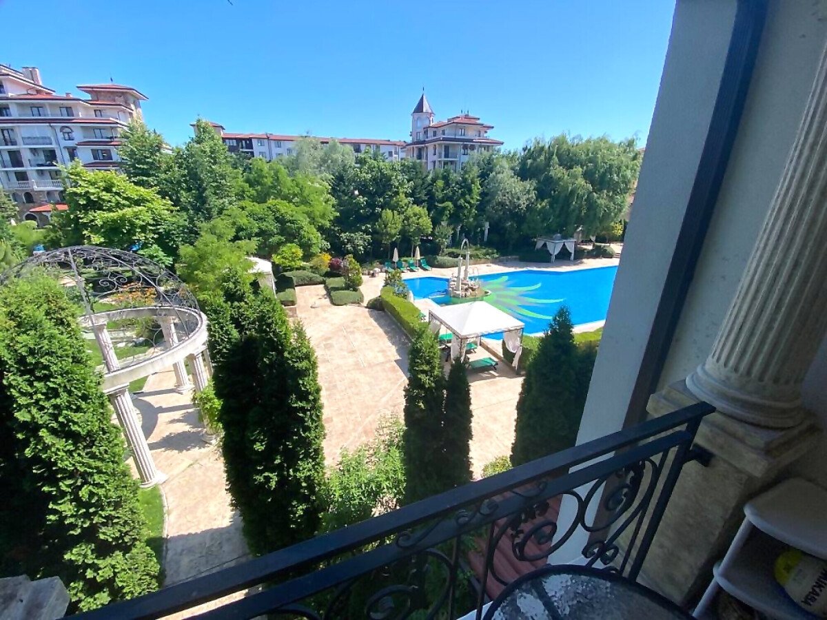 Апартаментът се намира на трети етаж и е с площ от 70кв.м., състои се от антре, всекидневна с кухненски блок, спалня, баня и две тераси с гледка към басейна.