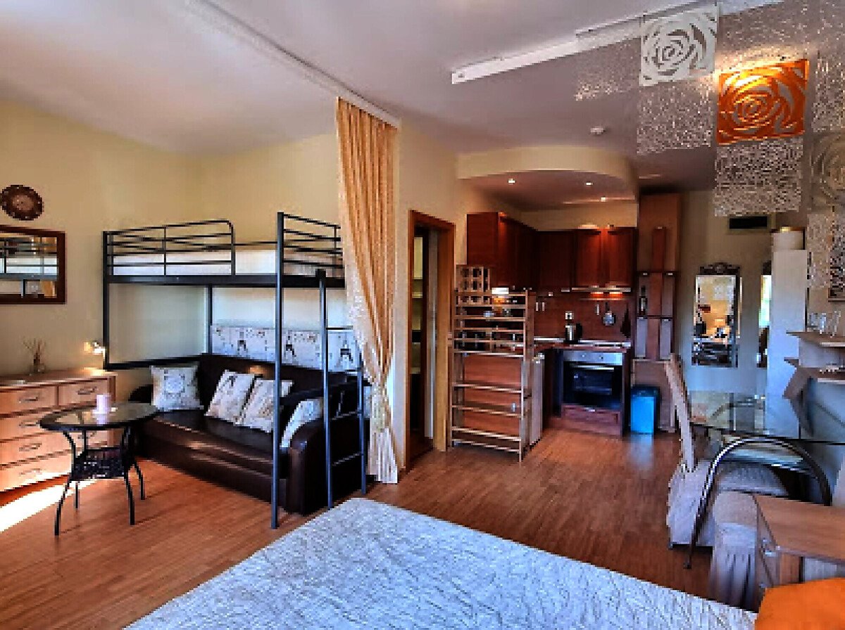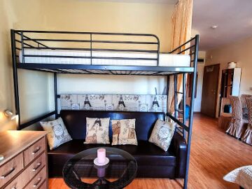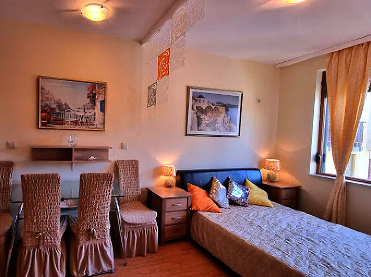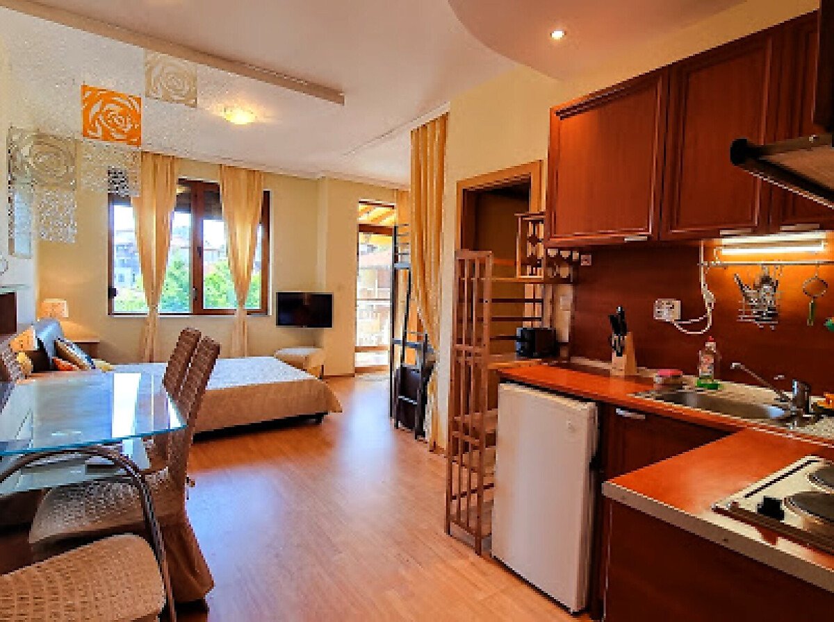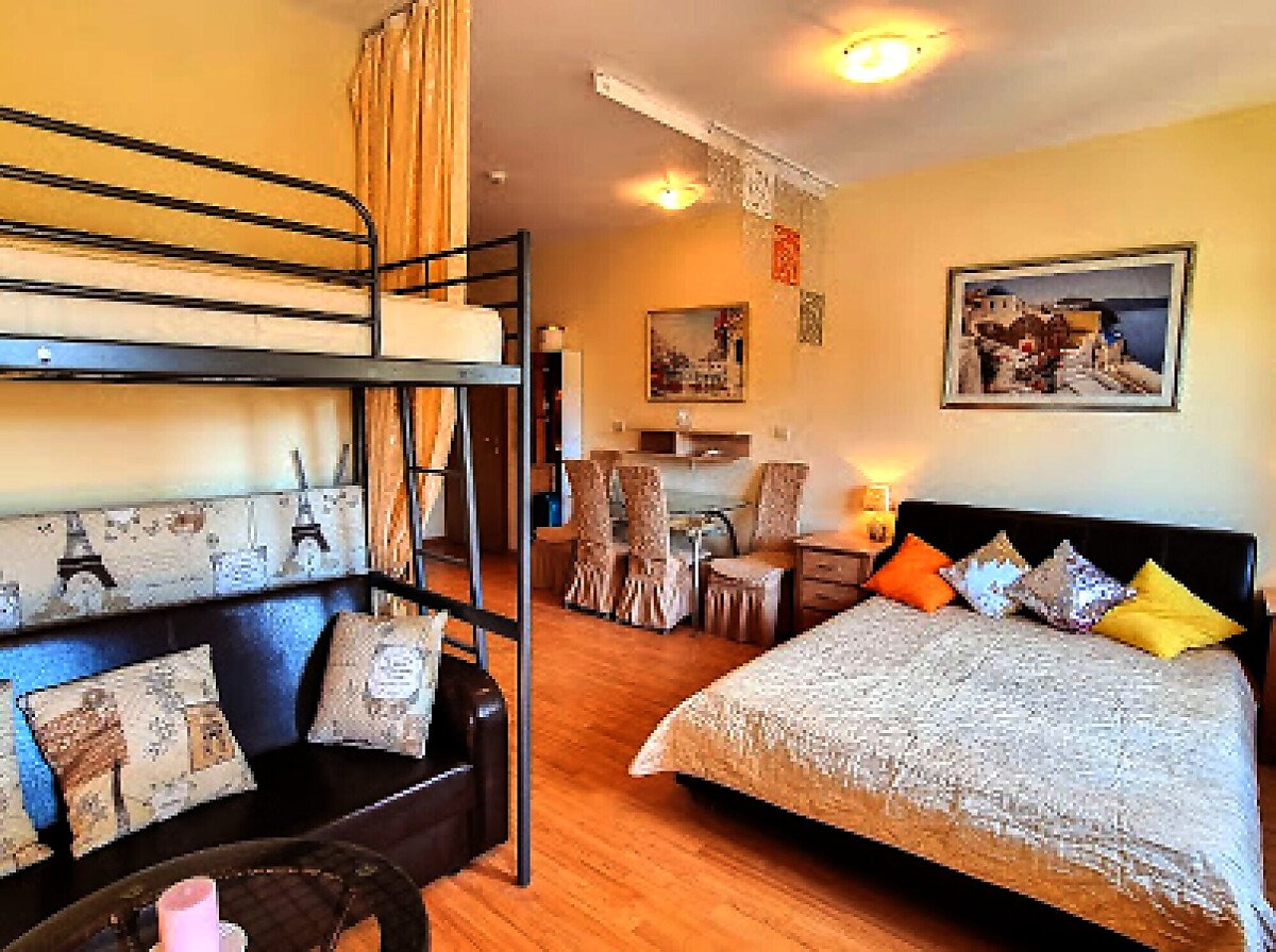 Студиото се намира на трети етаж и е с площ от 40кв.м., състои се от огромна всекидневна с кухненски блок, баня и тераса с гледка към басейн и море.