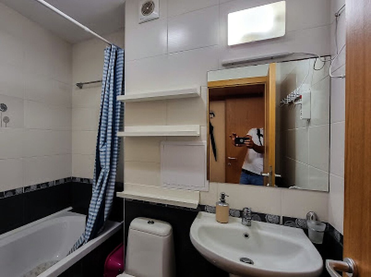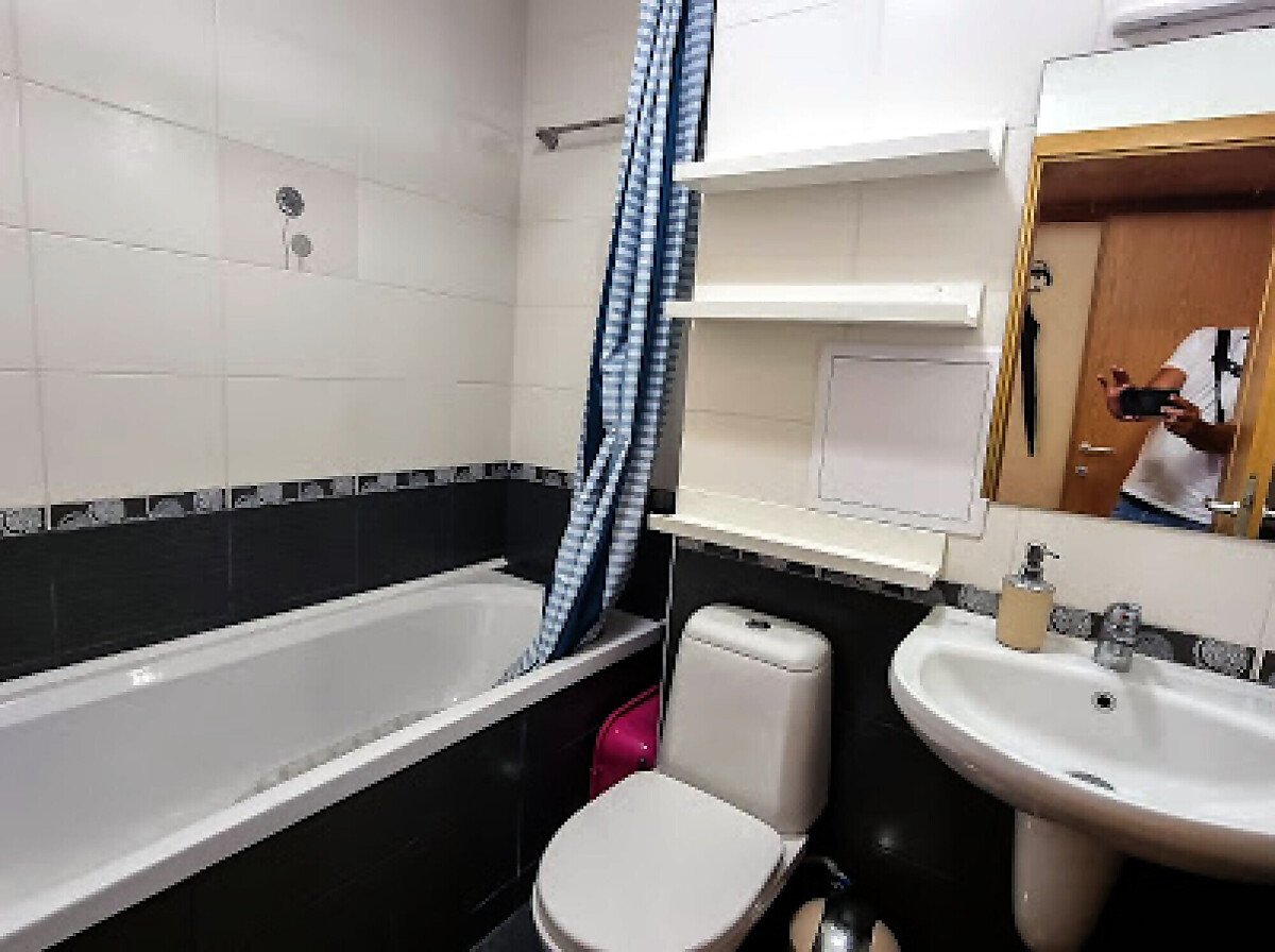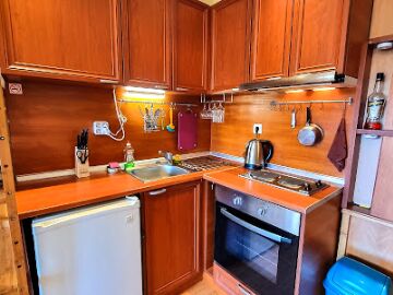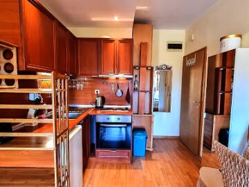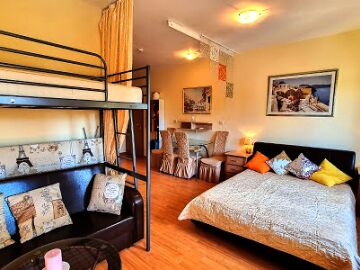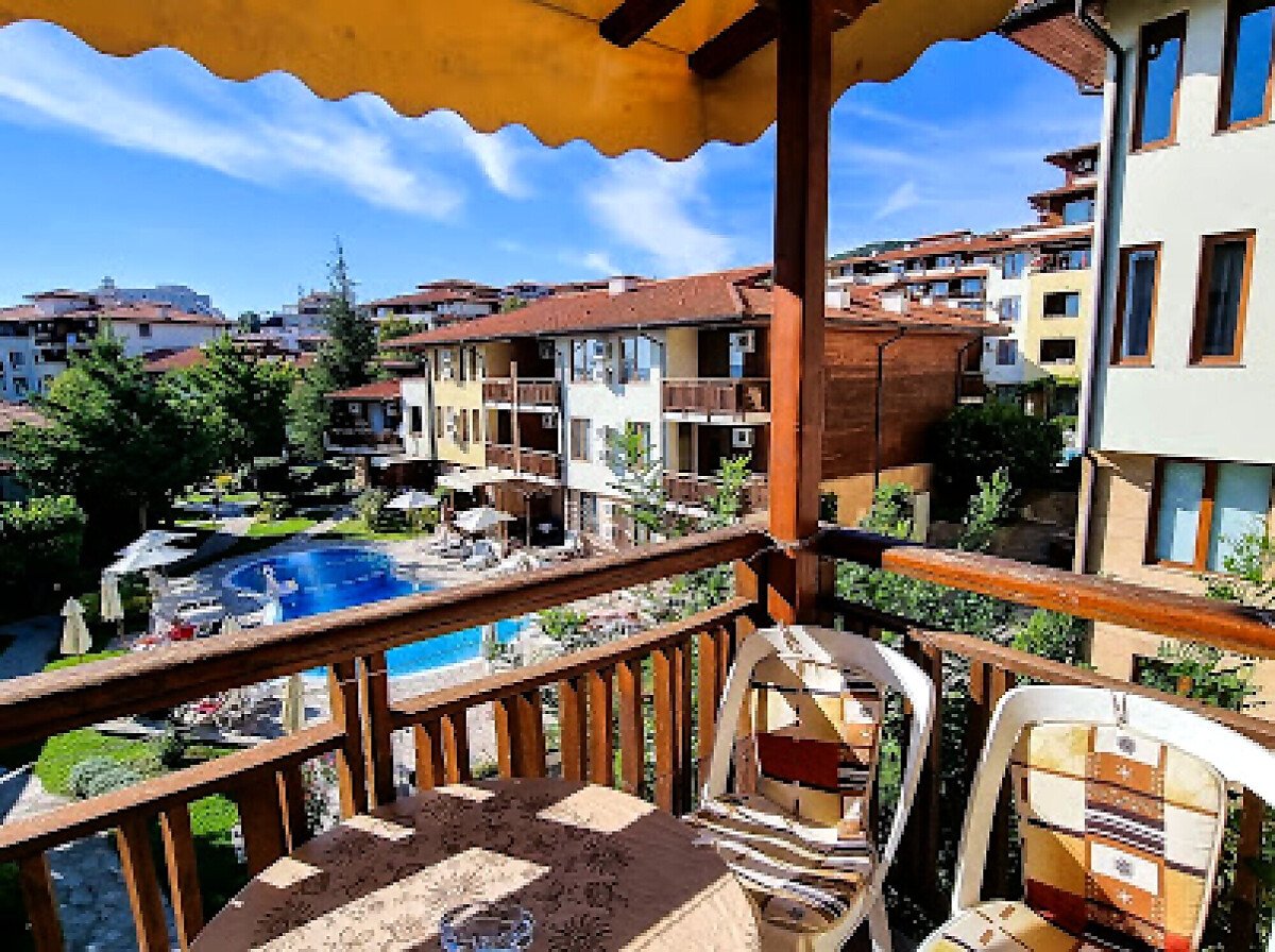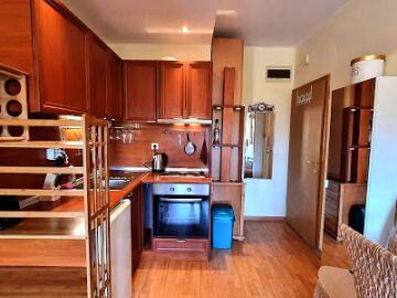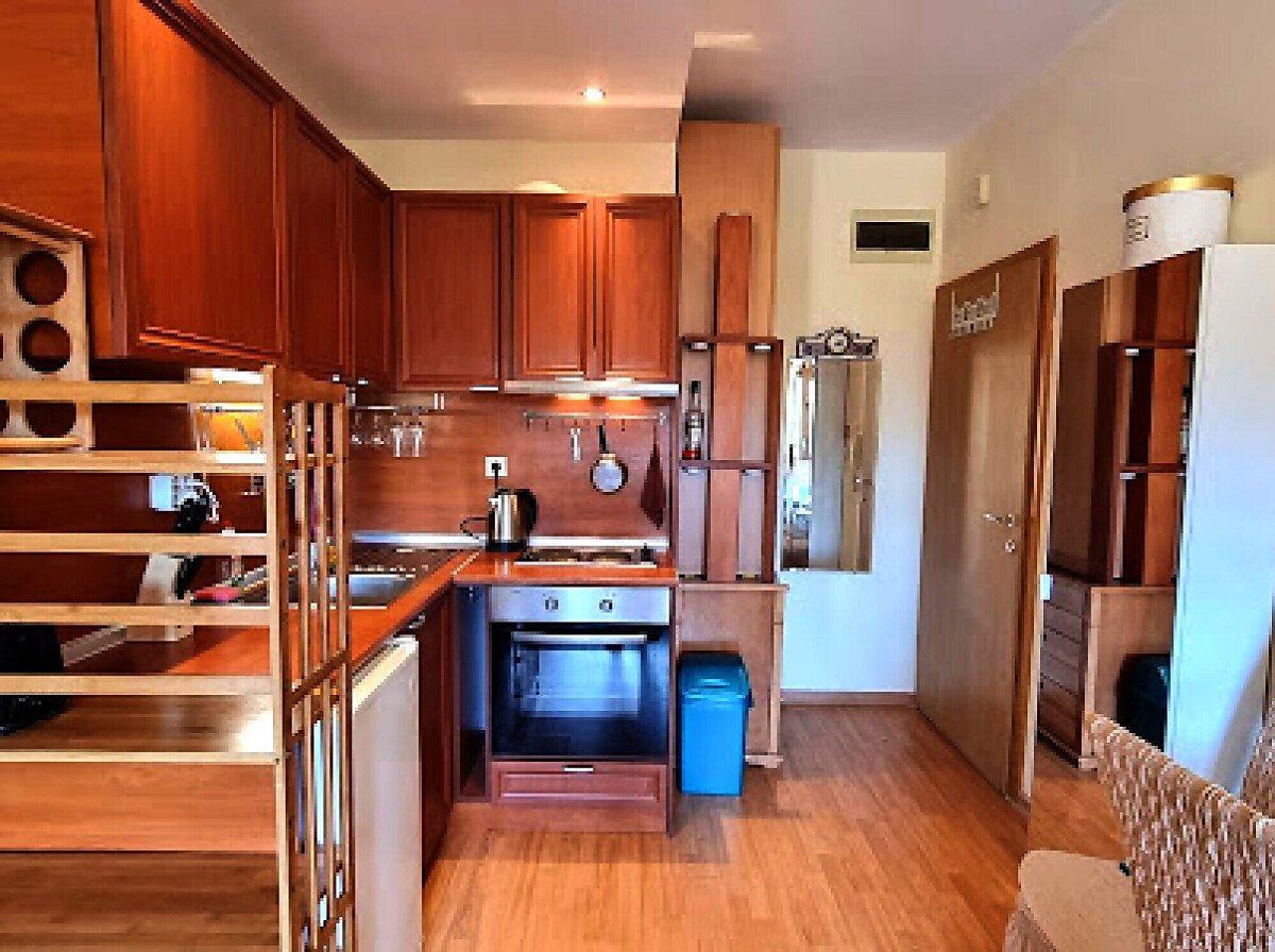 Студиото се намира на трети етаж и е с площ от 40кв.м., състои се от огромна всекидневна с кухненски блок, баня и тераса с гледка към басейн и море.