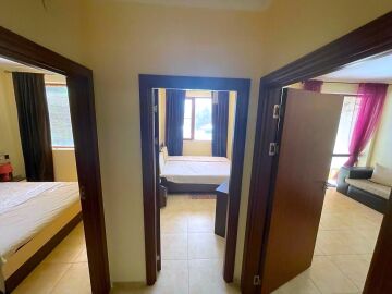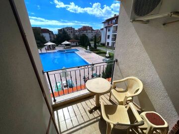 Апартаментът се намира на втори етаж и е с площ от 78кв.м., състои се от входно антре, всекидневна с кухненски блок, две спални, две бани и тераса с гледка към басейн.