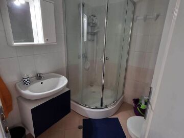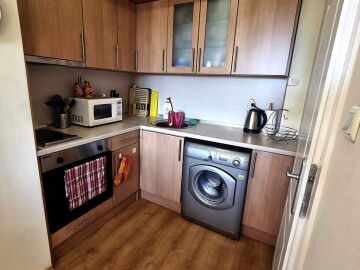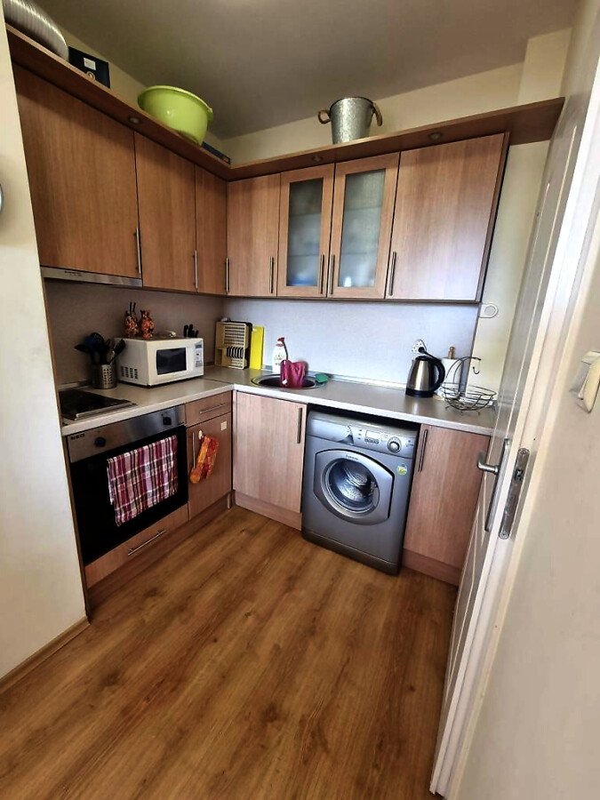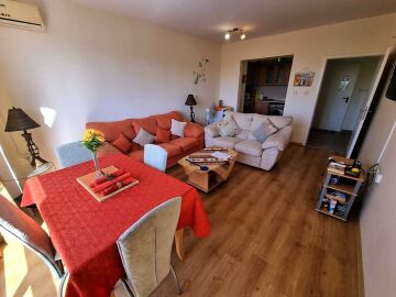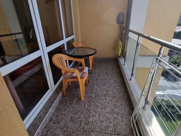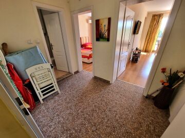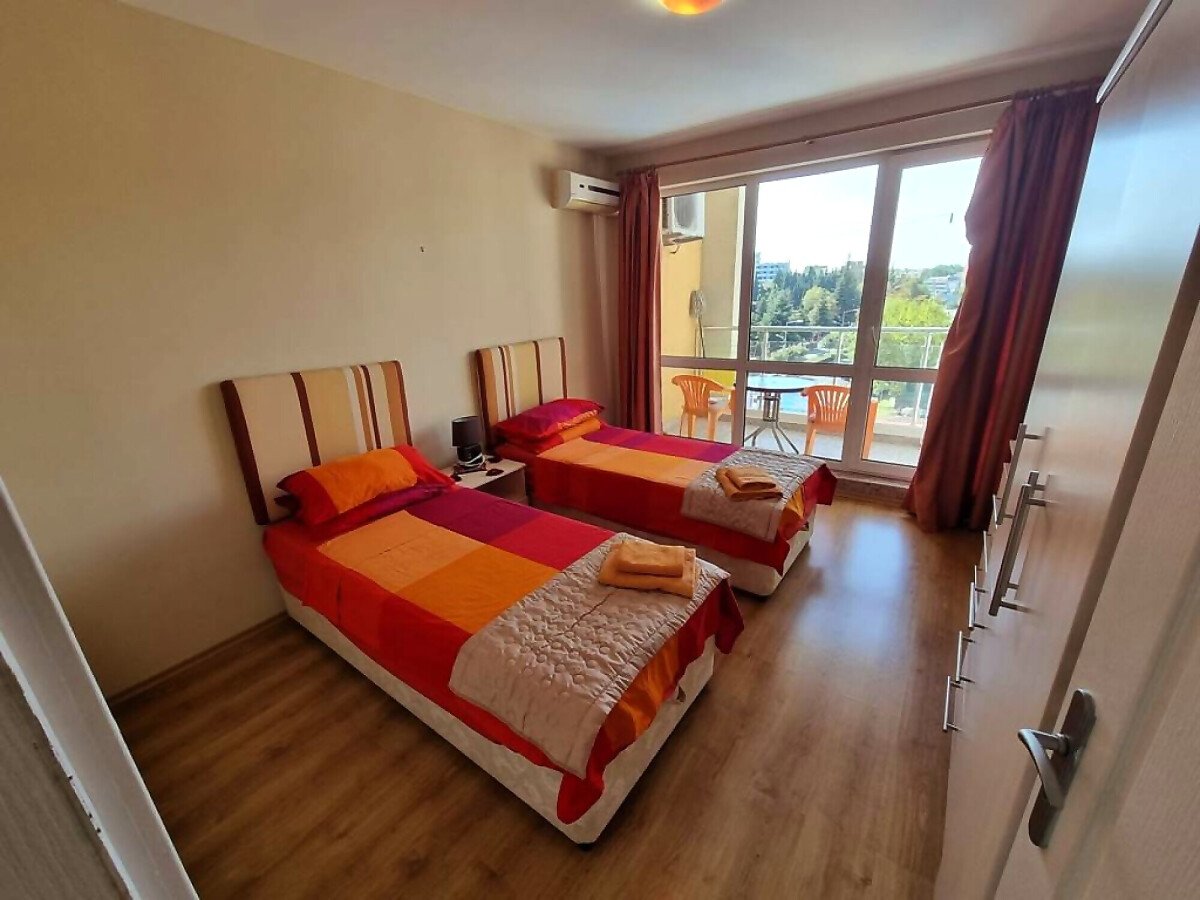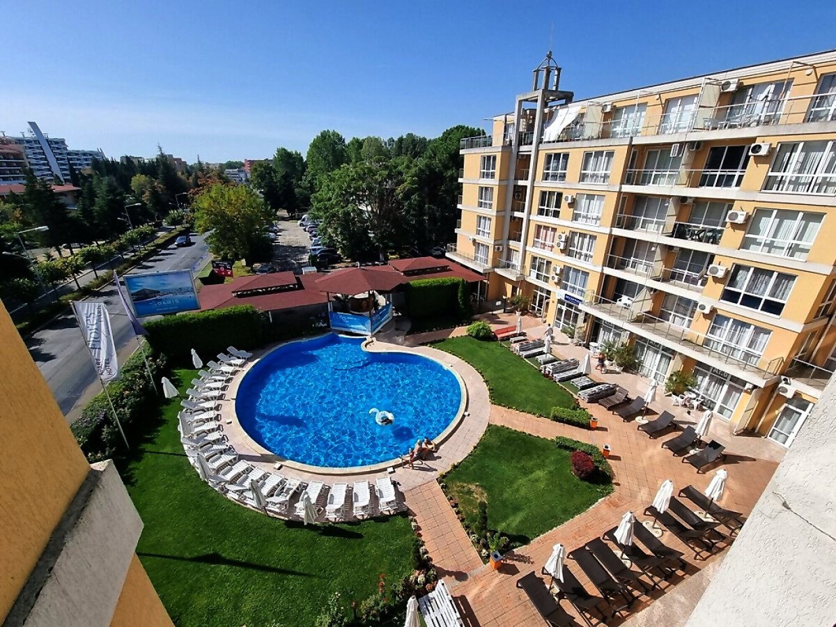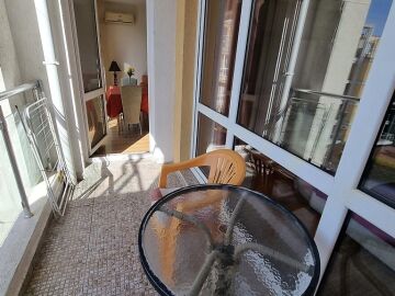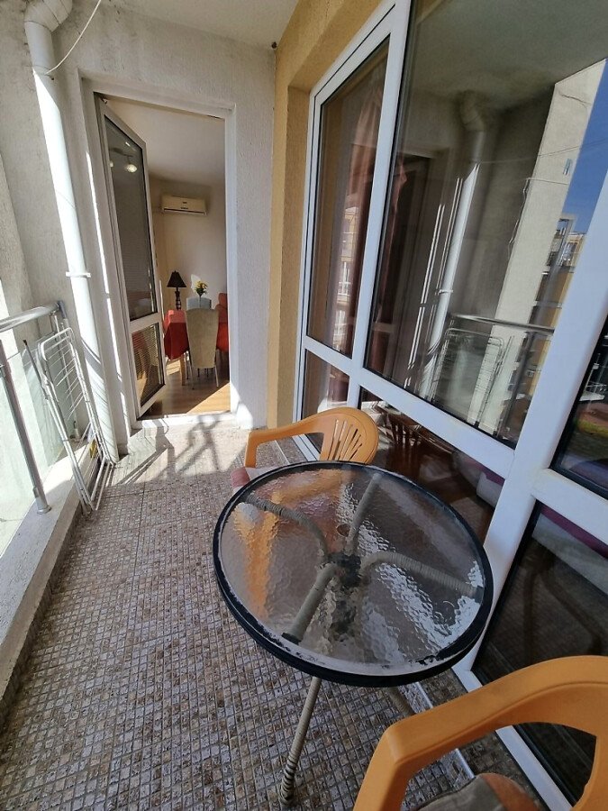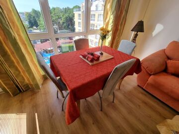 Апартаментът се намира на шести етаж и е с площ от 80кв.м., състои се от входно антре, всекидневна с кухненски блок, спалня, баня и тераса с гледка към басейн.