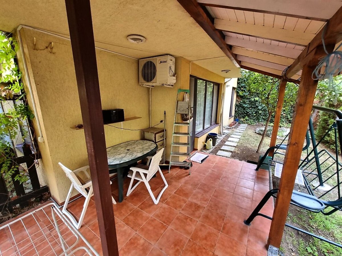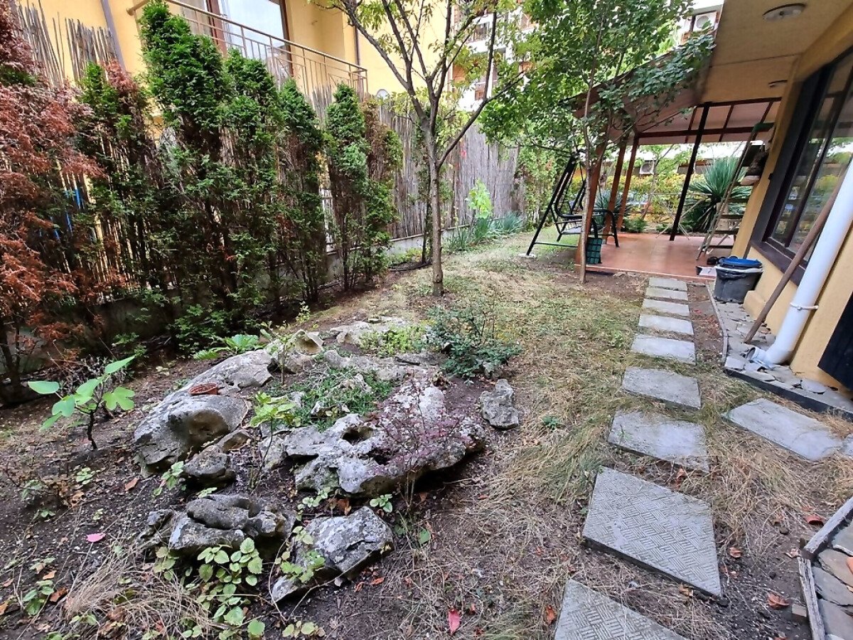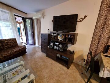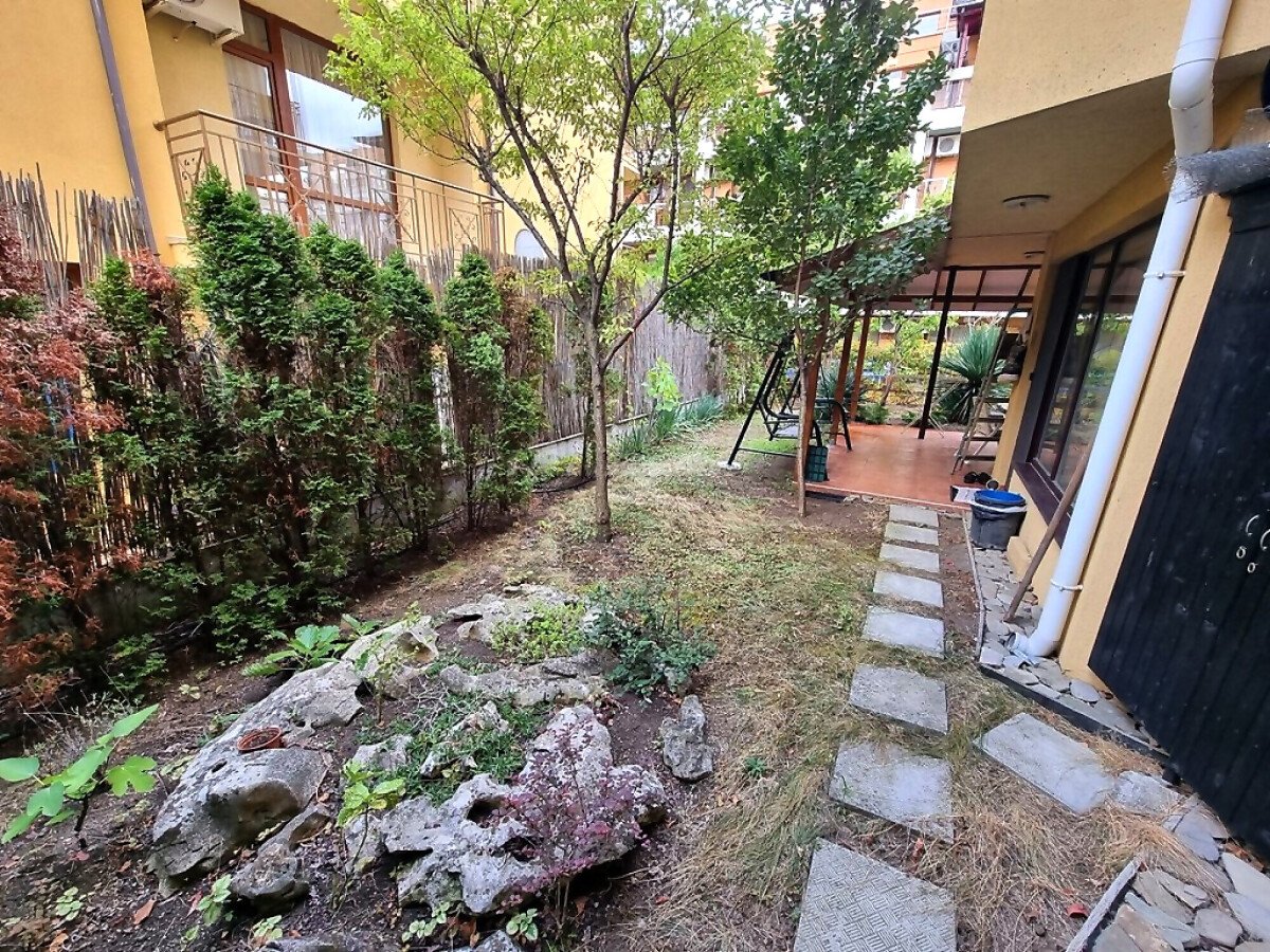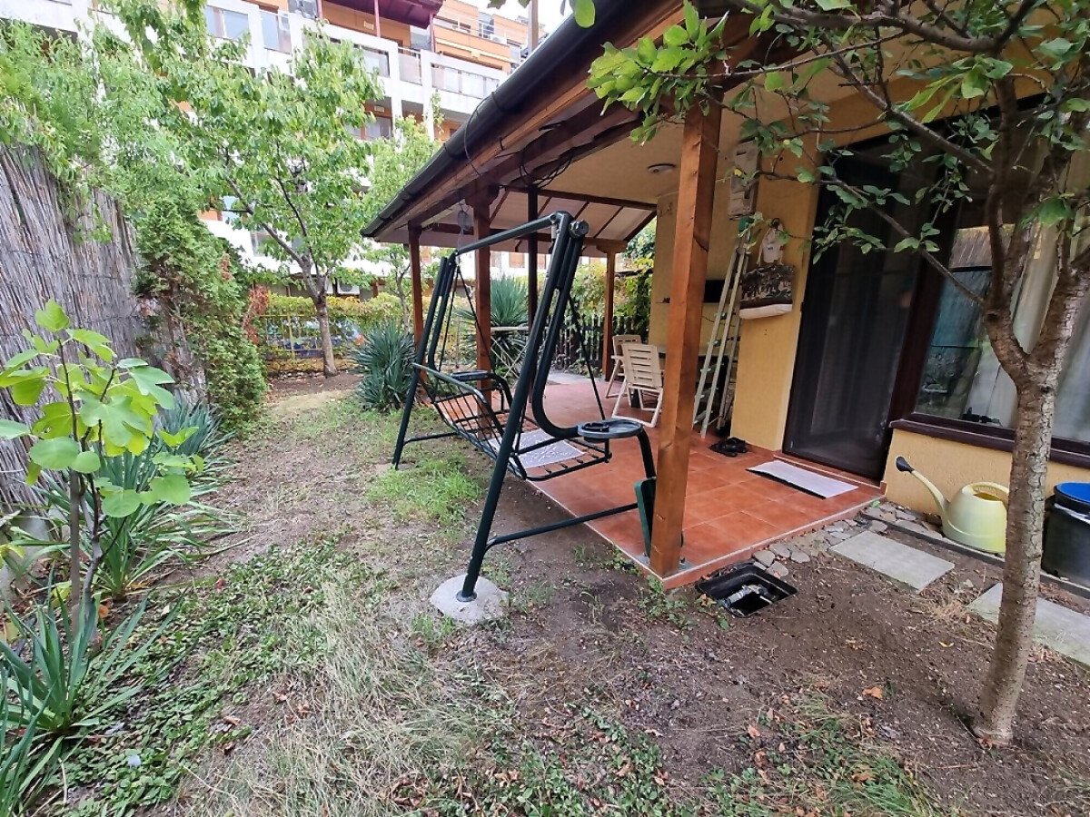 Апартаментът се намира на партер и е с площ от 65кв.м., състои се от входно антре, всекидневна с кухненски блок, спалня, баня и теоаса с гледка към двора.