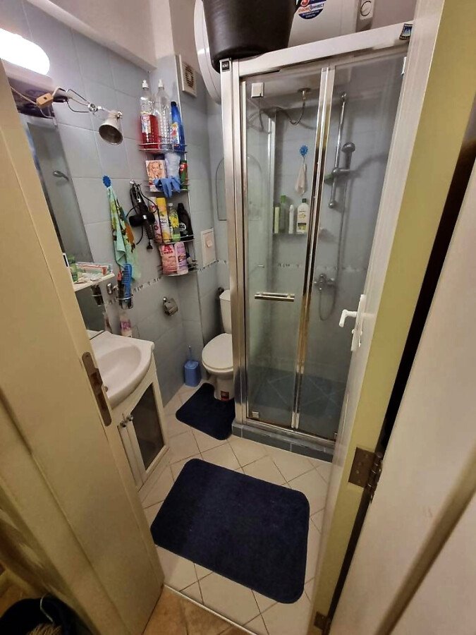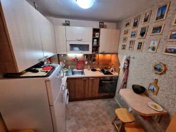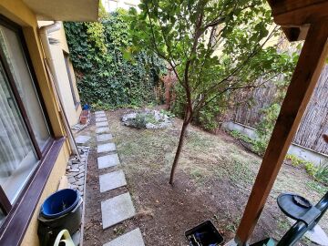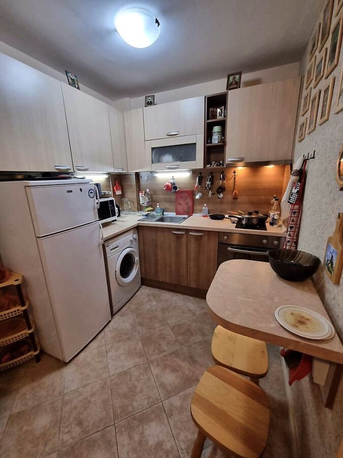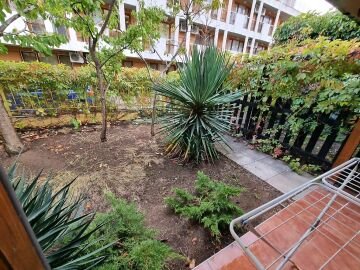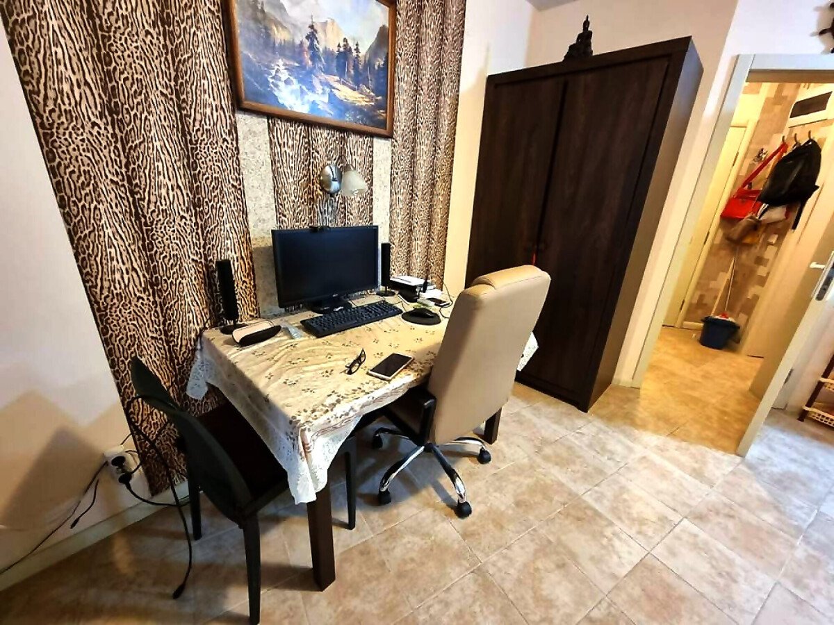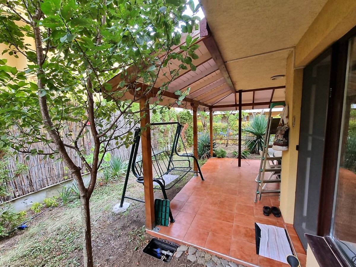 Апартаментът се намира на партер и е с площ от 65кв.м., състои се от входно антре, всекидневна с кухненски блок, спалня, баня и теоаса с гледка към двора.