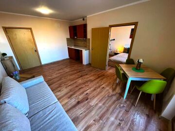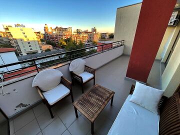 Апартаментът се намира на шести етаж и е с площ от 62кв.м., състои се от всекидневна с кухненски блок, спалня, баня и тераса с гледка към двора.