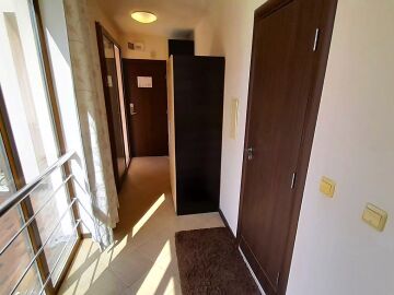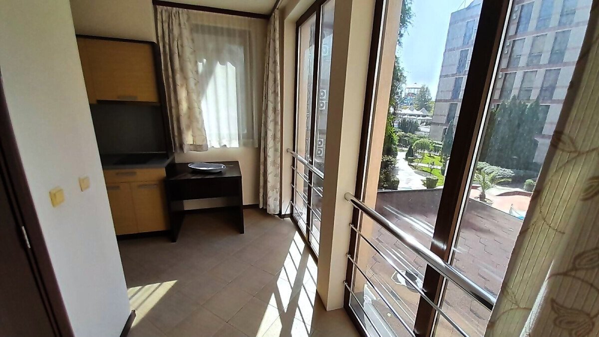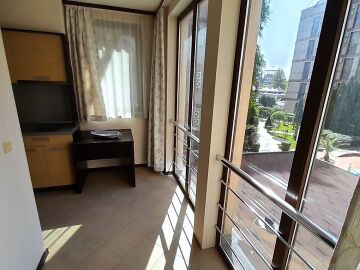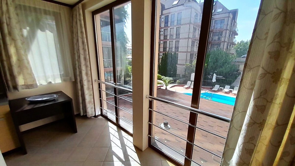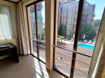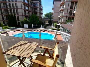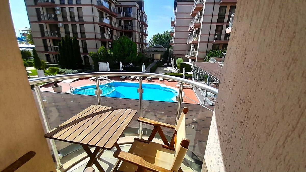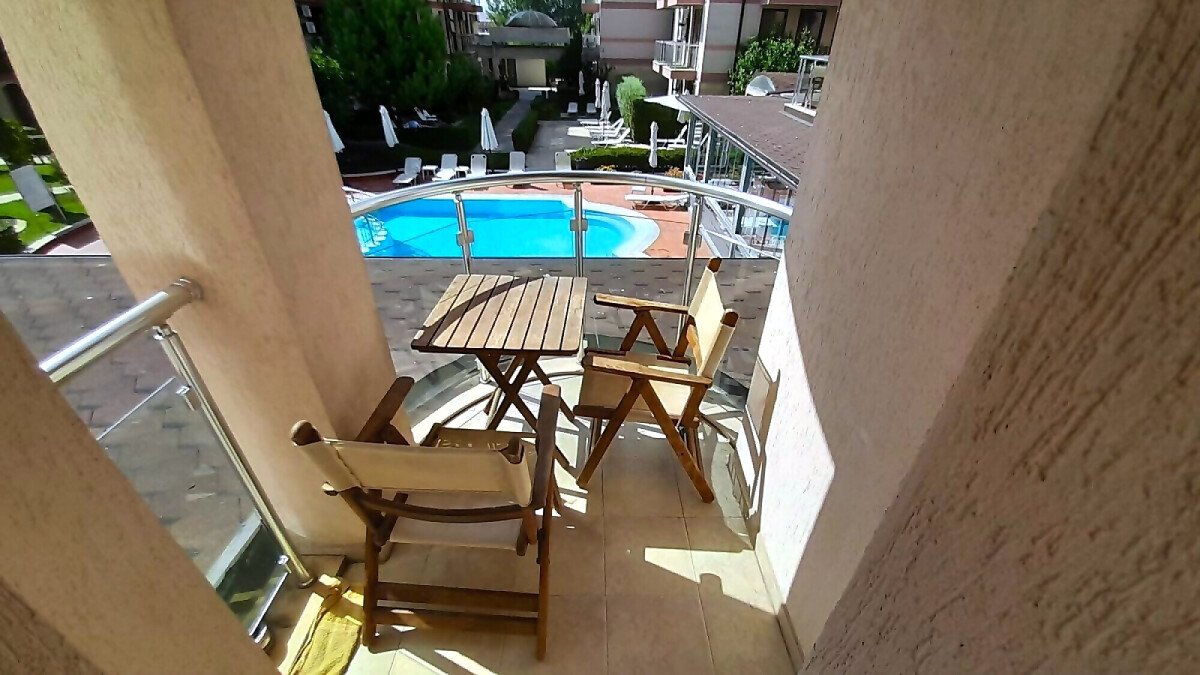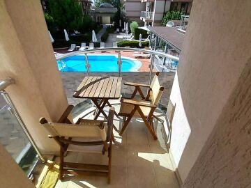 Апартаментът се намира на втори етаж и е с площ от 64кв.м., състои се от голямо входно антре, всекидневна с кухненски блок, спалня, баня и две тераси с гледка към басейн.