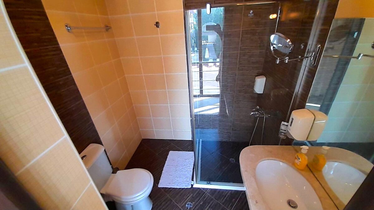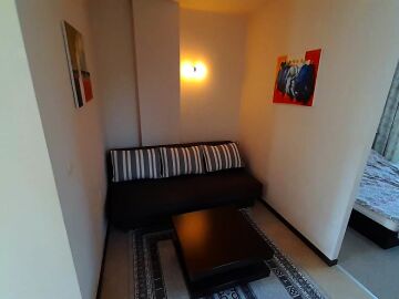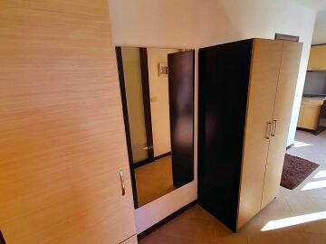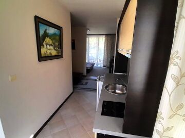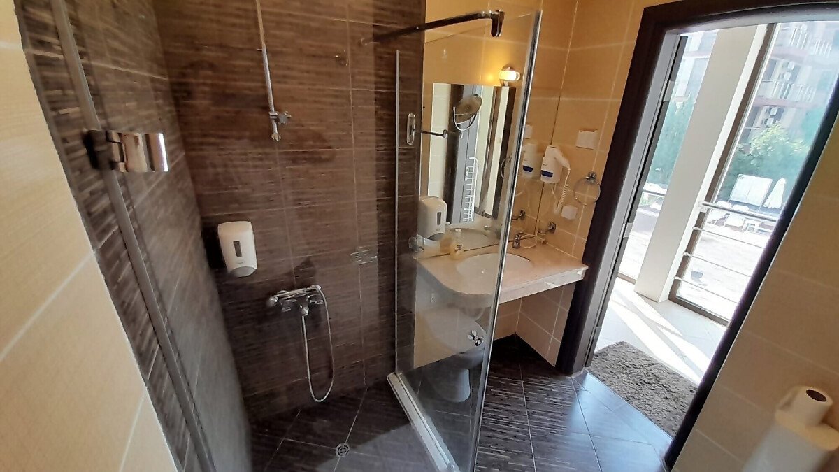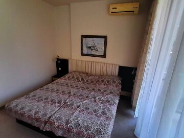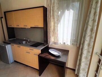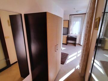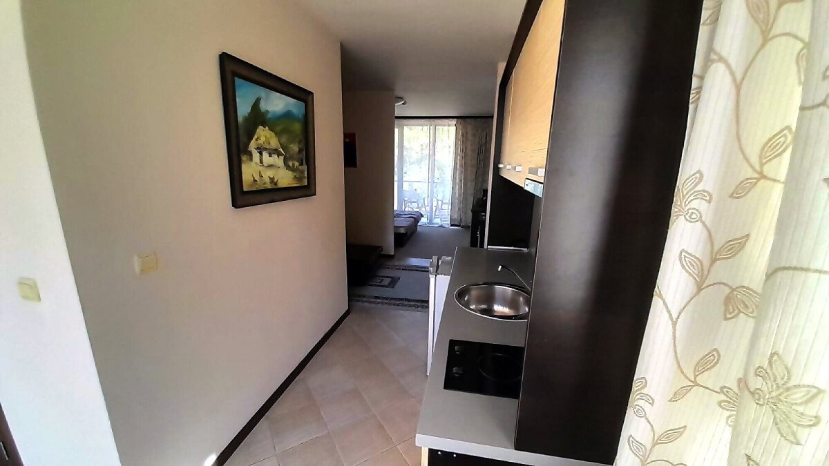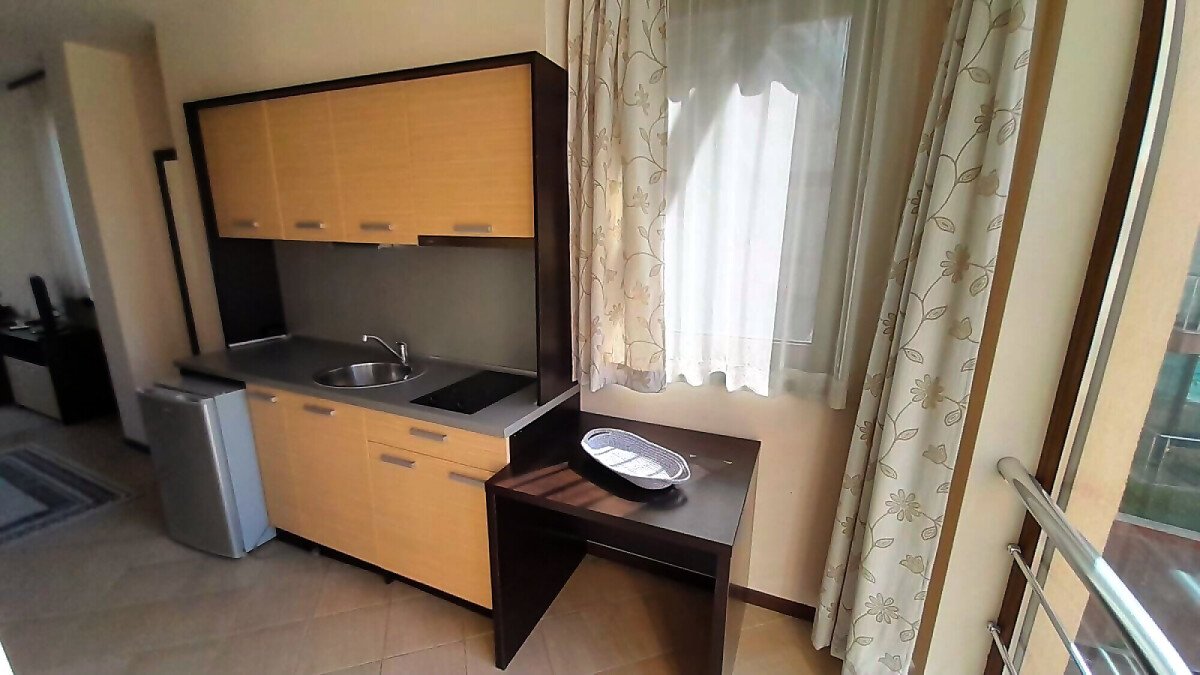 Апартаментът се намира на втори етаж и е с площ от 64кв.м., състои се от голямо входно антре, всекидневна с кухненски блок, спалня, баня и две тераси с гледка към басейн.