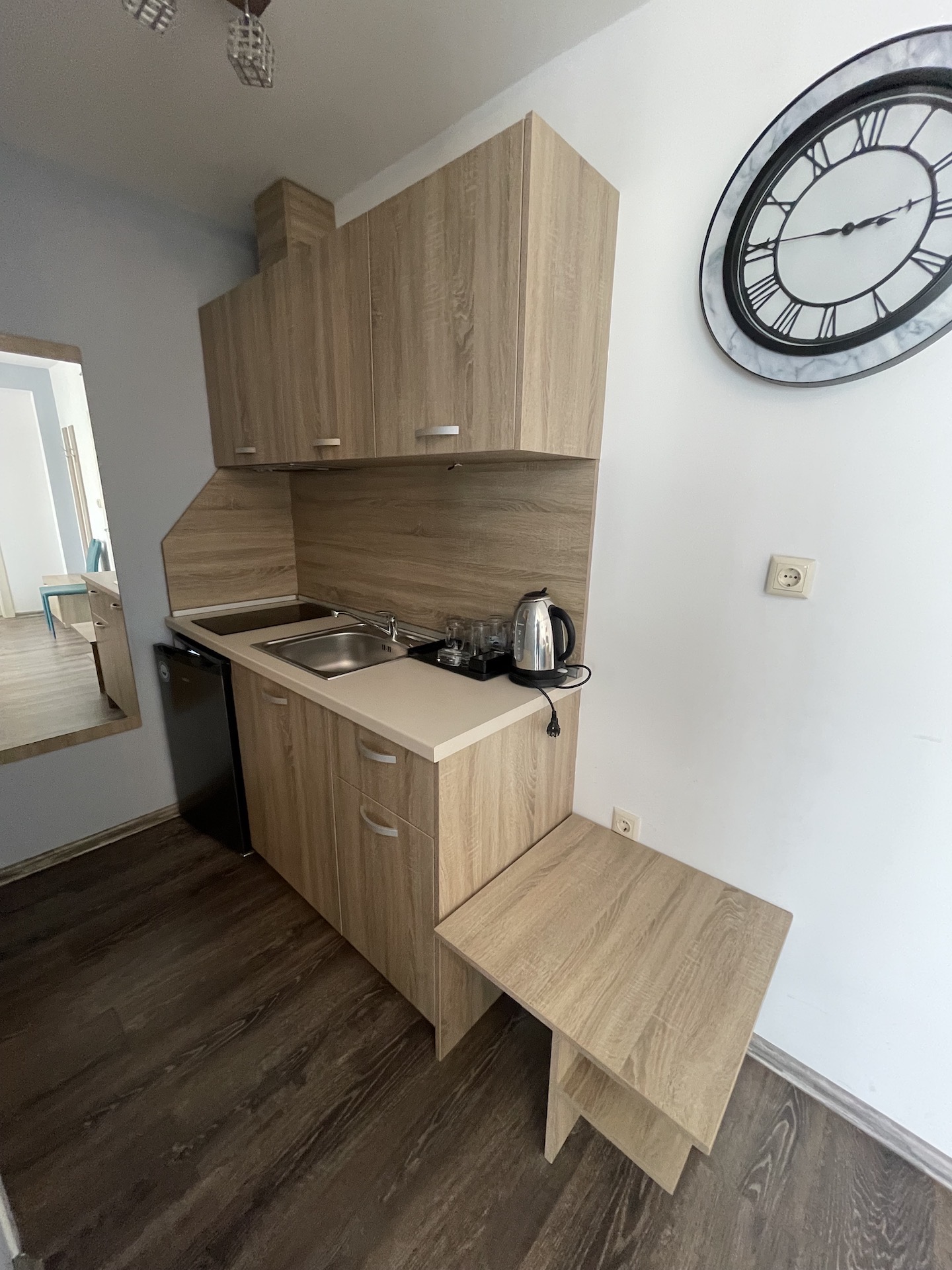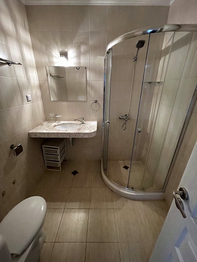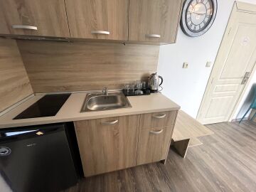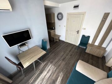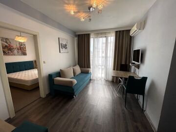 Апартаментът се намира на шести етаж и е с площ от 55кв.м., състои се от голямо входно антре, всекидневна с кухненски блок, спалня, баня и тераса с гледка към двора.