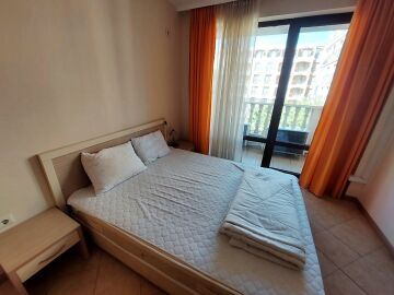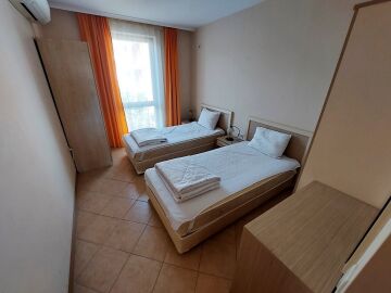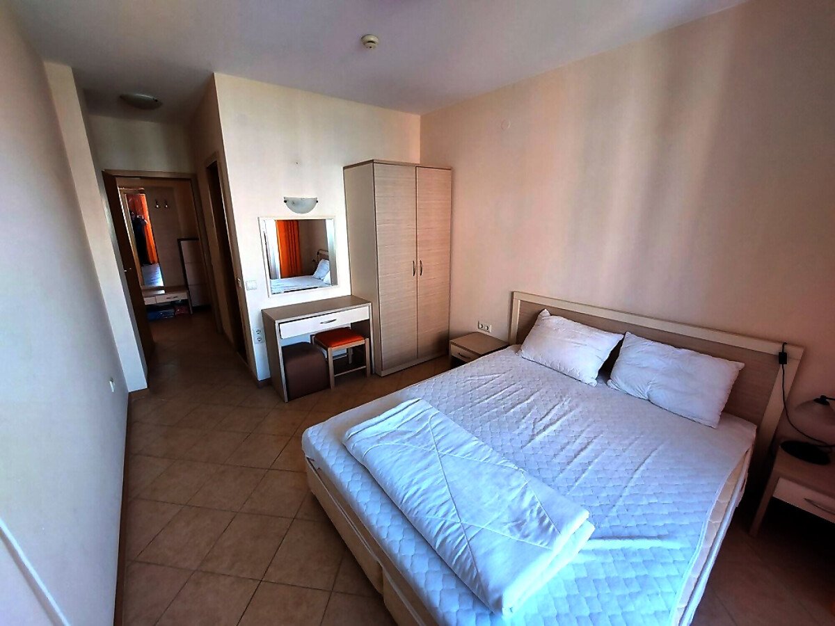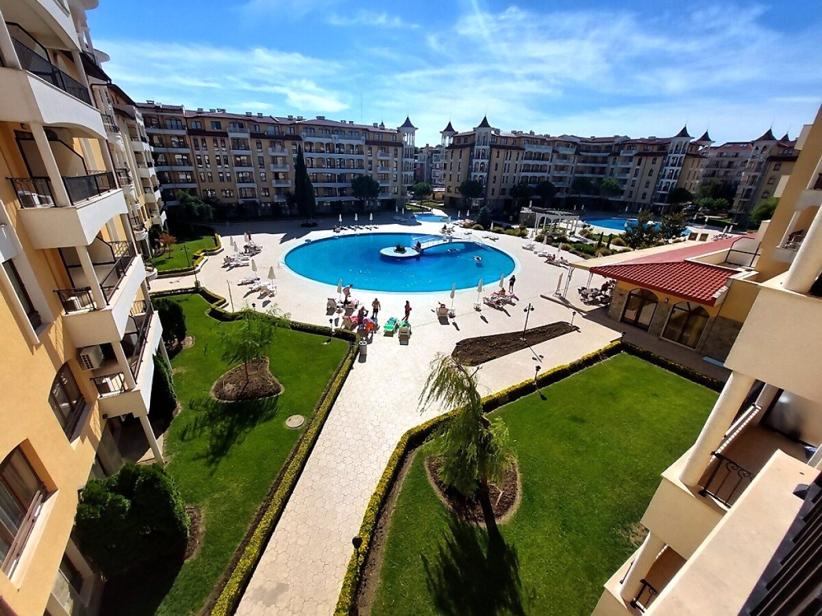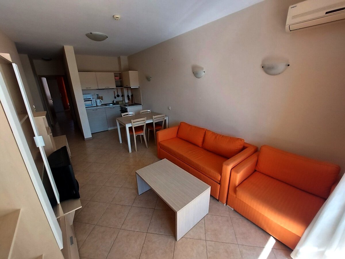 Апартаментът се намира на 4 етаж и е с площ от 90кв.м., състои се от всекидневна с кухненски блок, две спални, баня и тераса с гледка към басейн.