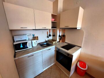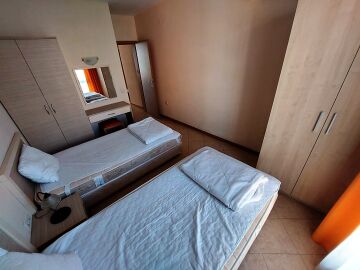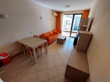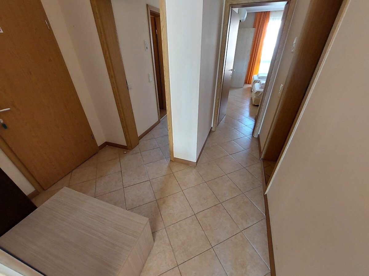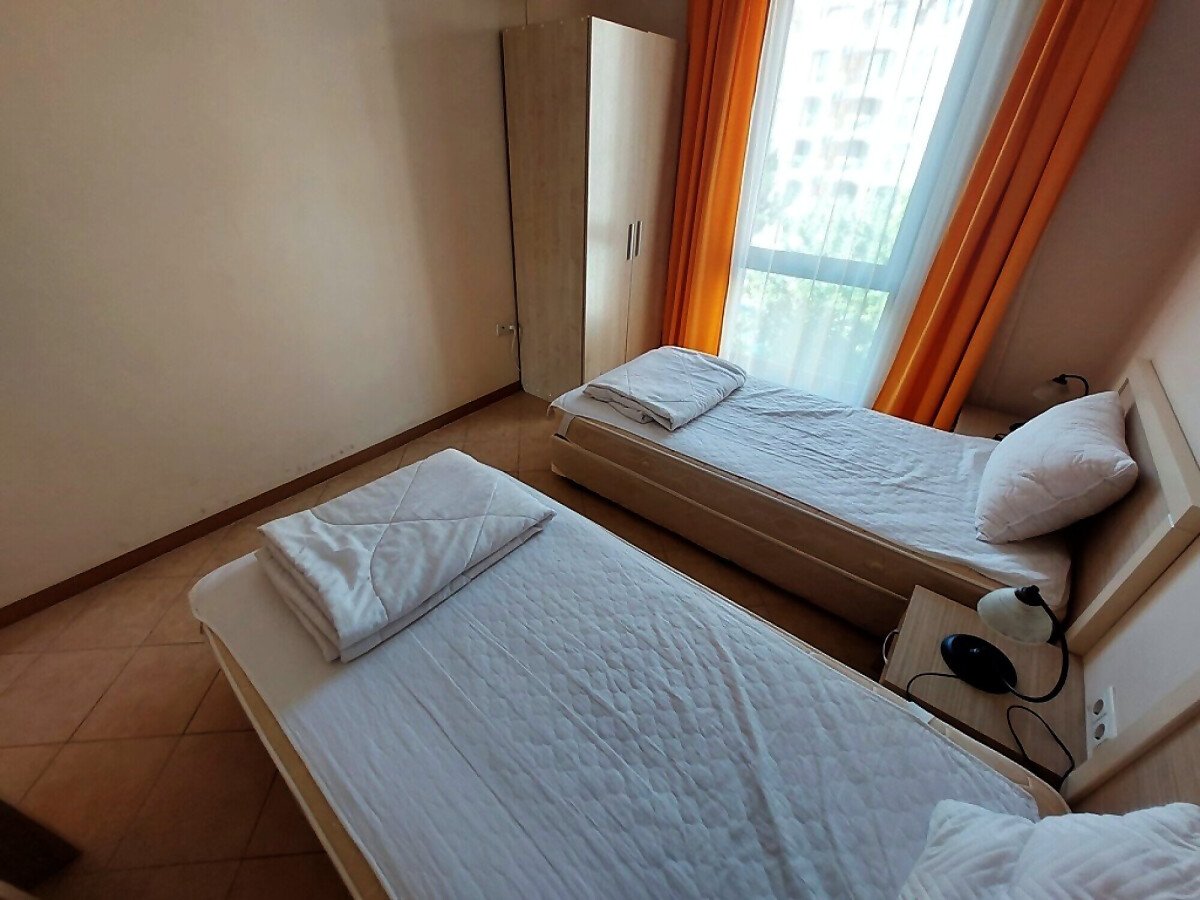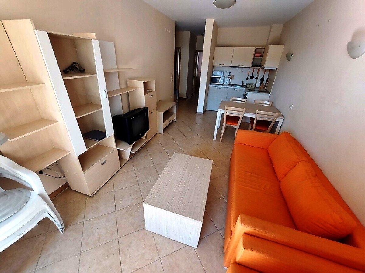 Апартаментът се намира на 4 етаж и е с площ от 90кв.м., състои се от всекидневна с кухненски блок, две спални, баня и тераса с гледка към басейн.