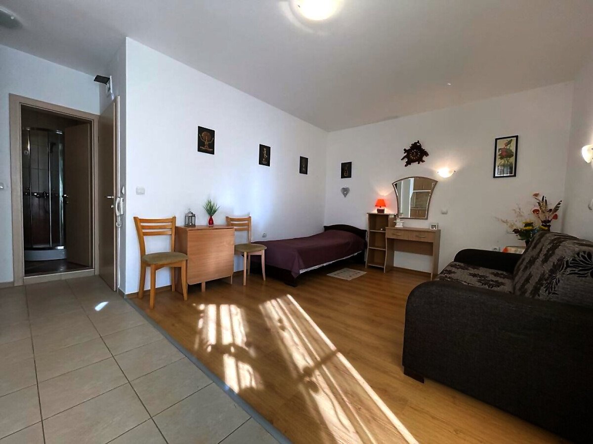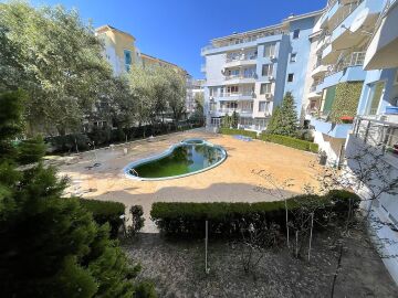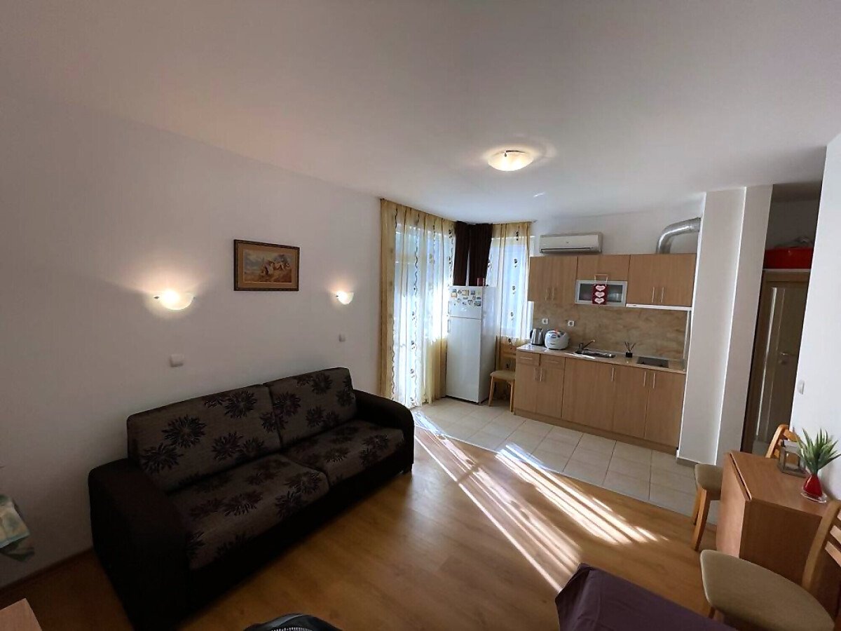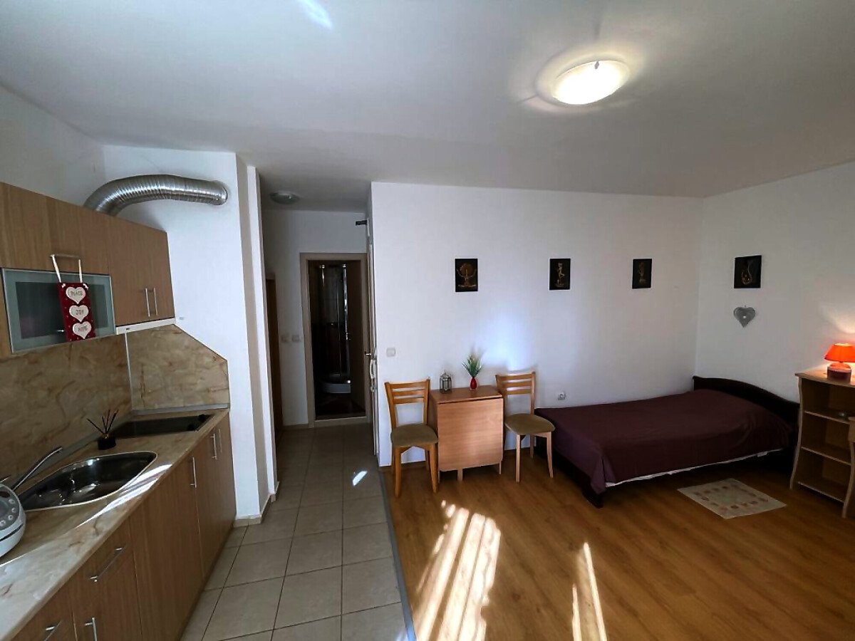 Апартаментът е напълно обзаведен и оборудван с необходимите електроуреди, готов за нанасяне. Състои се от малък коридор, просторна всекидневна с кухненски бокс, баня с тоалетна и тераса с гледка към вътрешния двор и басейна на комплекса.