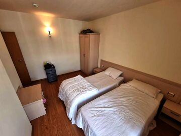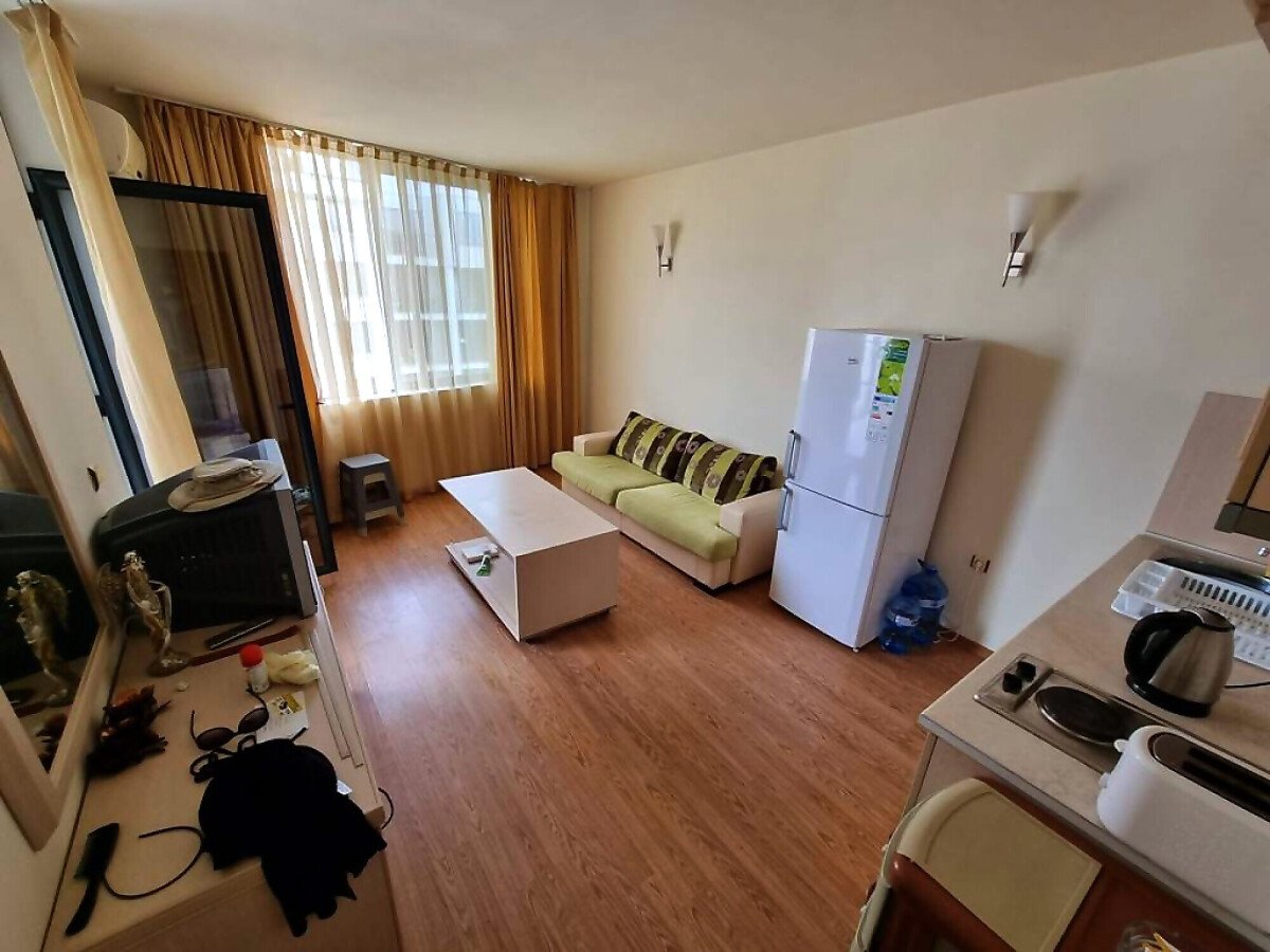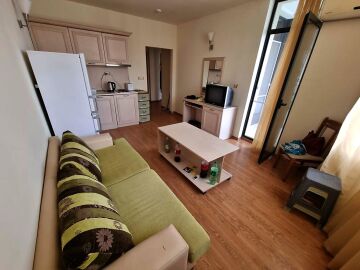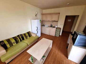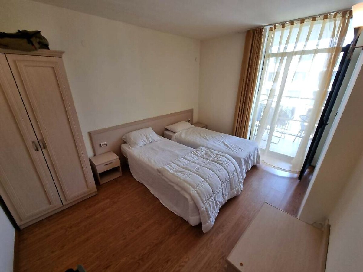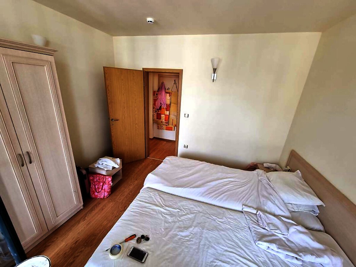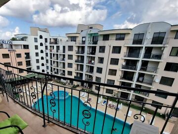 Апартаментът е уютен, светъл и просторен. Състои се от малък коридор, всекидневна с кухненски бокс, две спални, баня с тоалетна и голяма тераса с гледка към басейна. Жилището е напълно обзаведено и оборудвано с необходимите електроуреди, готово за нанасяне.