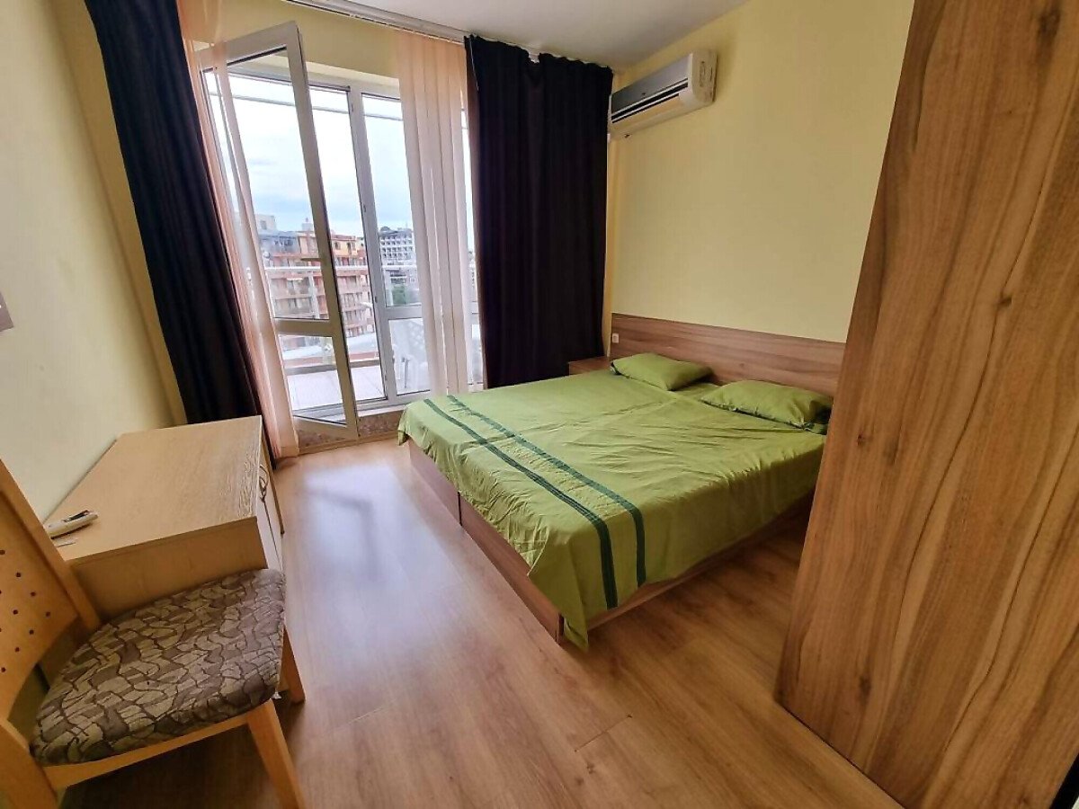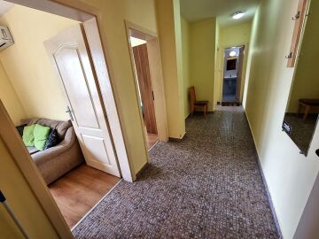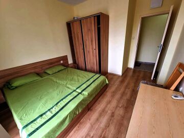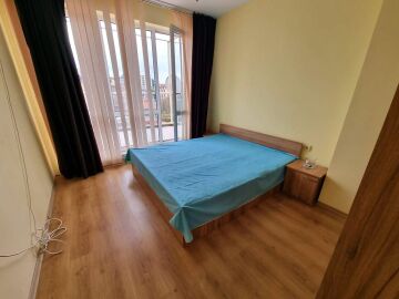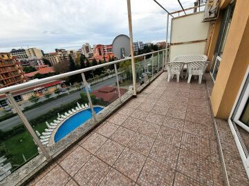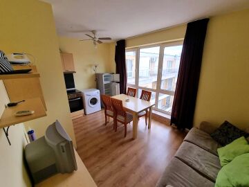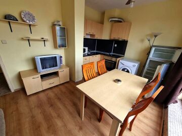 Апартаментът е в отлично състояние, напълно обзаведен и оборудван с всички необходими електроуреди, готов за нанасяне. Състои се от коридор, всекидневна с кухненски бокс и кът за хранене, две спални, баня с тоалетна и тераса с гледка към басейна и вътрешната част на комплекса.