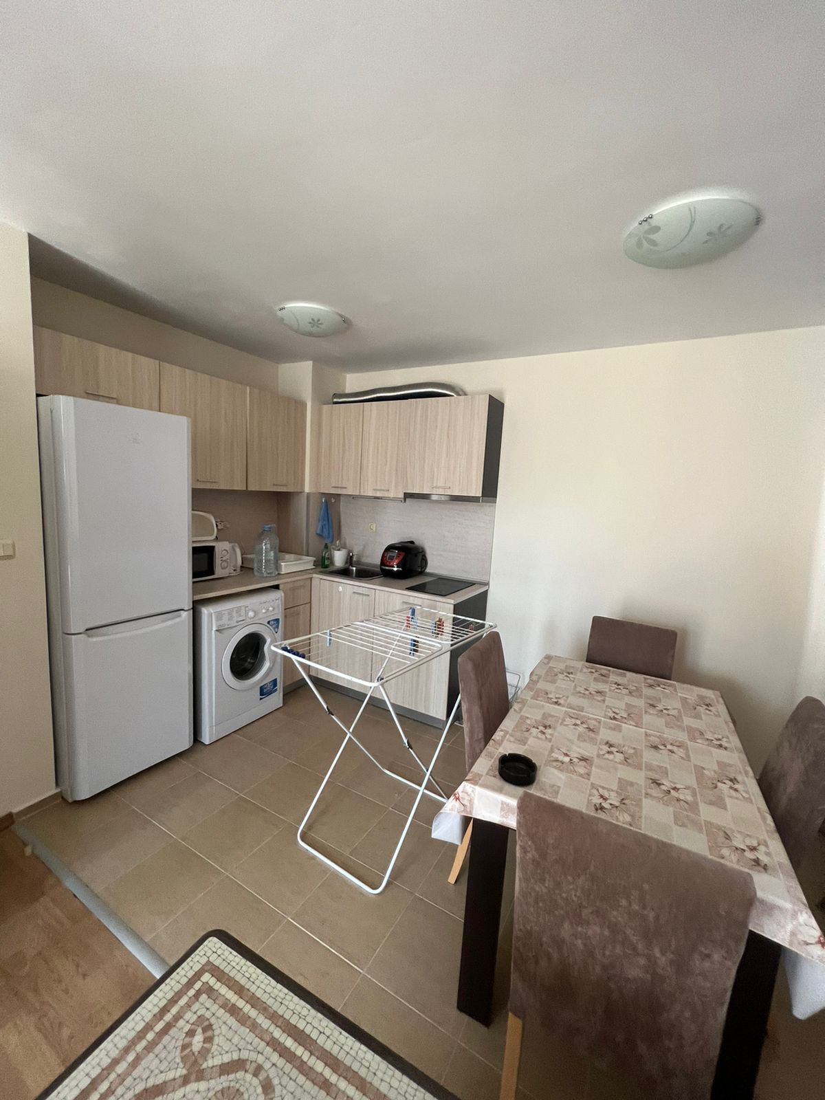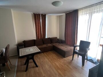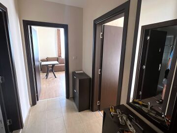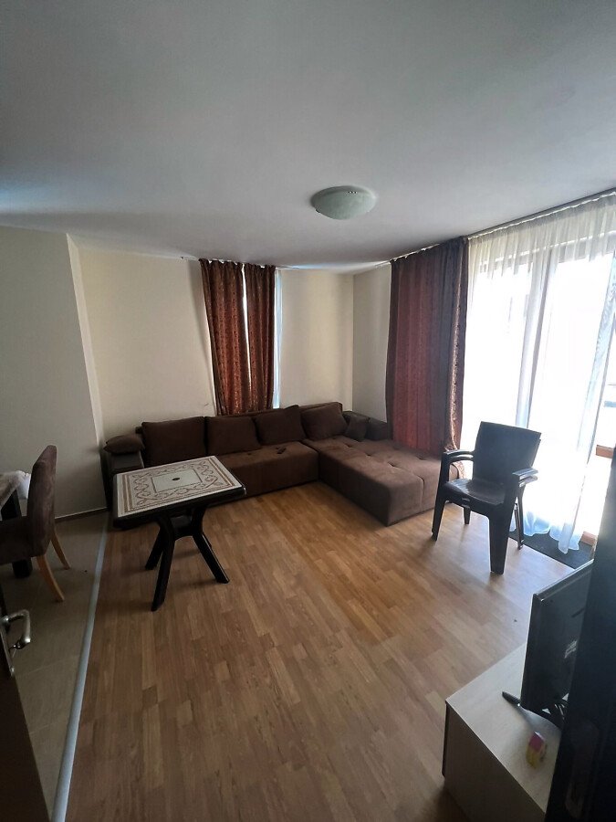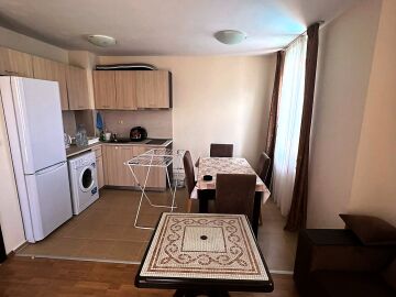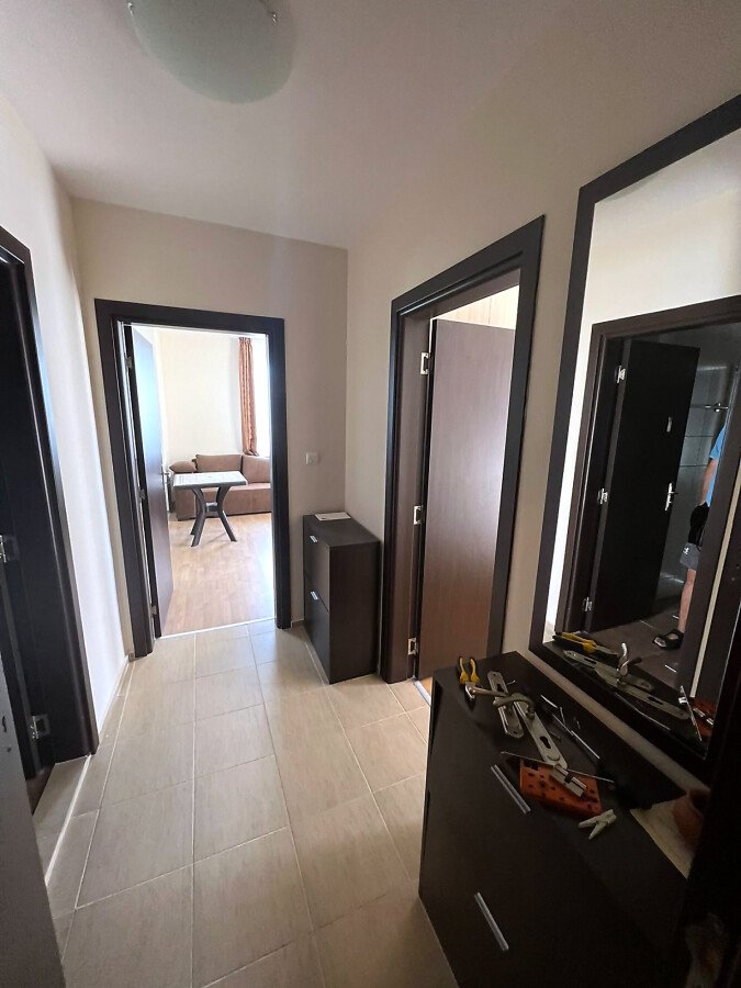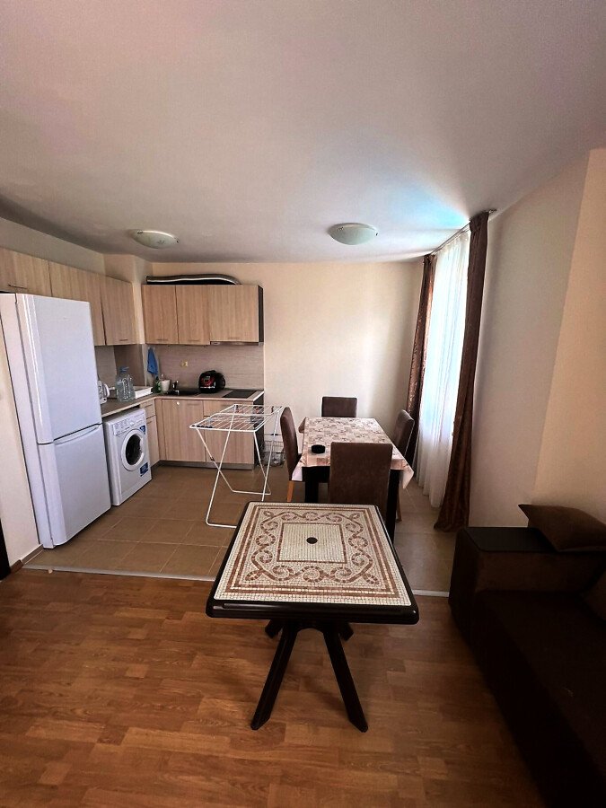 Апартаментът е готов за нанасяне, напълно обзаведен и оборудван с електроуреди, в много добро състояние. Състои се от входно антре, просторна всекидневна с кухненски бокс и кът за хранене, спалня, баня с тоалетна и две тераси. Едната от терасите има изглед към басейна.