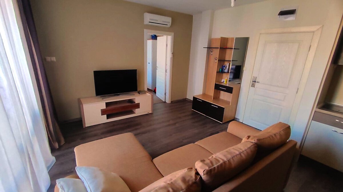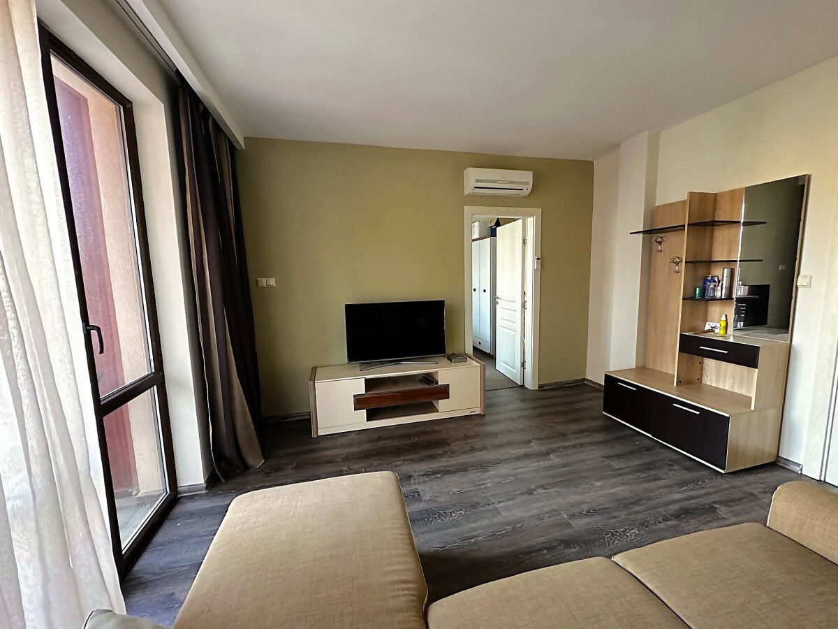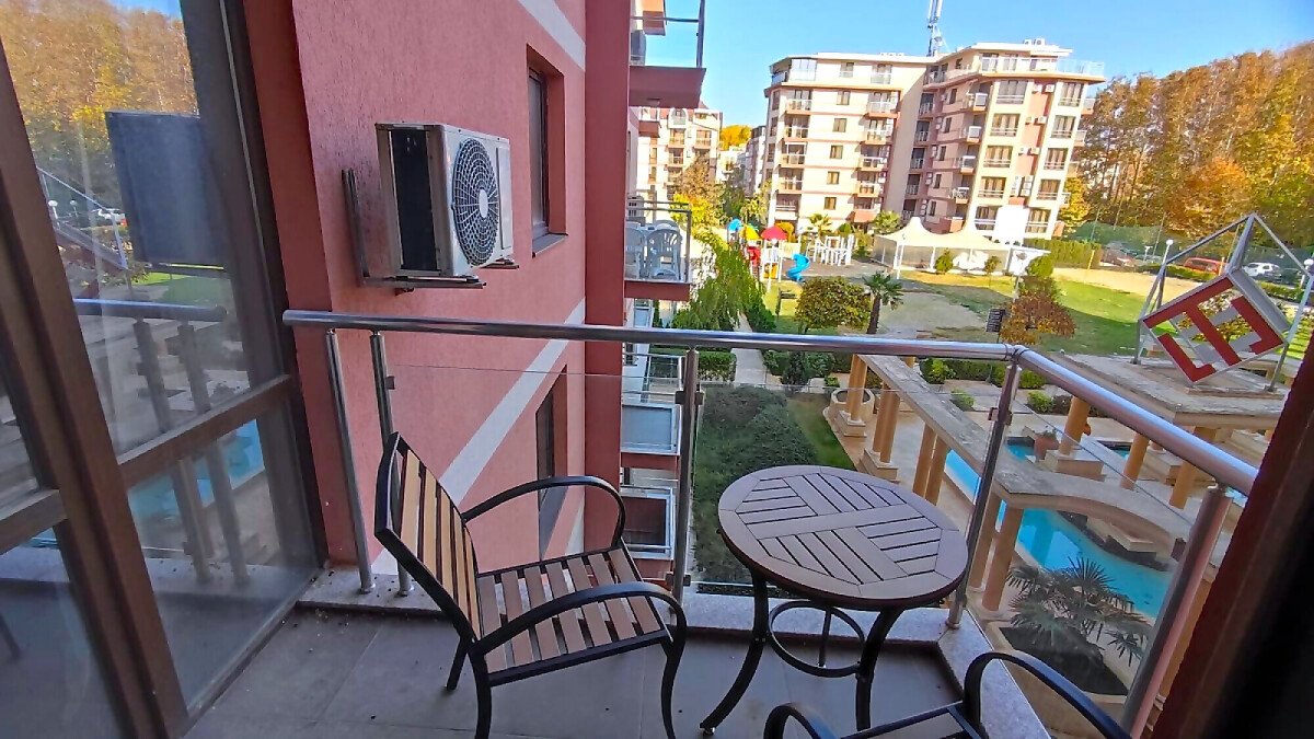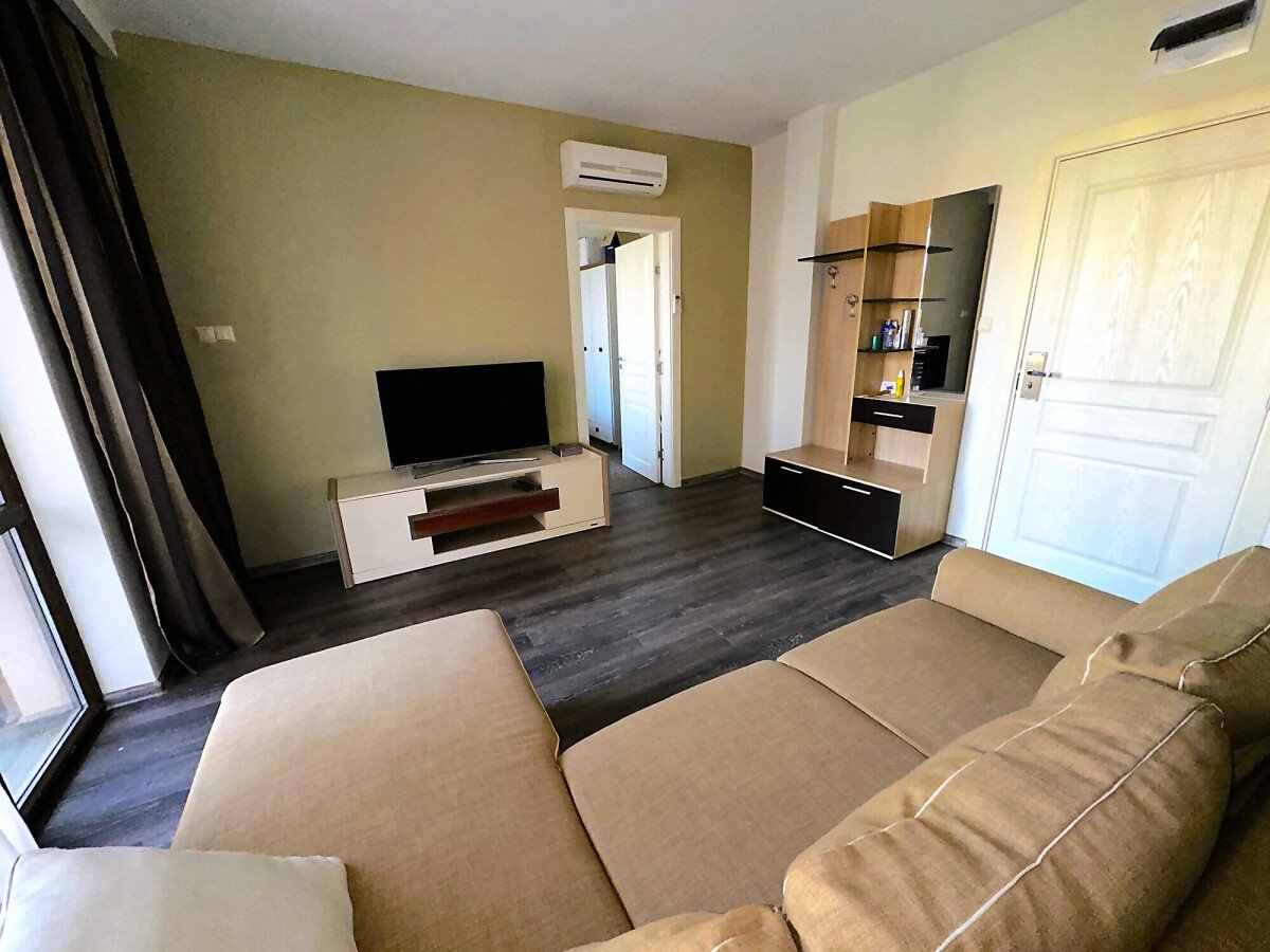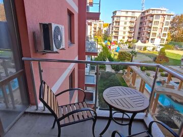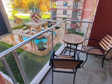 Апартаментът е в отлично състояние, обзаведен и оборудван с всички необходими електроуреди, готов за нанасяне. Състои се от всекидневна с кухненски бокс и кът за хранене, две спални, баня с тоалетна и душ кабина, тераса с изглед към басейна и вътрешната територия на комплекса.