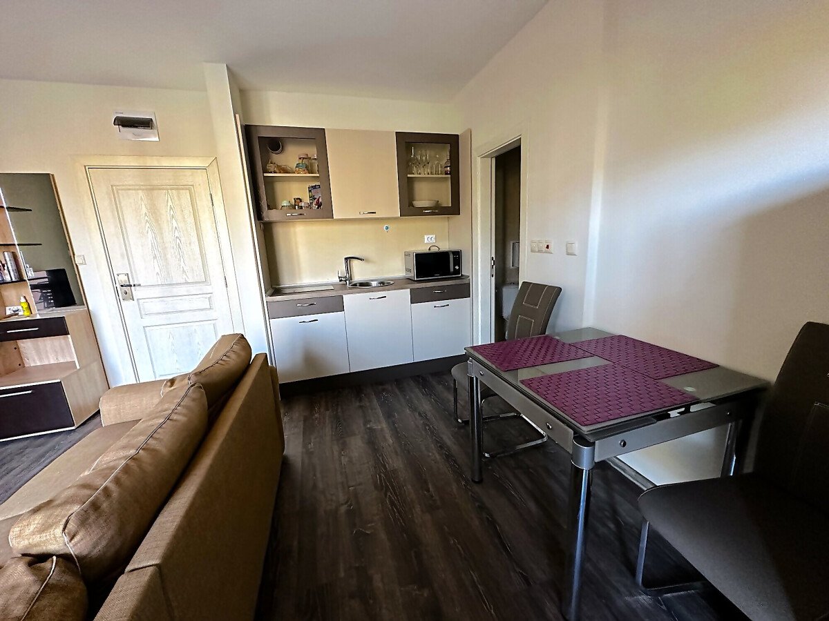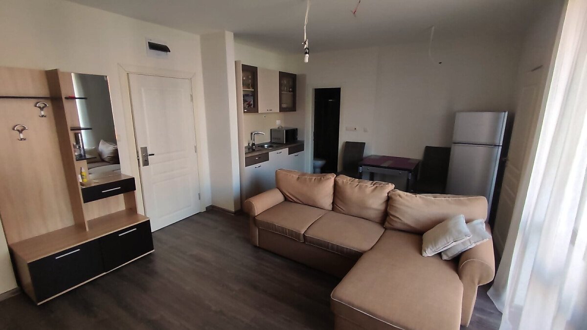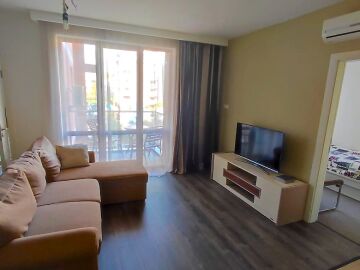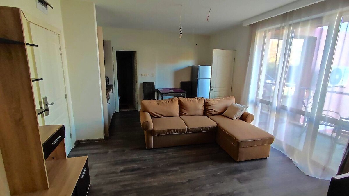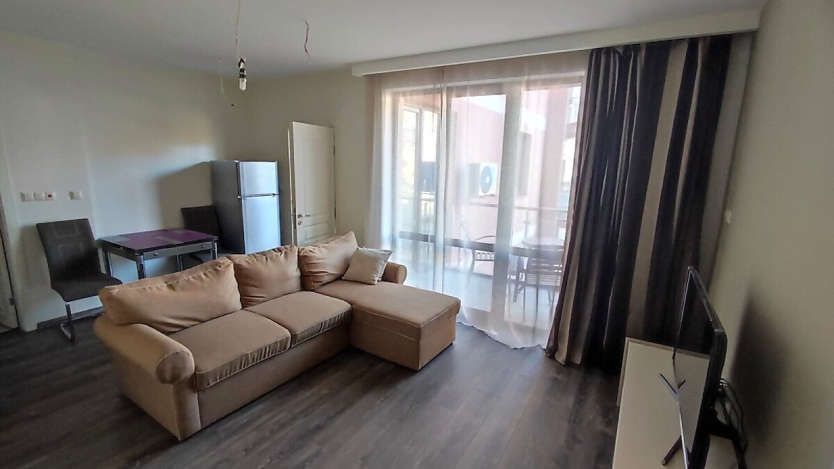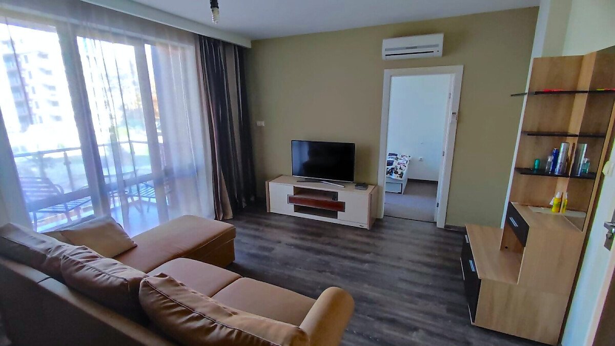 Апартаментът е в отлично състояние, обзаведен и оборудван с всички необходими електроуреди, готов за нанасяне. Състои се от всекидневна с кухненски бокс и кът за хранене, две спални, баня с тоалетна и душ кабина, тераса с изглед към басейна и вътрешната територия на комплекса.