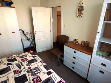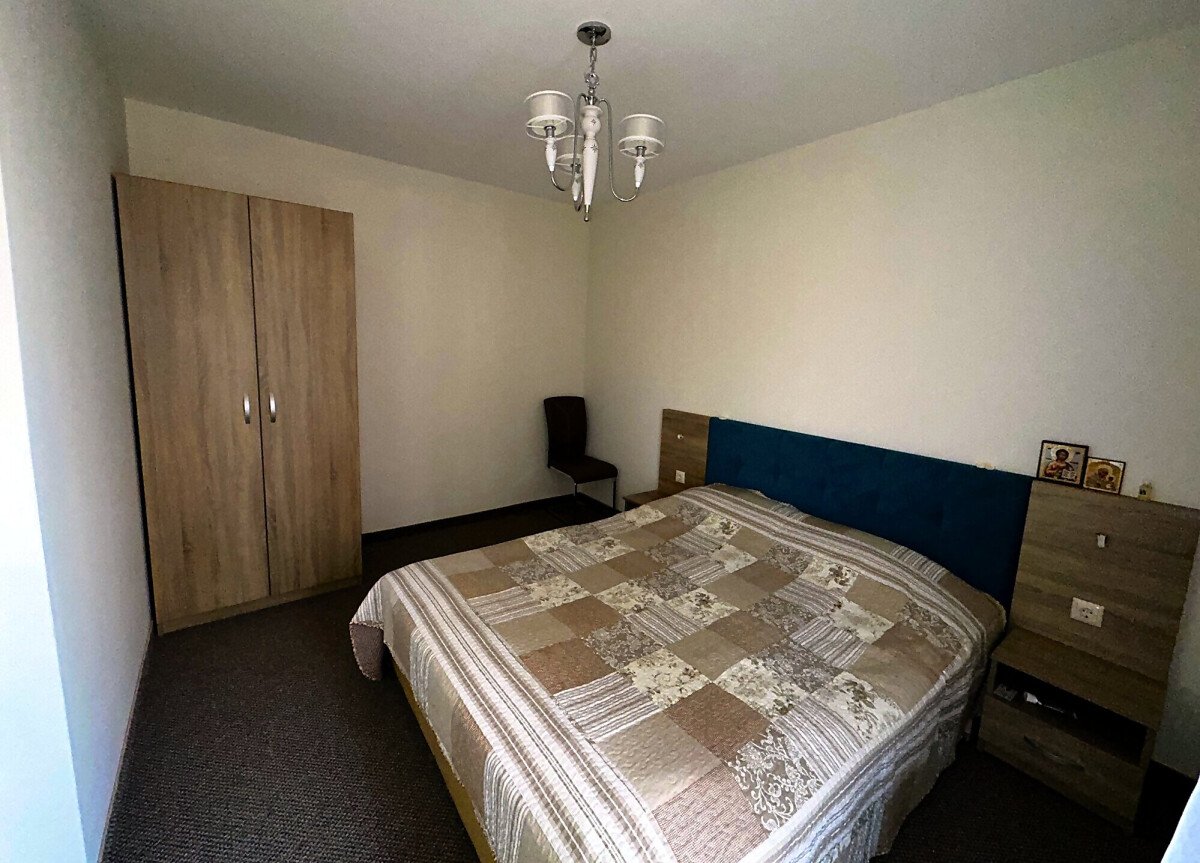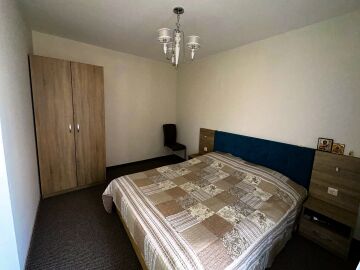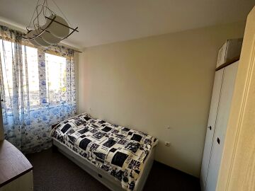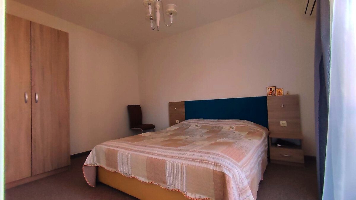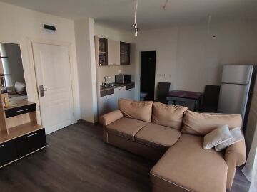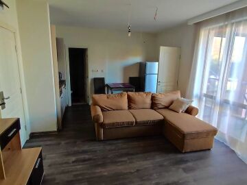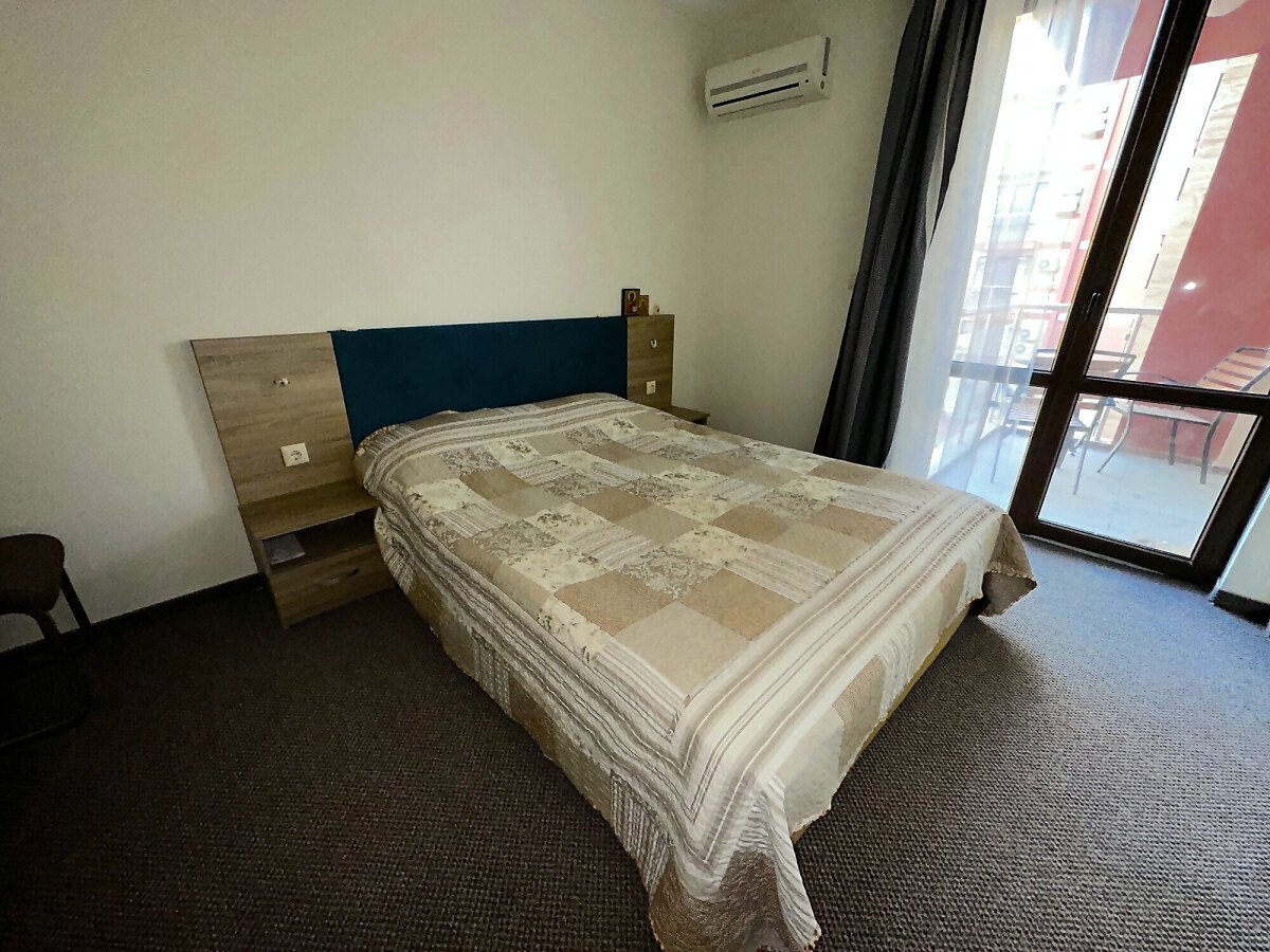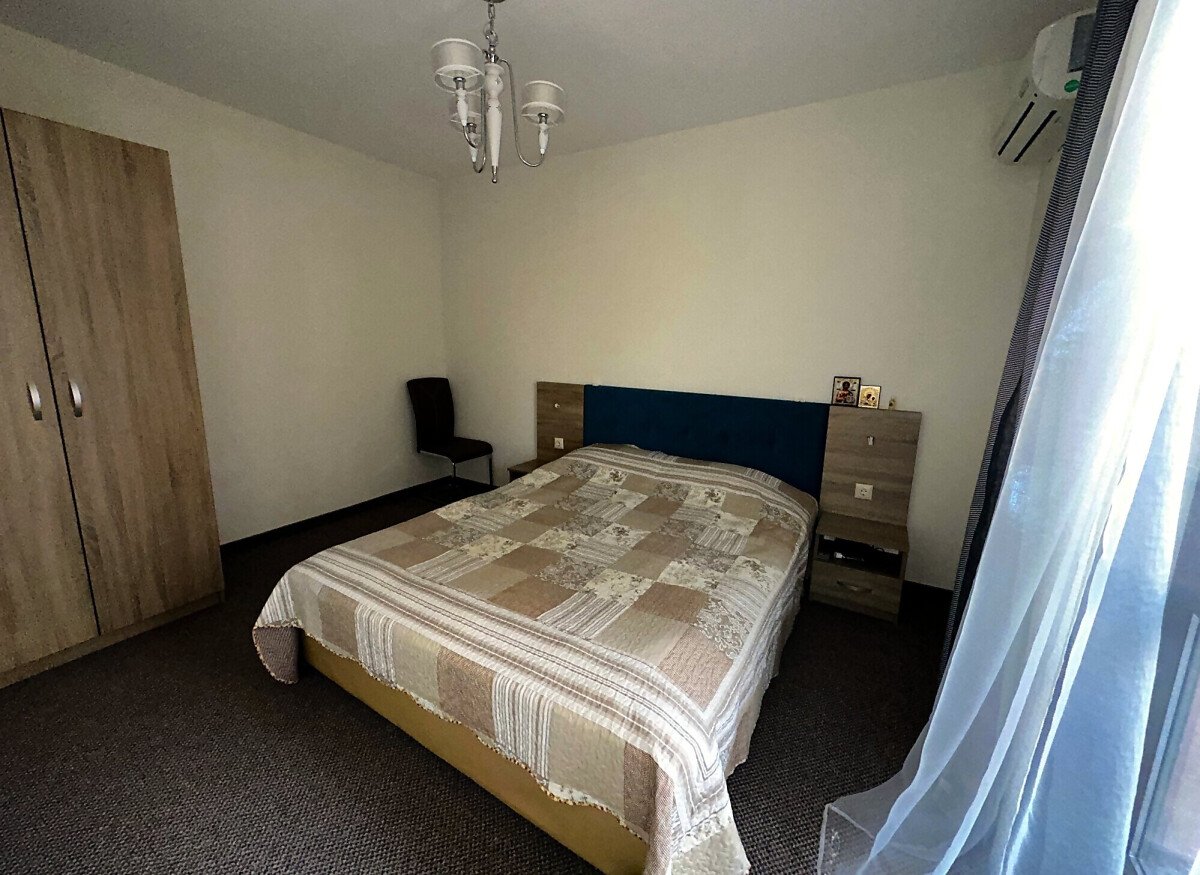 Апартаментът е в отлично състояние, обзаведен и оборудван с всички необходими електроуреди, готов за нанасяне. Състои се от всекидневна с кухненски бокс и кът за хранене, две спални, баня с тоалетна и душ кабина, тераса с изглед към басейна и вътрешната територия на комплекса.
