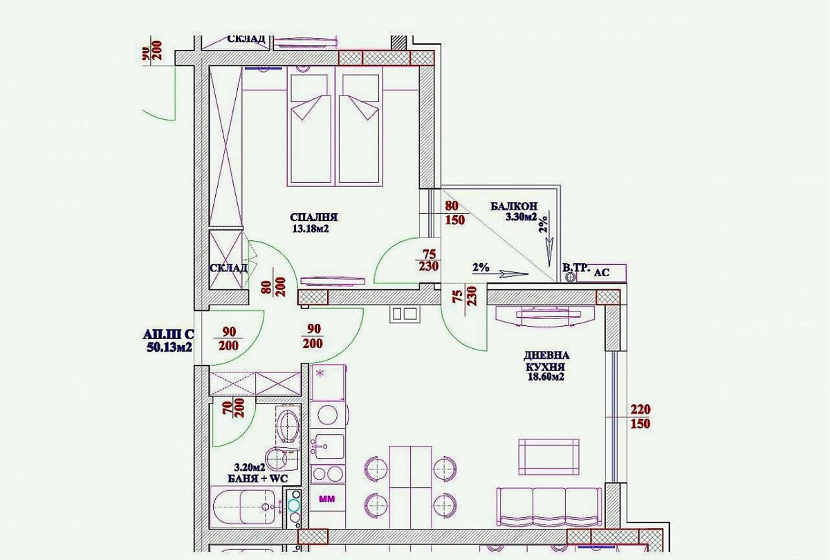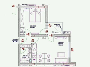 Имотът се намира на четвърти етаж в сграда Б и чистата му жилищна площ е 50,13 кв.м (с общите части е 56 кв.м).
