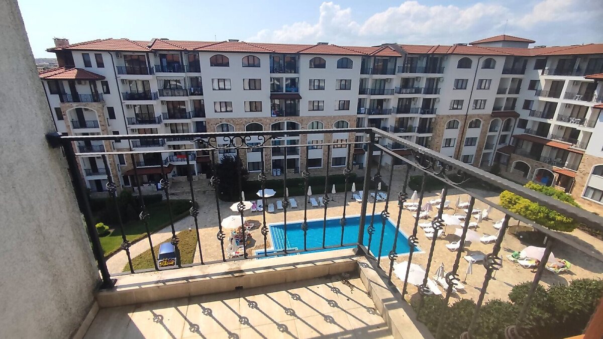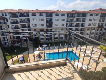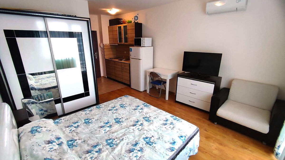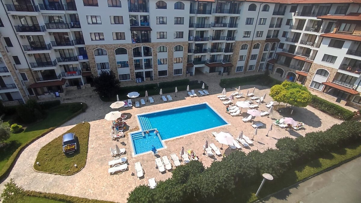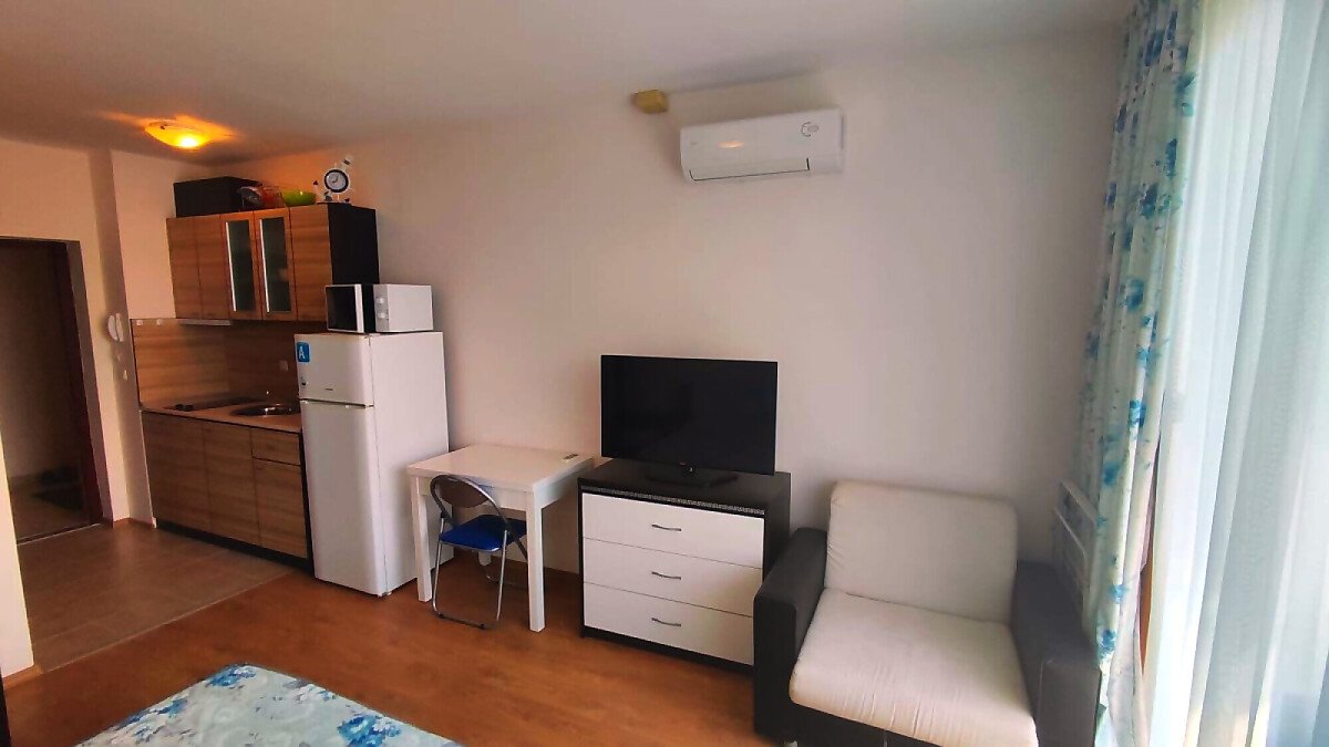 Апартаментът се продава в чудесно състояние, напълно обзаведен и оборудван с всички необходими домакински електроуреди, готов за нанасяне. Състои се от всекидневна с кухненски бокс и обособена спалня, баня с тоалетна и душ кабина и тераса с красива гледка към басейна и вътрешната територия на комплекса.