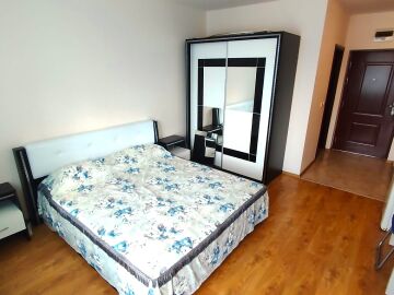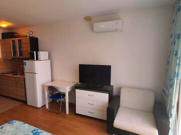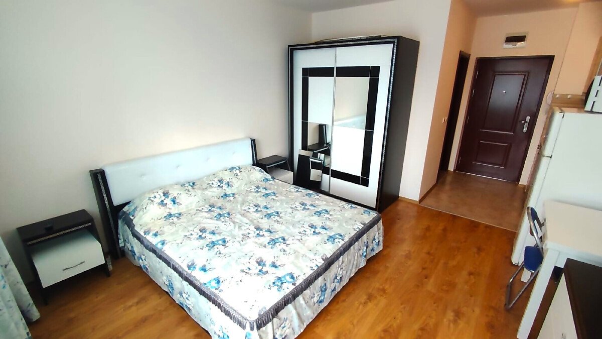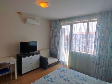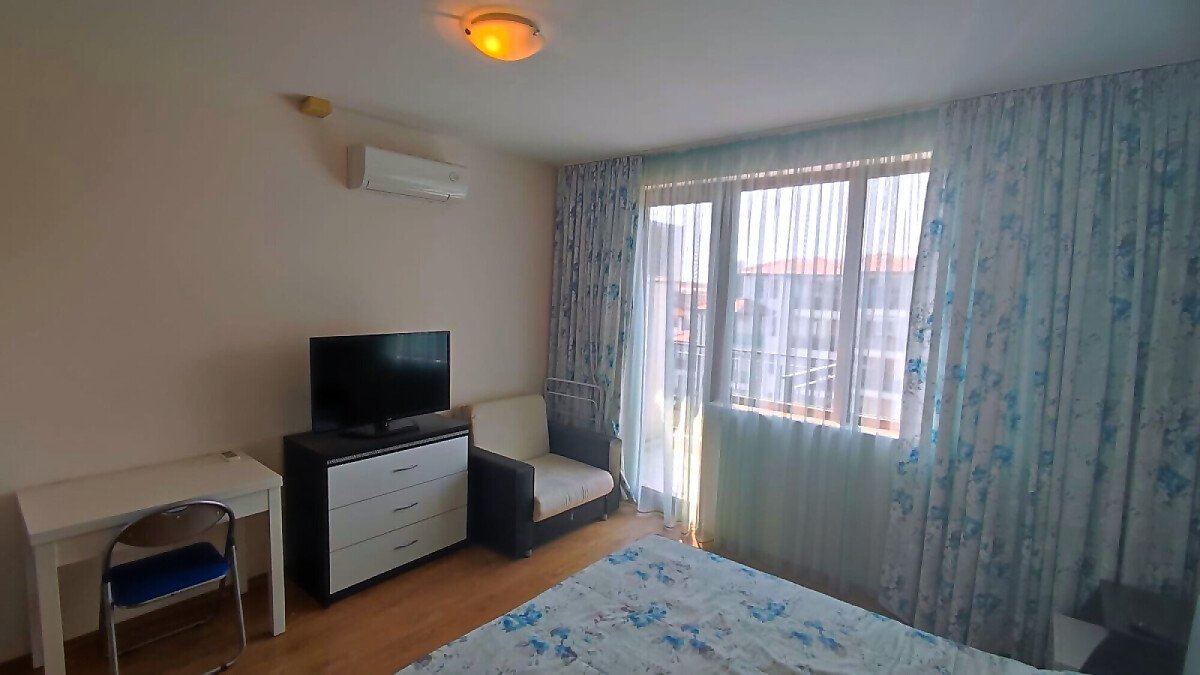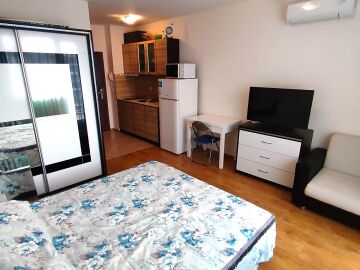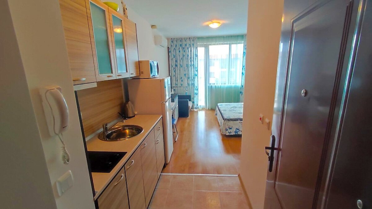 Апартаментът се продава в чудесно състояние, напълно обзаведен и оборудван с всички необходими домакински електроуреди, готов за нанасяне. Състои се от всекидневна с кухненски бокс и обособена спалня, баня с тоалетна и душ кабина и тераса с красива гледка към басейна и вътрешната територия на комплекса.