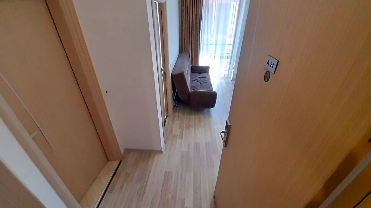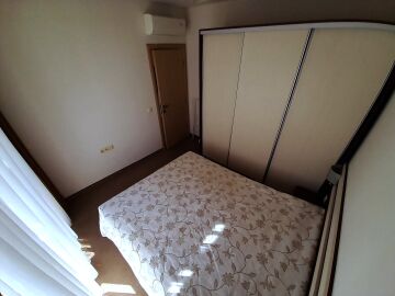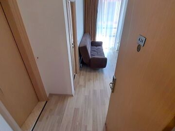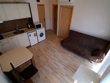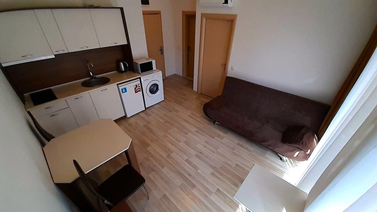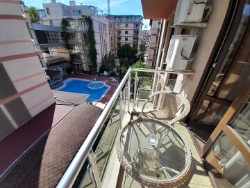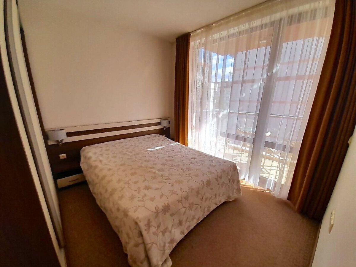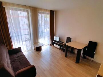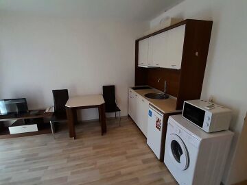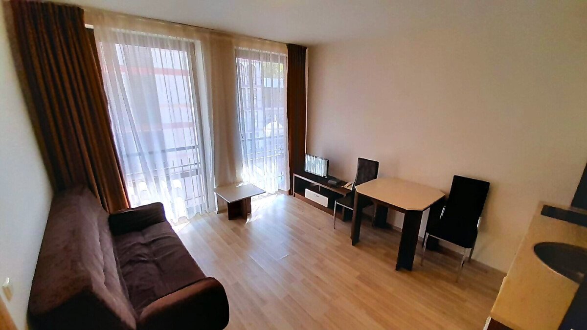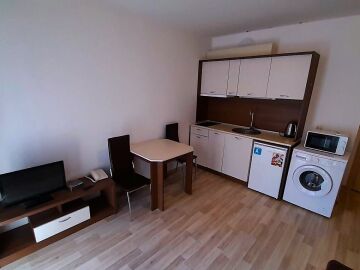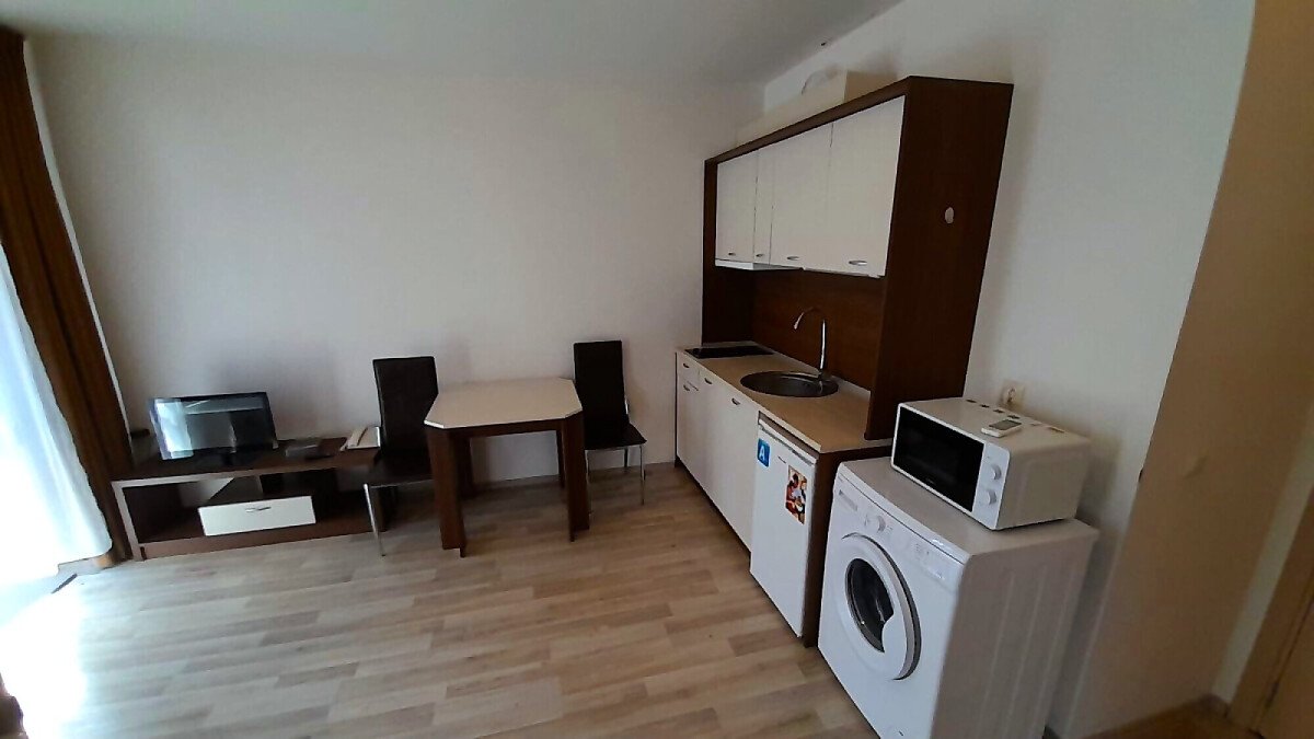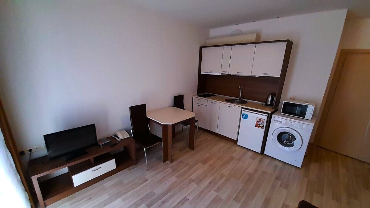 Апартаментът е много функционален, напълно обзаведен и оборудван с всички необходими електроуреди. Състои се от всекидневна с кухненски бокс, спалня, баня с тоалетна и душ кабина и тераса с красива гледка към басейна. Жилището е в отлично състояние, готово за нанасяне.