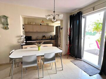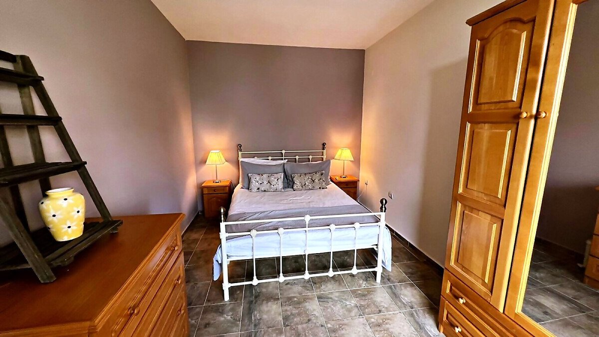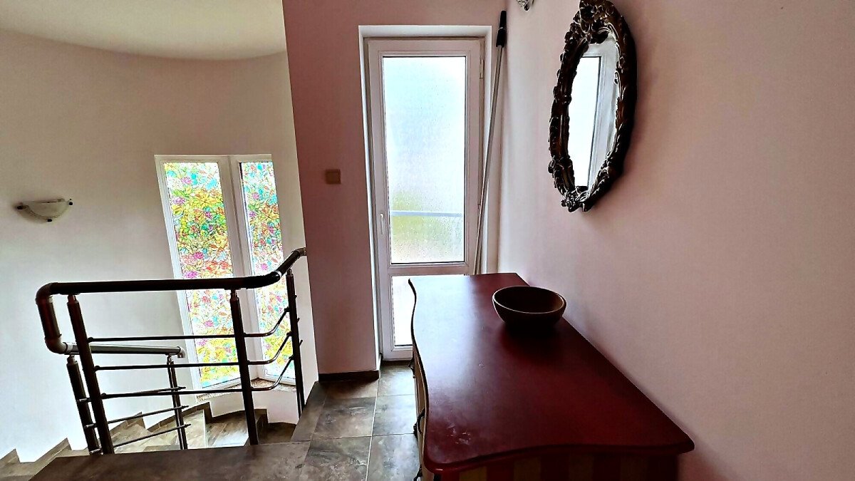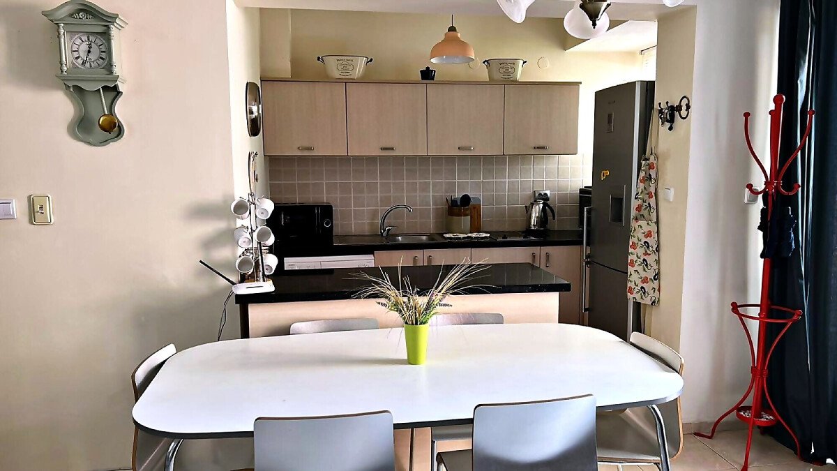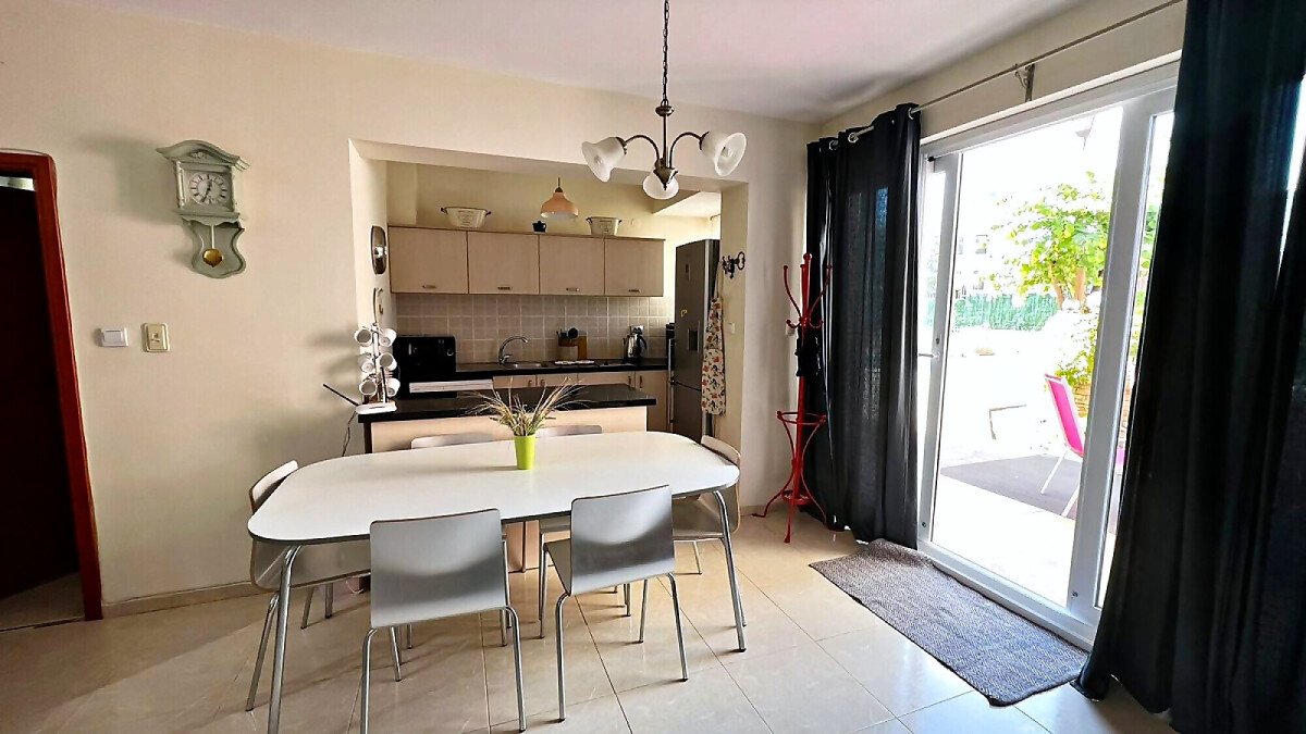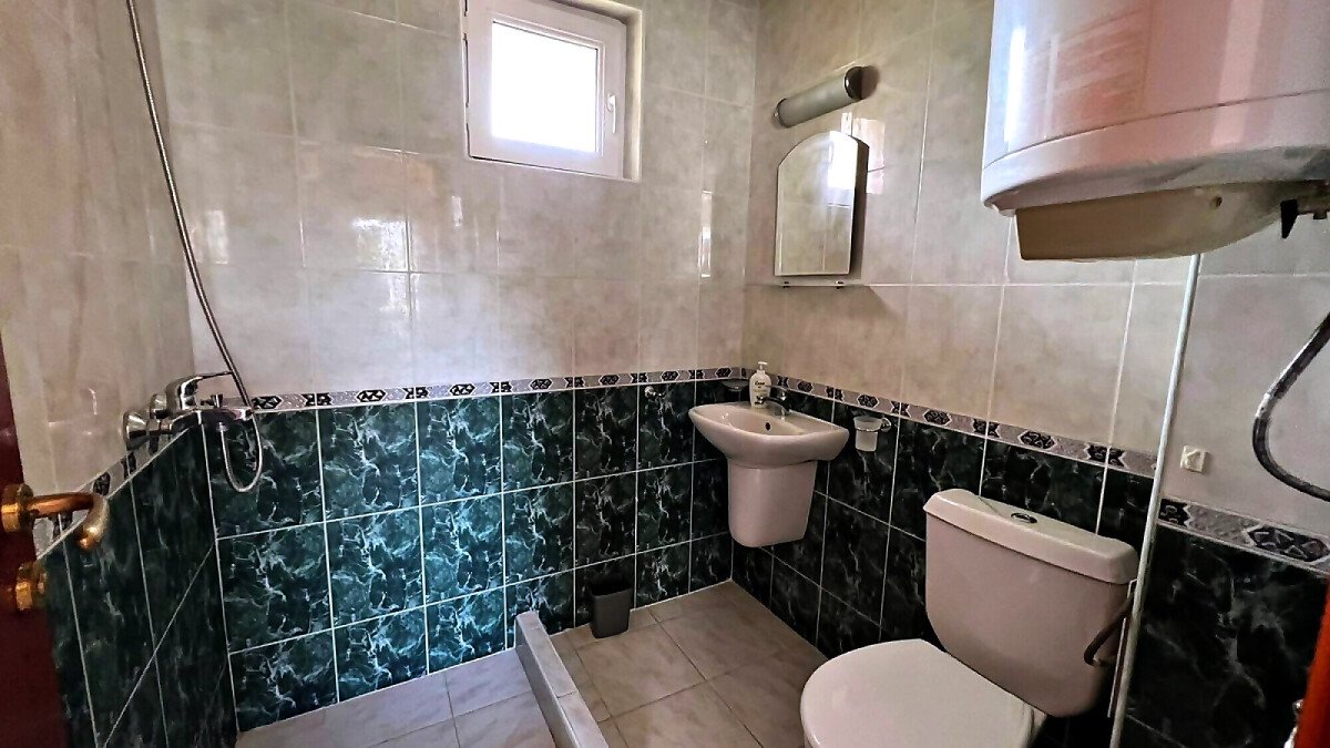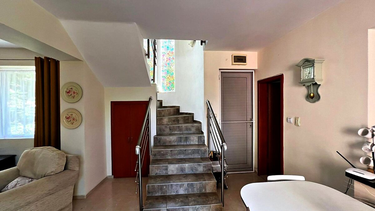 Първи етаж – просторна всекидневна с кухненски бокс и кът за хранене, баня с тоалетна и прекрасна веранда с гледка към двора и басейна.