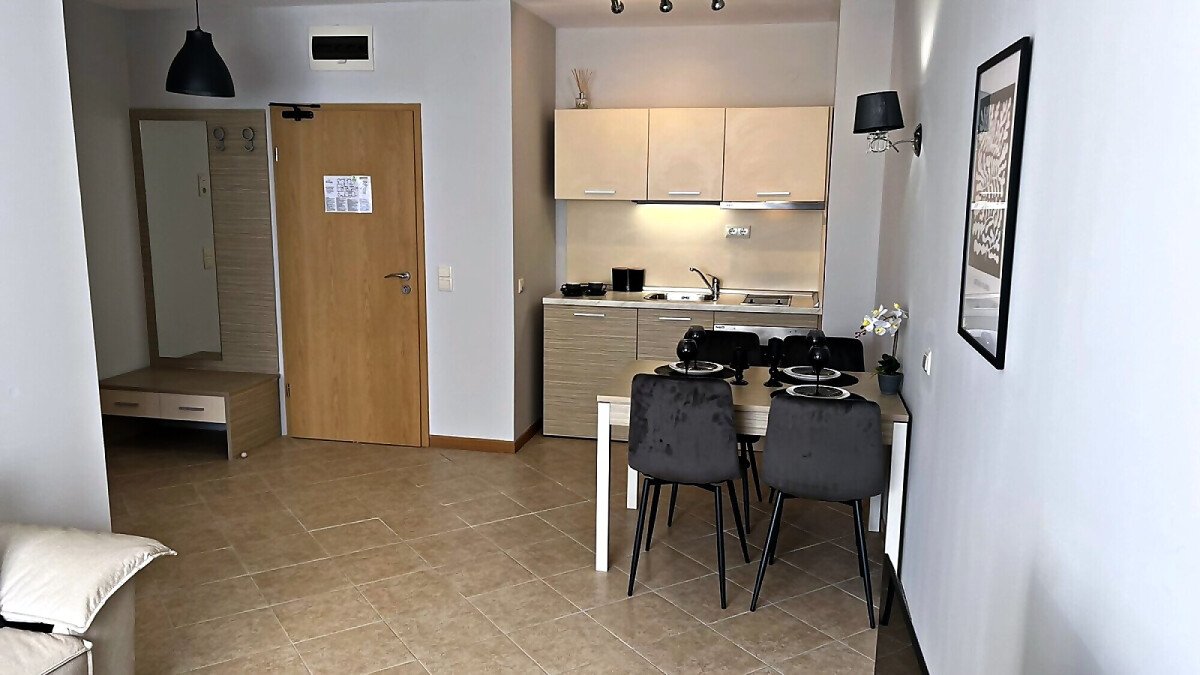 Апартаментът е светъл и уютен. Състои се от всекидневна с напълно оборудван кухненски бокс и обособен кът за хранене, спалня, баня с тоалетна и вана и тераса. Имотът се продава напълно обзаведен, готов за нанасяне.