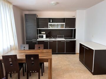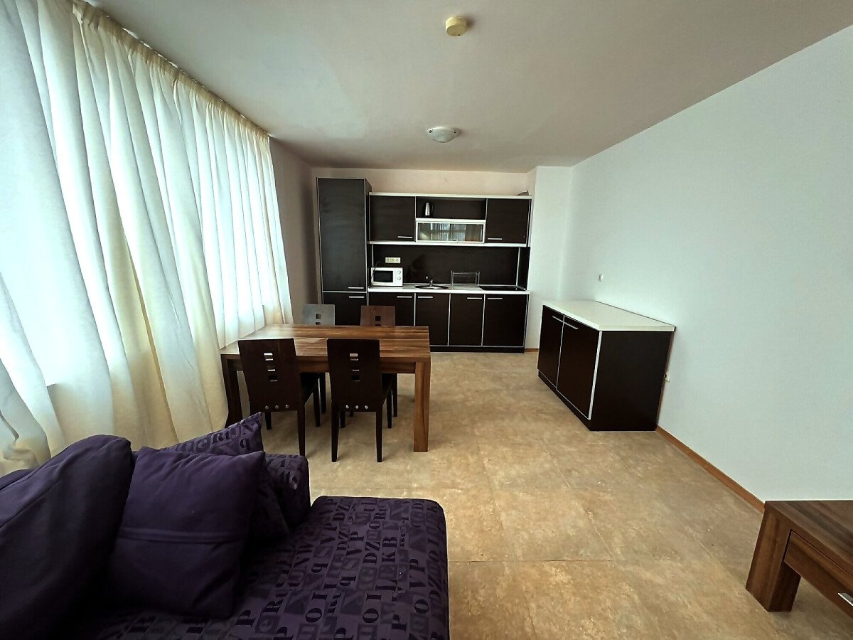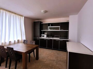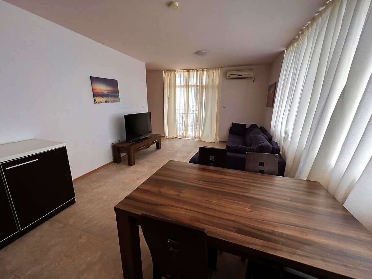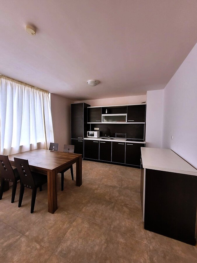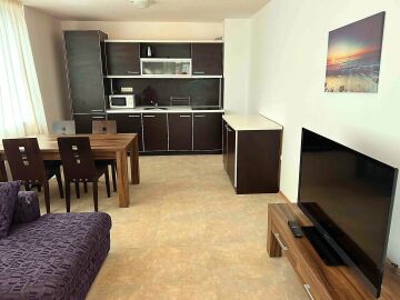 Апартаментът е просторен и много функционален.Състои се от входно антре, всекидневна с обособен кухненски бокс и кът за хранене, две спални, баня с тоалетна и душ кабина, отделна тоалетна и две тераси. Едната от терасите има прекрасна гледка към басейна. Жилището се продава напълно обзаведено и оборудвано с всичко необходимо, готово за нанасяне.