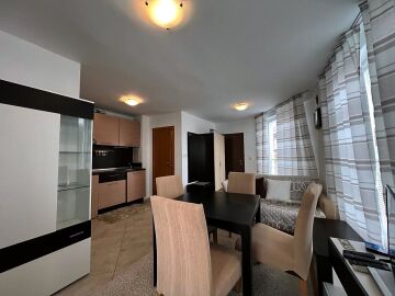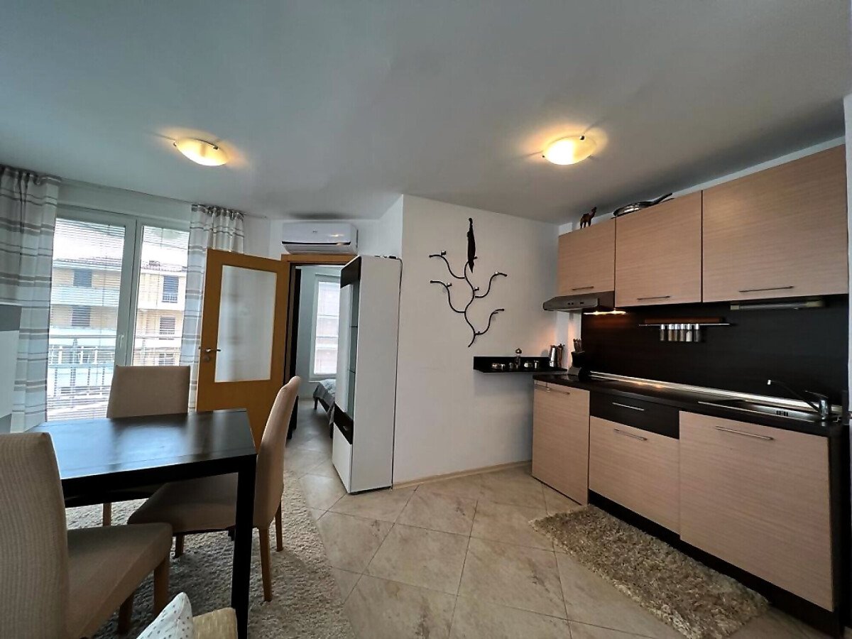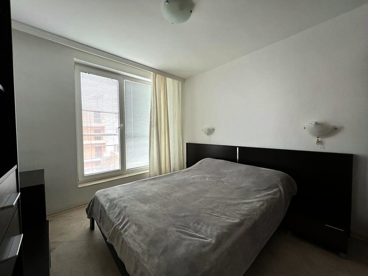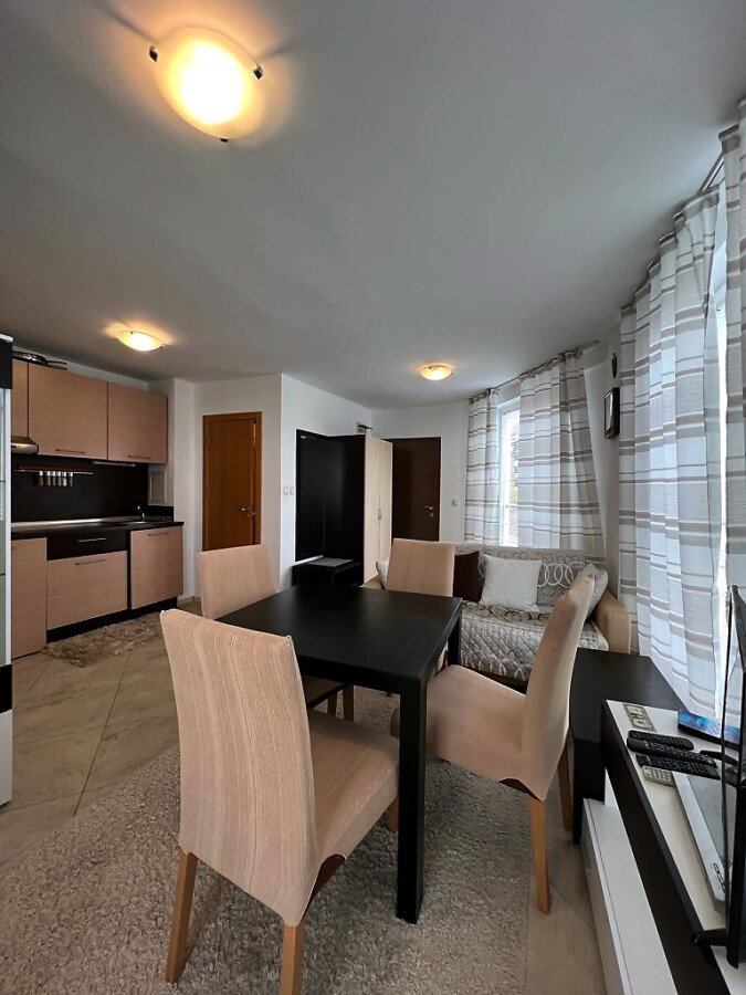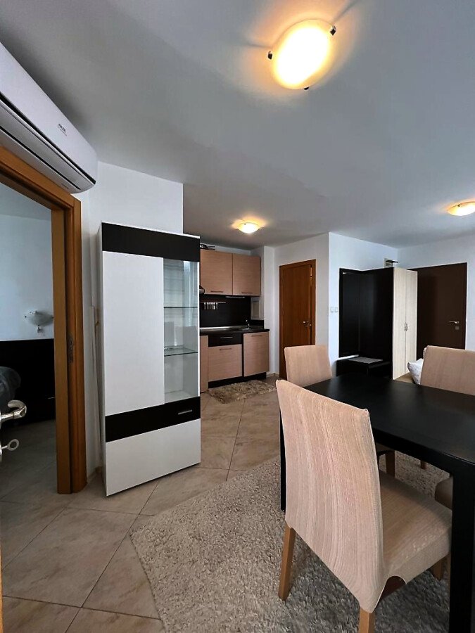Апартаментът е уютен и много функционален. Състои се от всекидневна с кухненски бокс и кът за хранене, спалня, баня с тоалетна и душ кабина и тераса с невероятна гледка към морето, басейна и планината! Жилището е в отлично състояние, оборудвано с качествена техника и напълно обзаведено, готово за нанасяне.