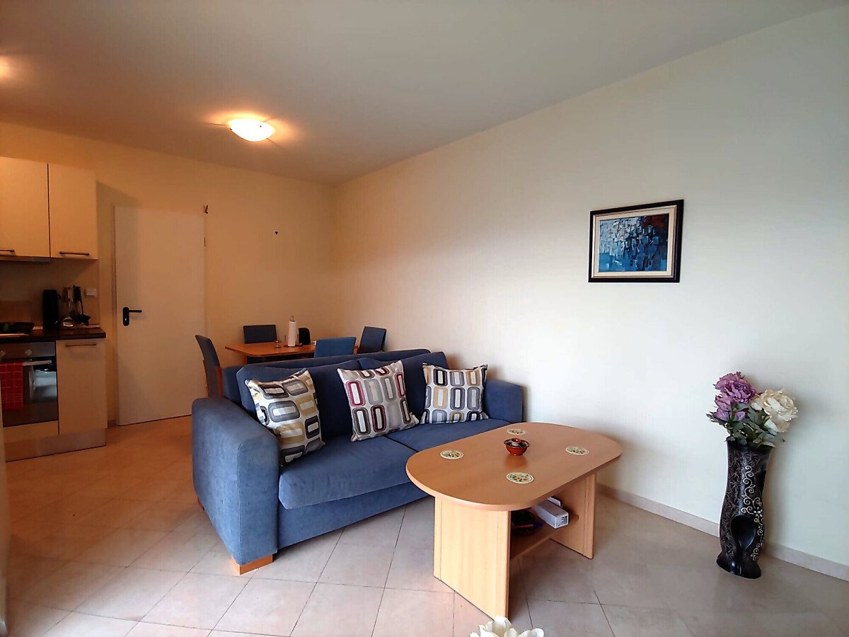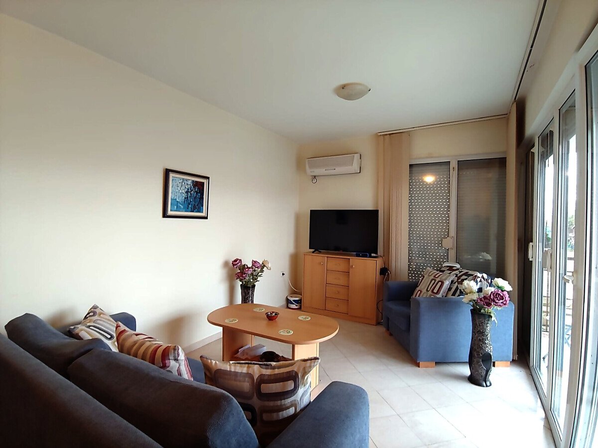 Апартаментът е просторен и много функционален, със следното разпределение – входно антре, всекидневна с кухненски бокс и обособен кът за хранене, спалня, баня с тоалетна и тераса с гледка към басейна. Жилището е напълно обзаведено с мебели, оборудвано с битова техника, готово за нанасяне.