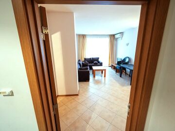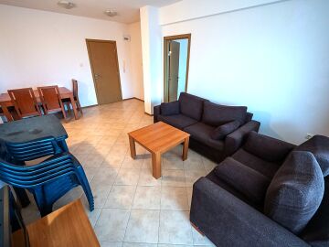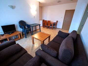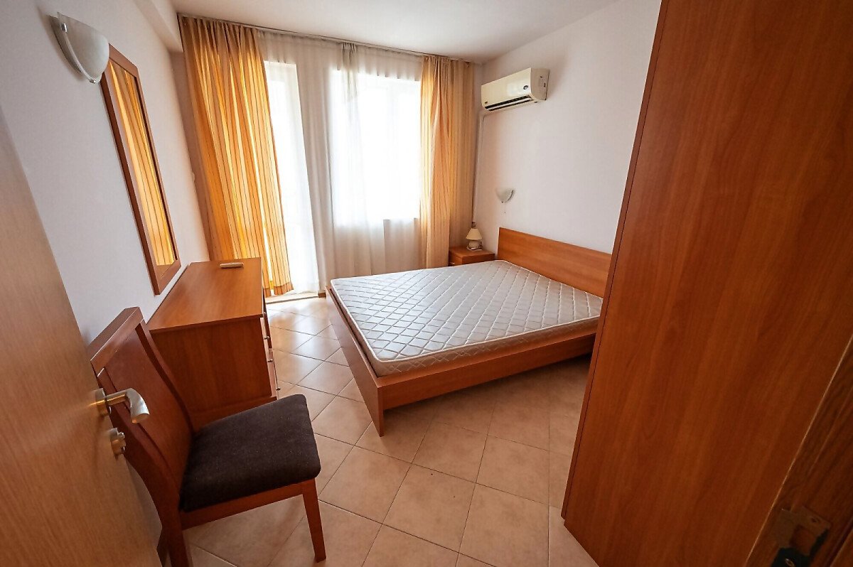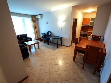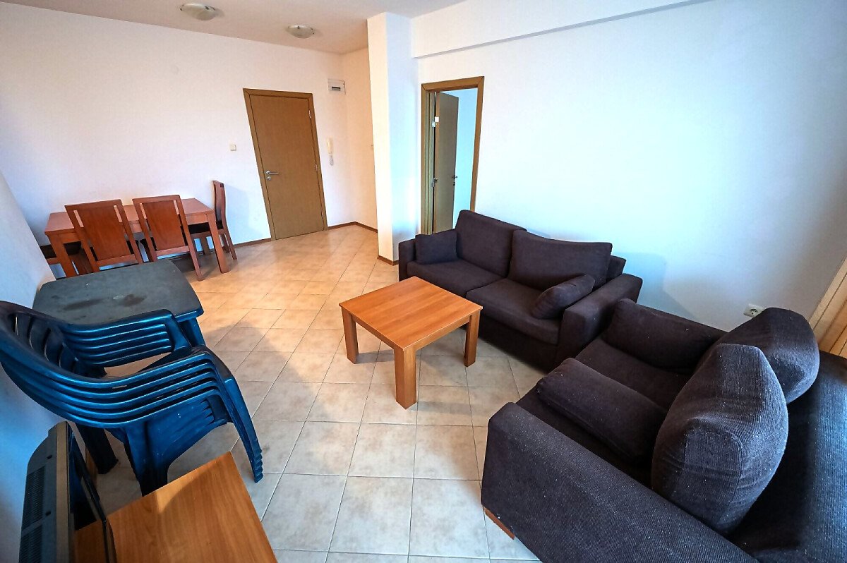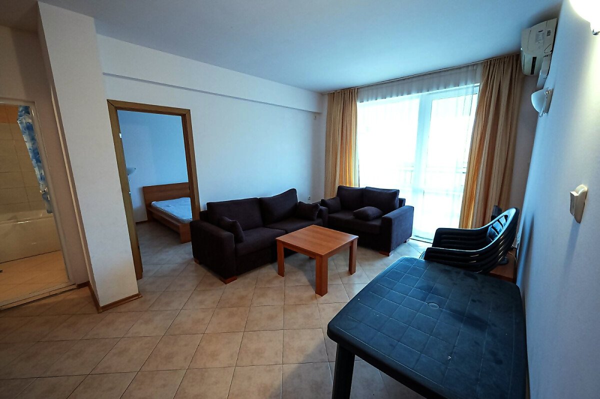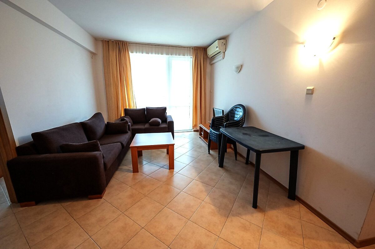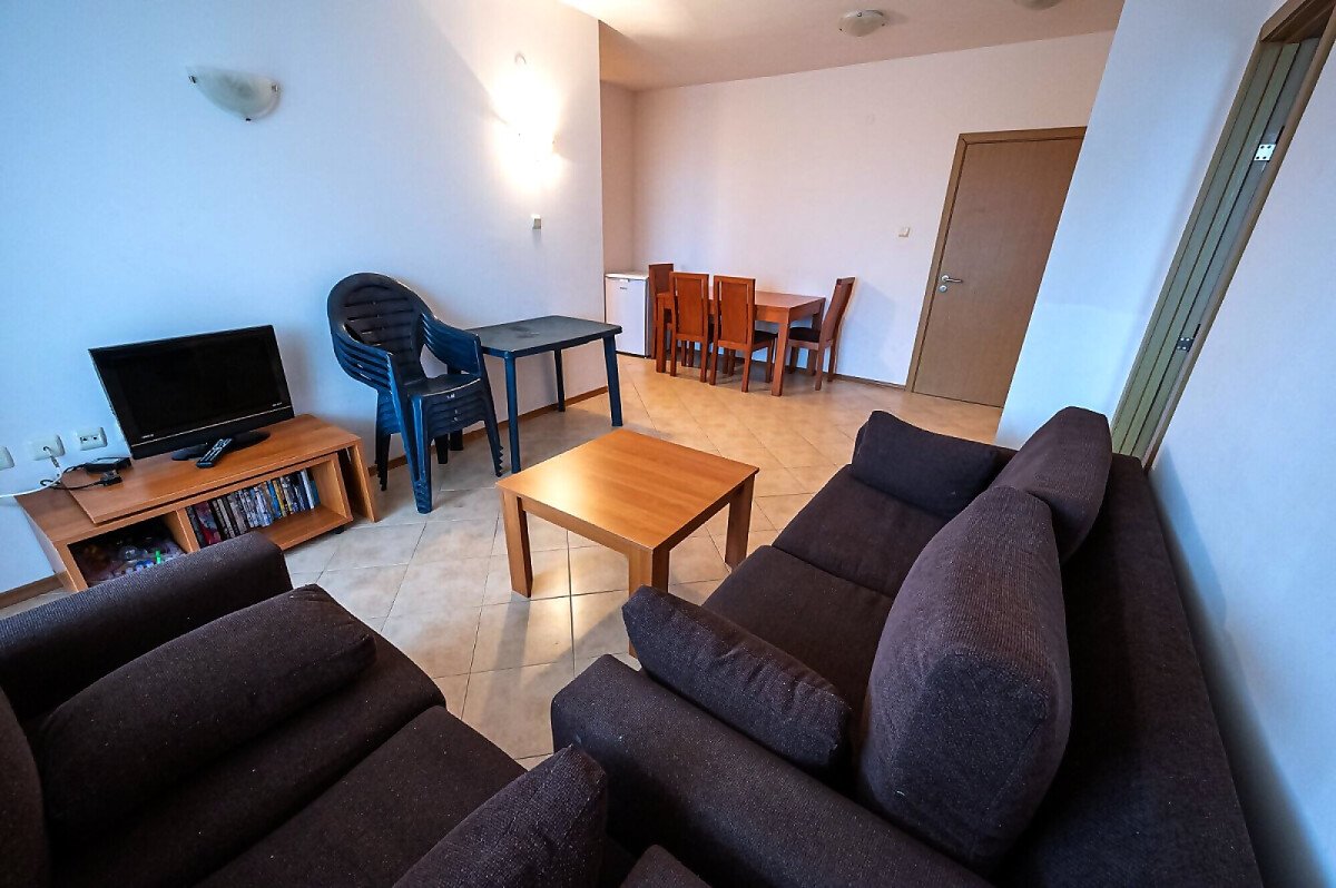 Апартаментът е в добро състояние, напълно обзаведен с мебели и оборудван с битова техника, готов за нанасяне. Състои се от всекидневна с обособен кухненски бокс и кът за хранене, две спални, баня с тоалетна и вана и тераса с прекрасна гледка към басейна. Жилището е подходящо както за сезонно отдаване под наем, така и за лично ползване.