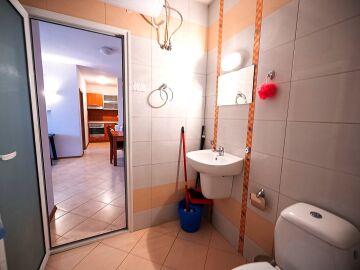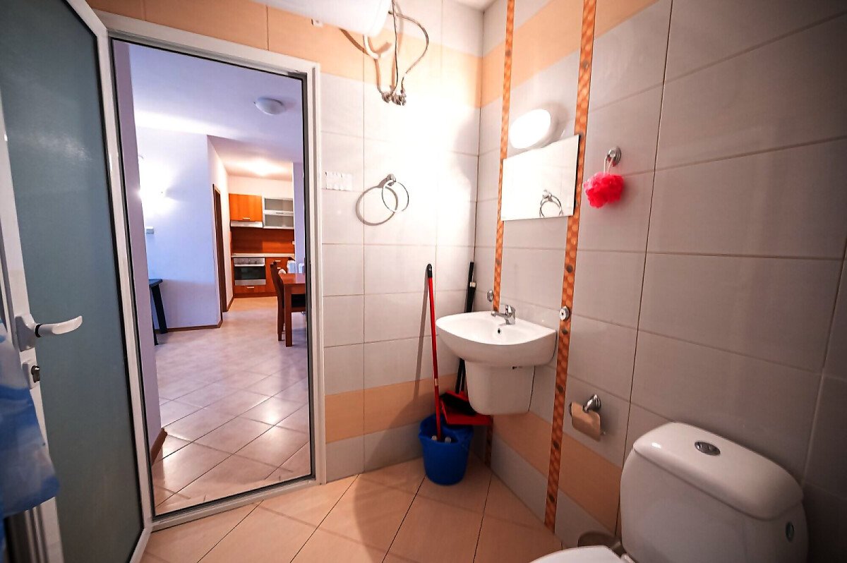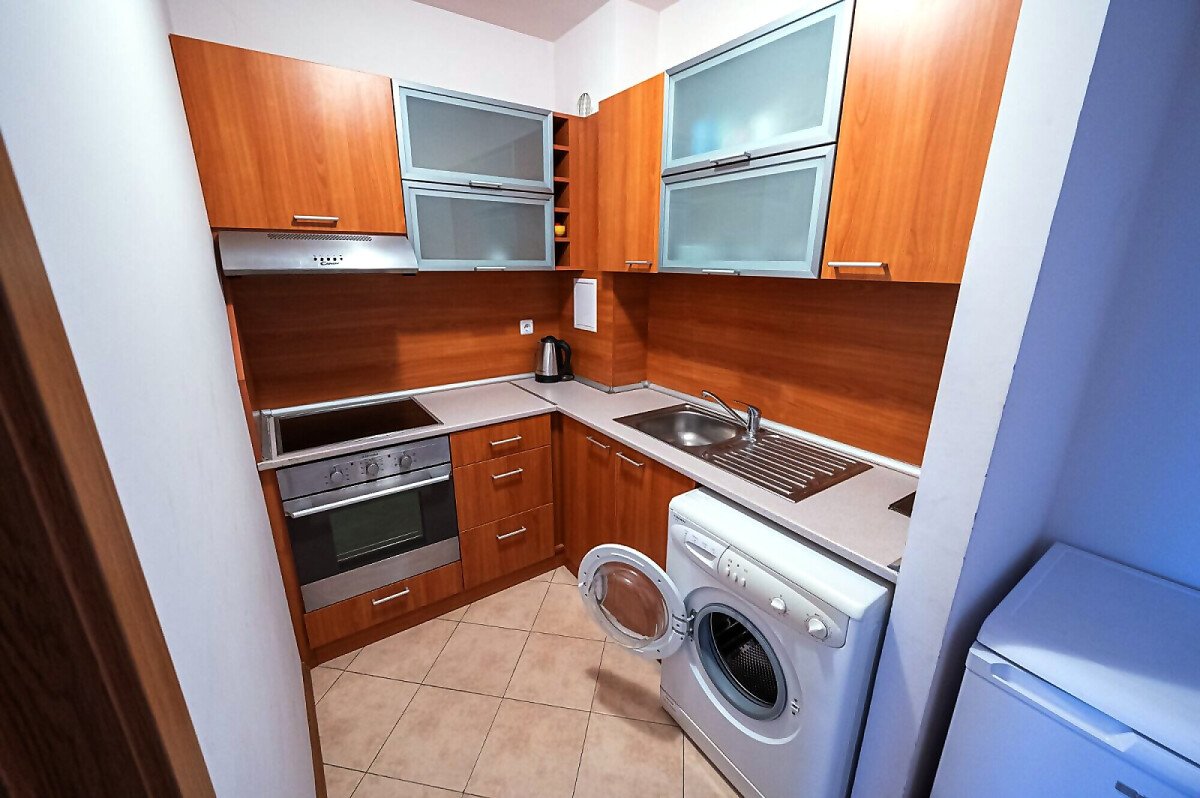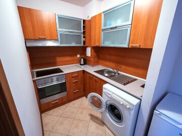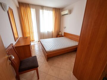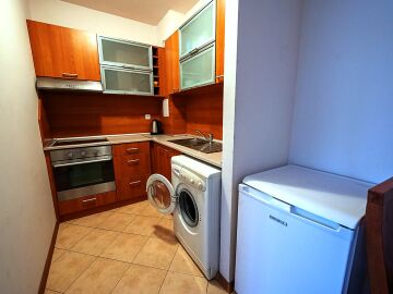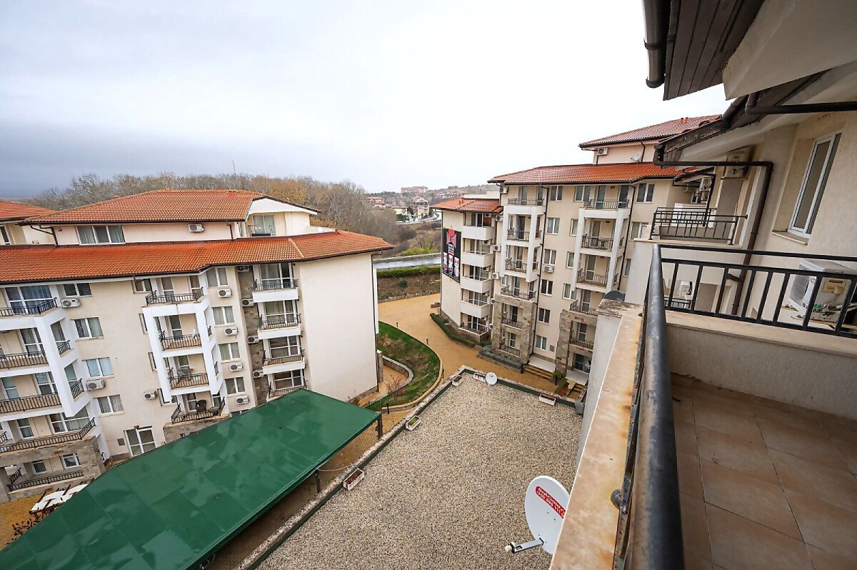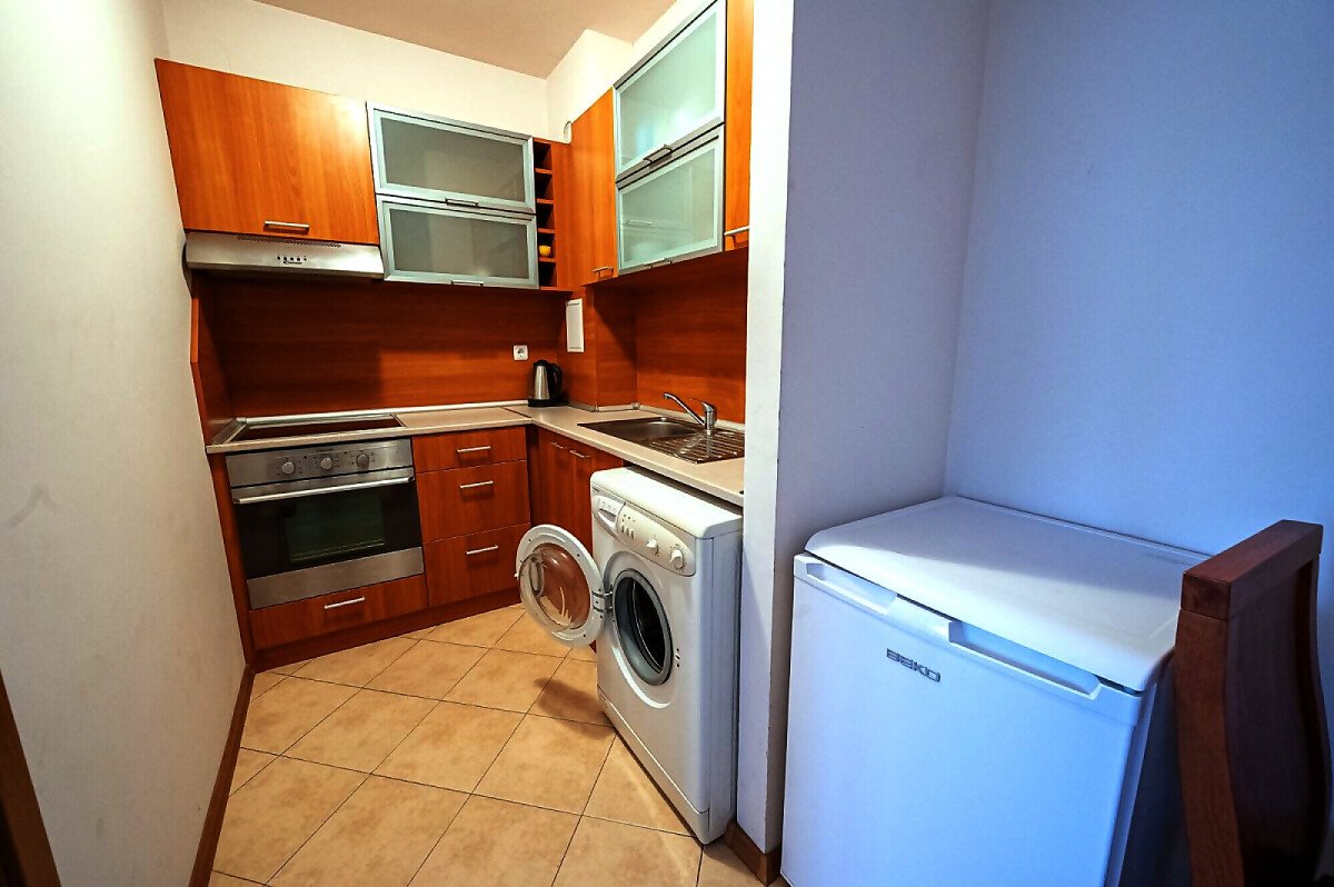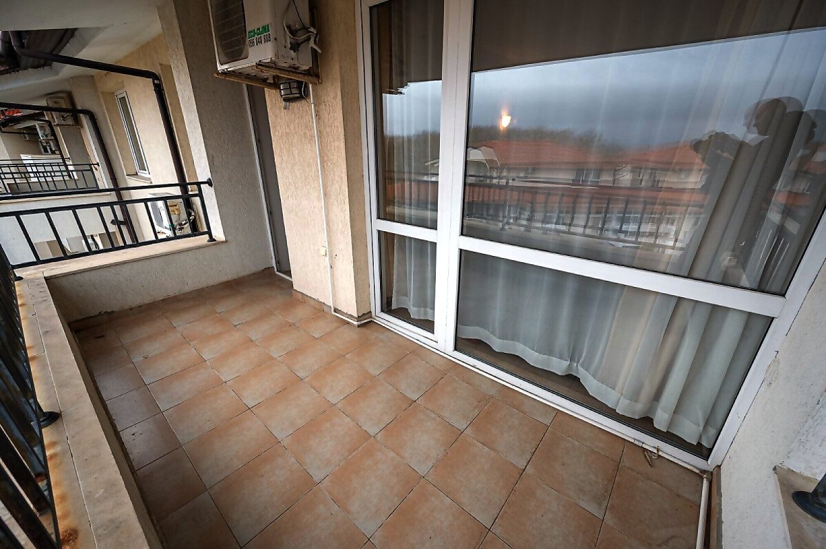 Апартаментът е в добро състояние, напълно обзаведен с мебели и оборудван с битова техника, готов за нанасяне. Състои се от всекидневна с обособен кухненски бокс и кът за хранене, две спални, баня с тоалетна и вана и тераса с прекрасна гледка към басейна. Жилището е подходящо както за сезонно отдаване под наем, така и за лично ползване.