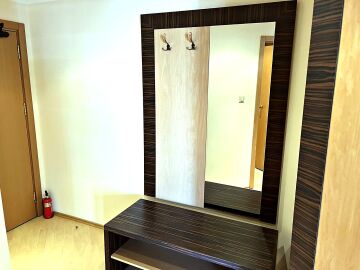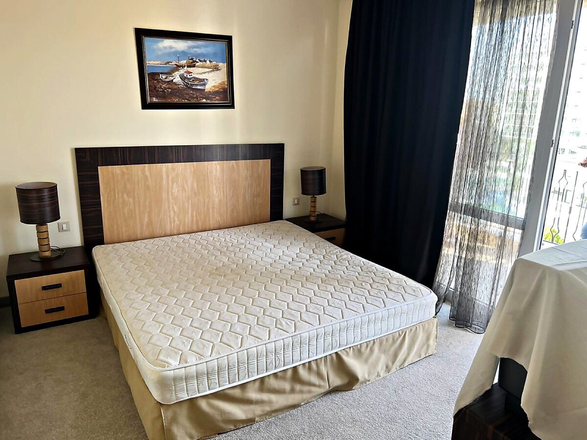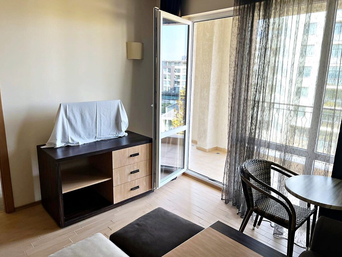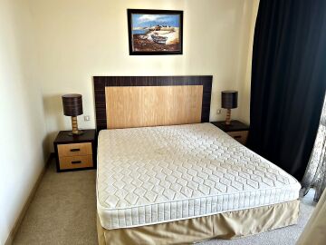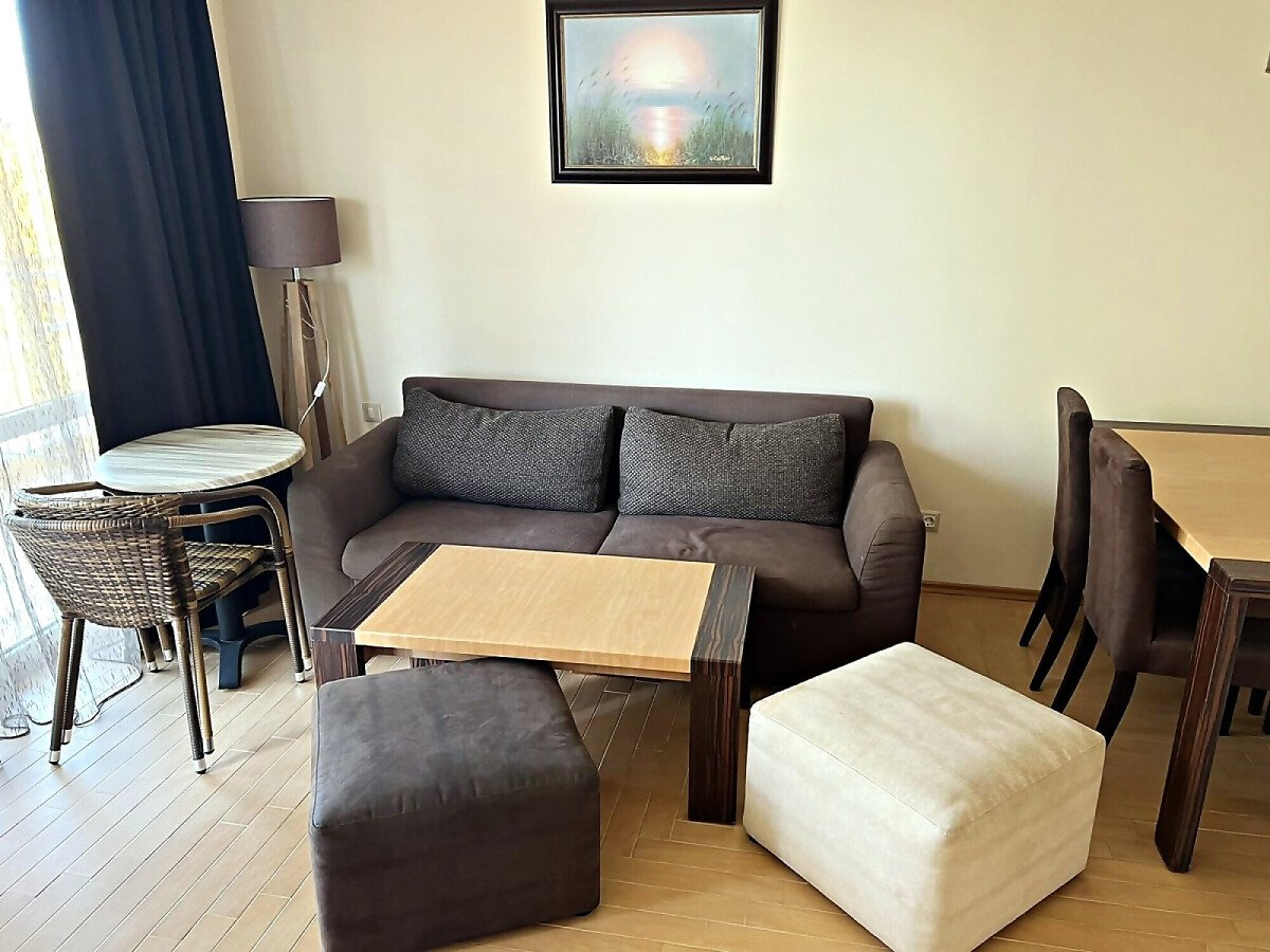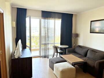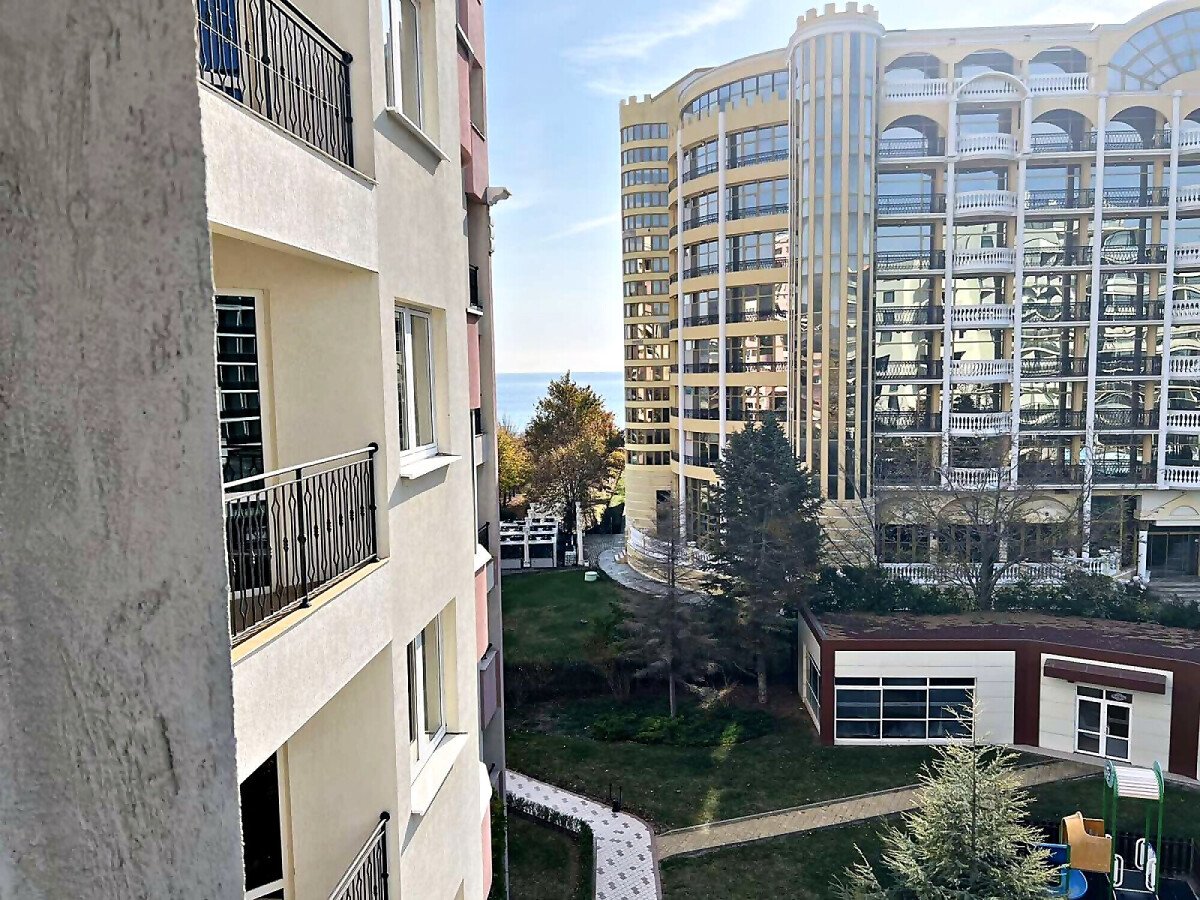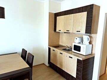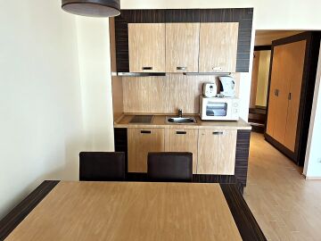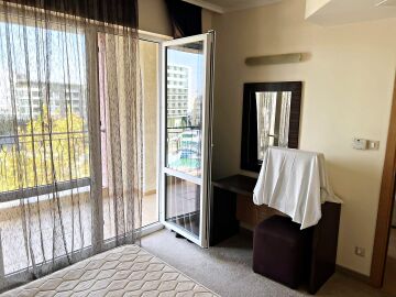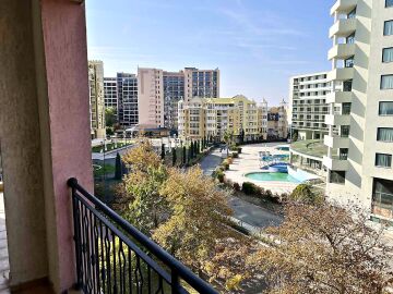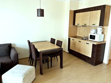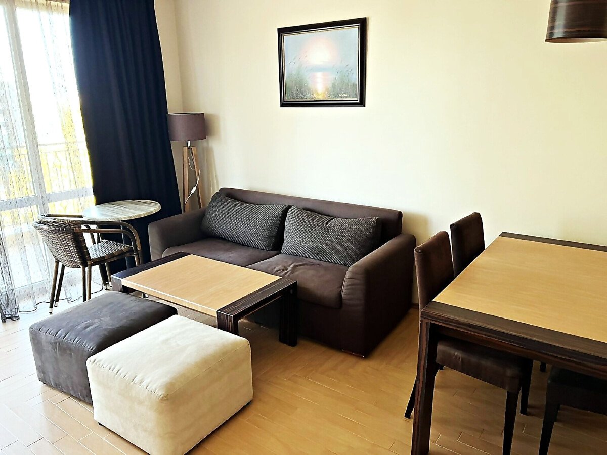 Апартаментът е светъл и много функционален. Разположен е на пети етаж, като сградата разполага с асансьор. Състои се от входно антре, всекидневна с кухненски бокс и обособен кът за хранене, спалня, баня с тоалетна и вана и тераса с частична гледка към морето, басейна и красивите озеленени площи на комплекса. Жилището е в идеално състояние, оборудвано с техника и напълно обзаведено с мебели, готово за нанасяне.