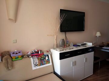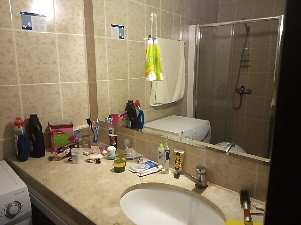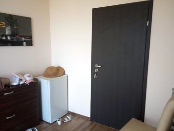 Апартаментът е уютен, слънчев и много просторен. Състои се от входно антре, всекидневна с кухненски бокс, кът за хранене и обособена спална зона, отделна спалня, баня с тоалетна и душ кабина и две тераси. Една от терасите разкрива прекрасна панорамна гледка към морето и басейна, а другата има красив изглед към планината. Жилището се продава обзаведено с качествени мебели и оборудвано с техника, в отлично състояние, готово за нанасяне.