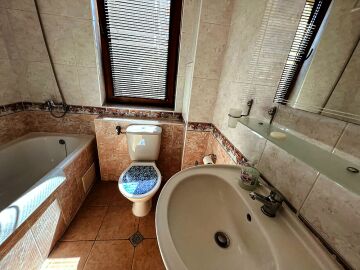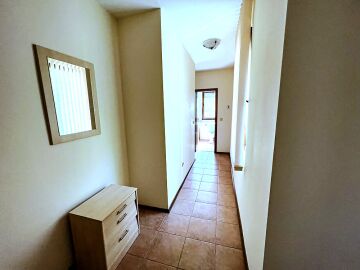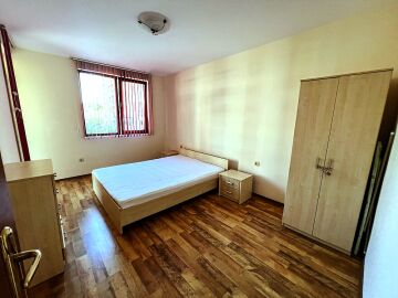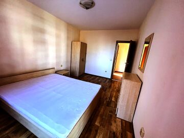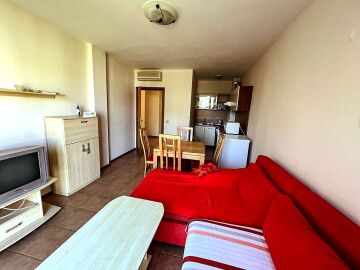 Апартаментът е светъл, просторен и много функционален. Състои се от входно антре, всекидневна с кухненски бокс и кът за хранене, баня с тоалетна и вана, две спални, голяма тераса с красива гледка към басейна и вътрешната територия на комплекса. Напълно оборудван с качествена техника, обзаведен, готов за нанасяне.