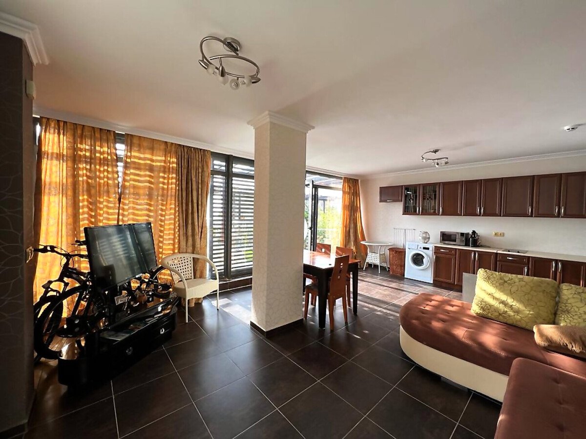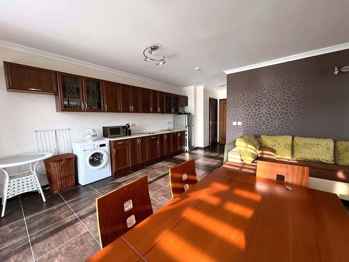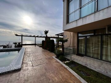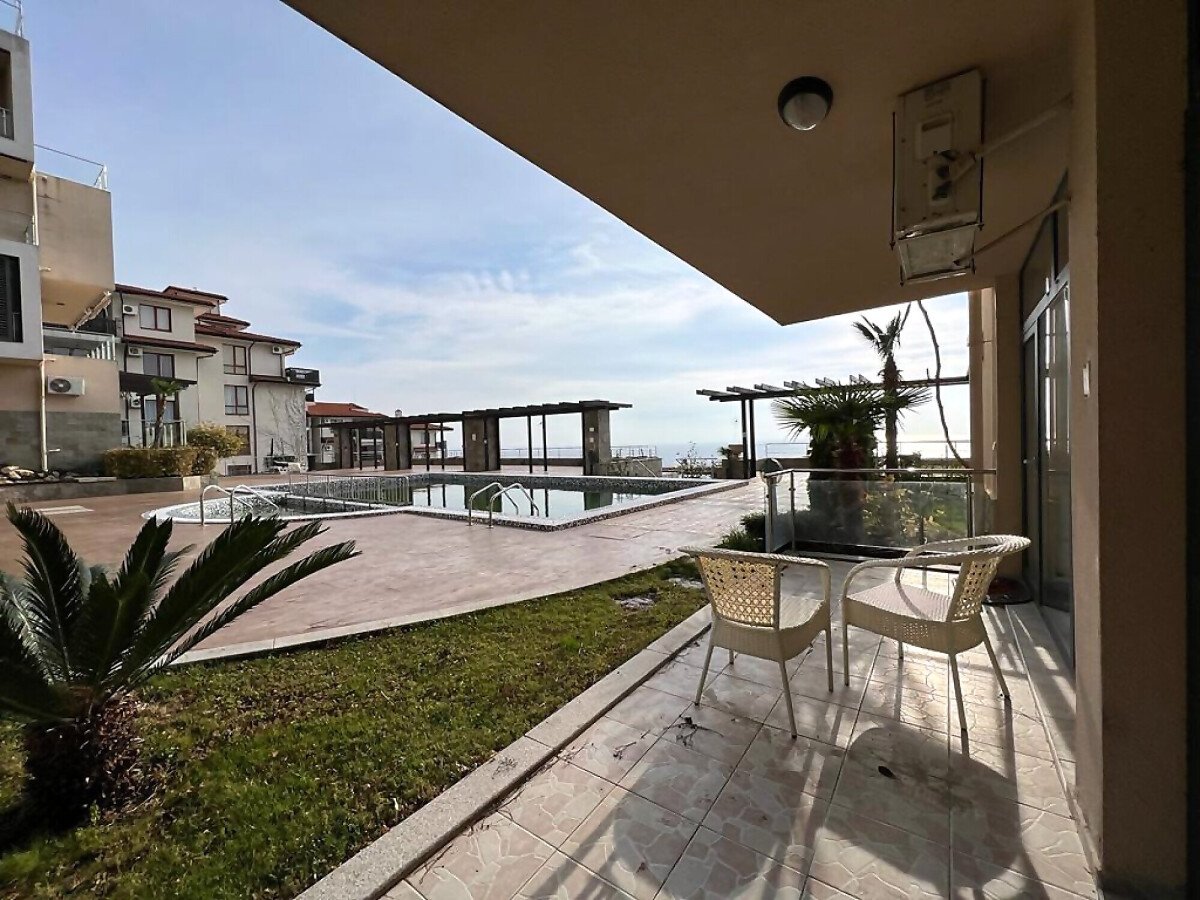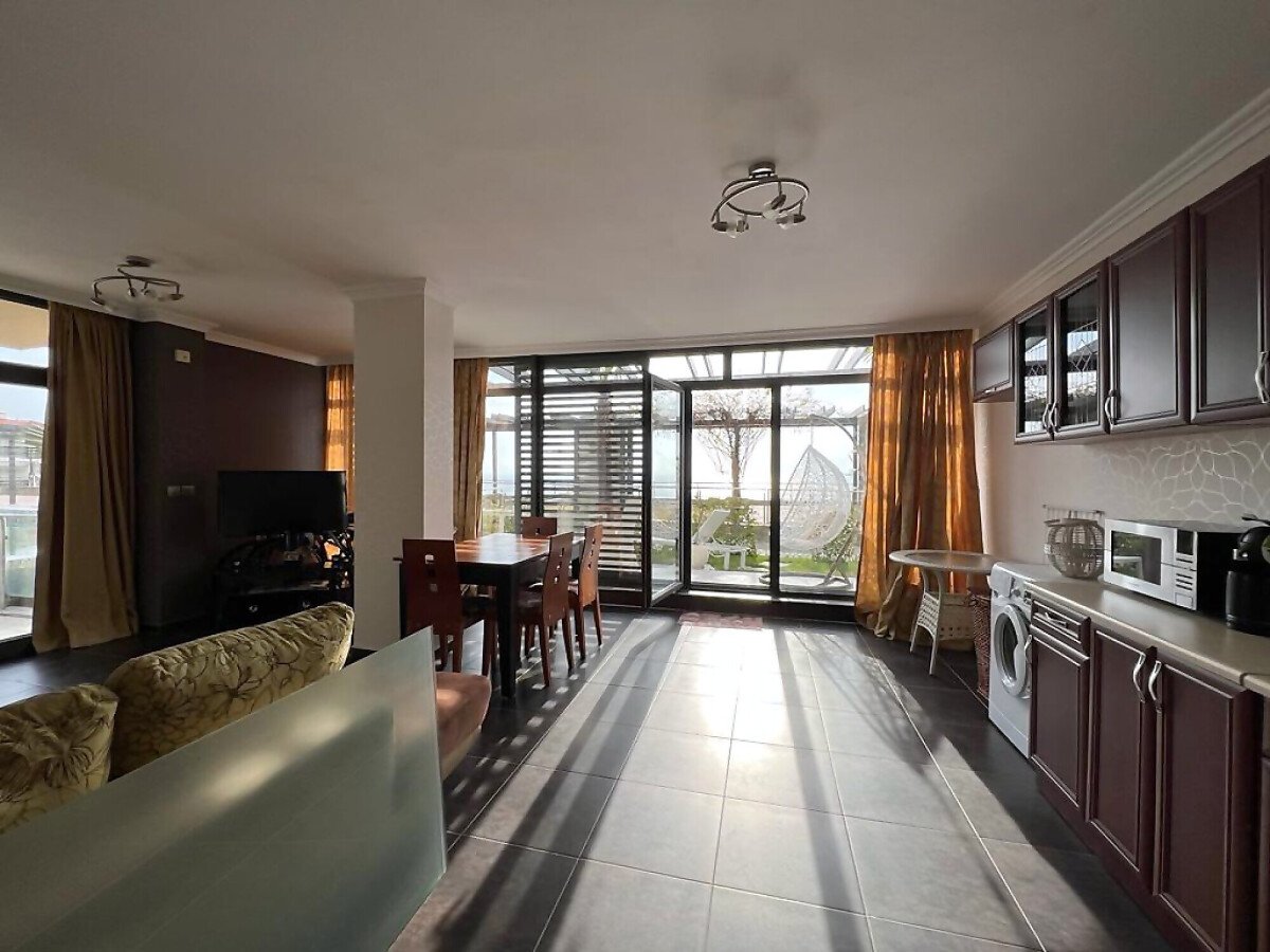 Апартаментът е просторен, много стилен и модерен. Състои се от голяма всекидневна с кухненски бокс и трапезария, баня с тоалетна и вана, спалня, отделна тоалетна и самостоятелна веранда с невероятна гледка към морето и басейна. Жилището е оборудвано с качествена техника, обзаведено с хубави мебели, готово за нанасяне.