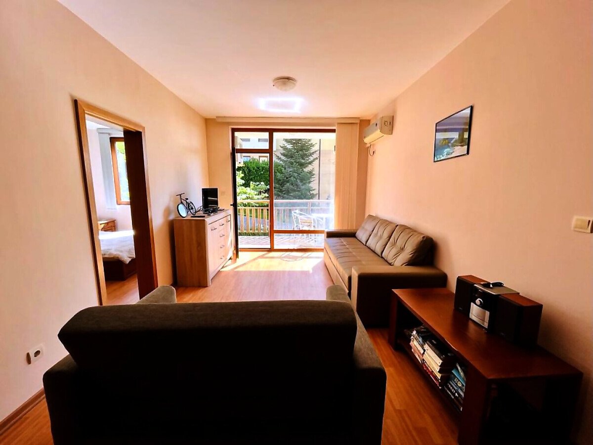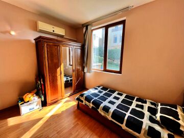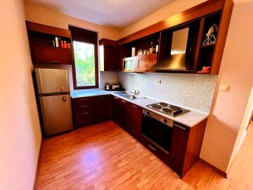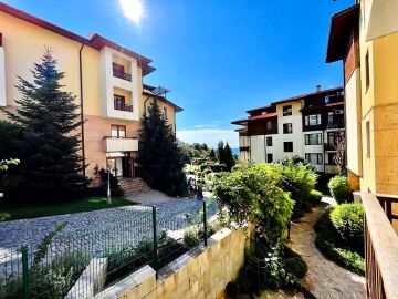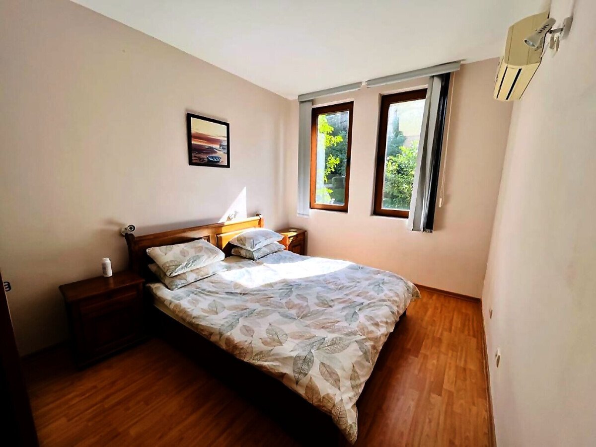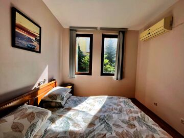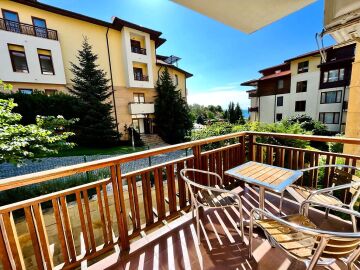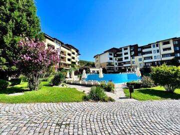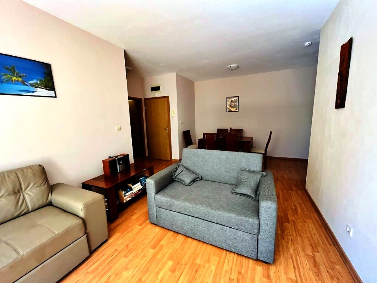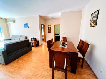 Апартаментът е светъл и просторен, много функционален, в идеално състояние. Състои се от всекидневна с обособен кухненски бокс и трапезария, 2 спални, 2 бани с тоалетна и вана, тераса с красива гледка към озеленената вътрешна територия на комплекса и частична гледка към морето. Имотът се продава обзаведен с хубави мебели, оборудван с техника, готов за нанасяне.
