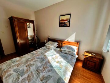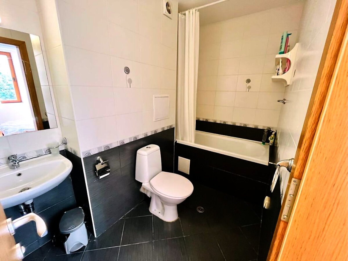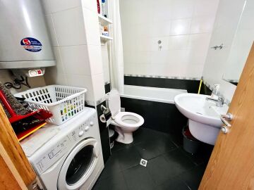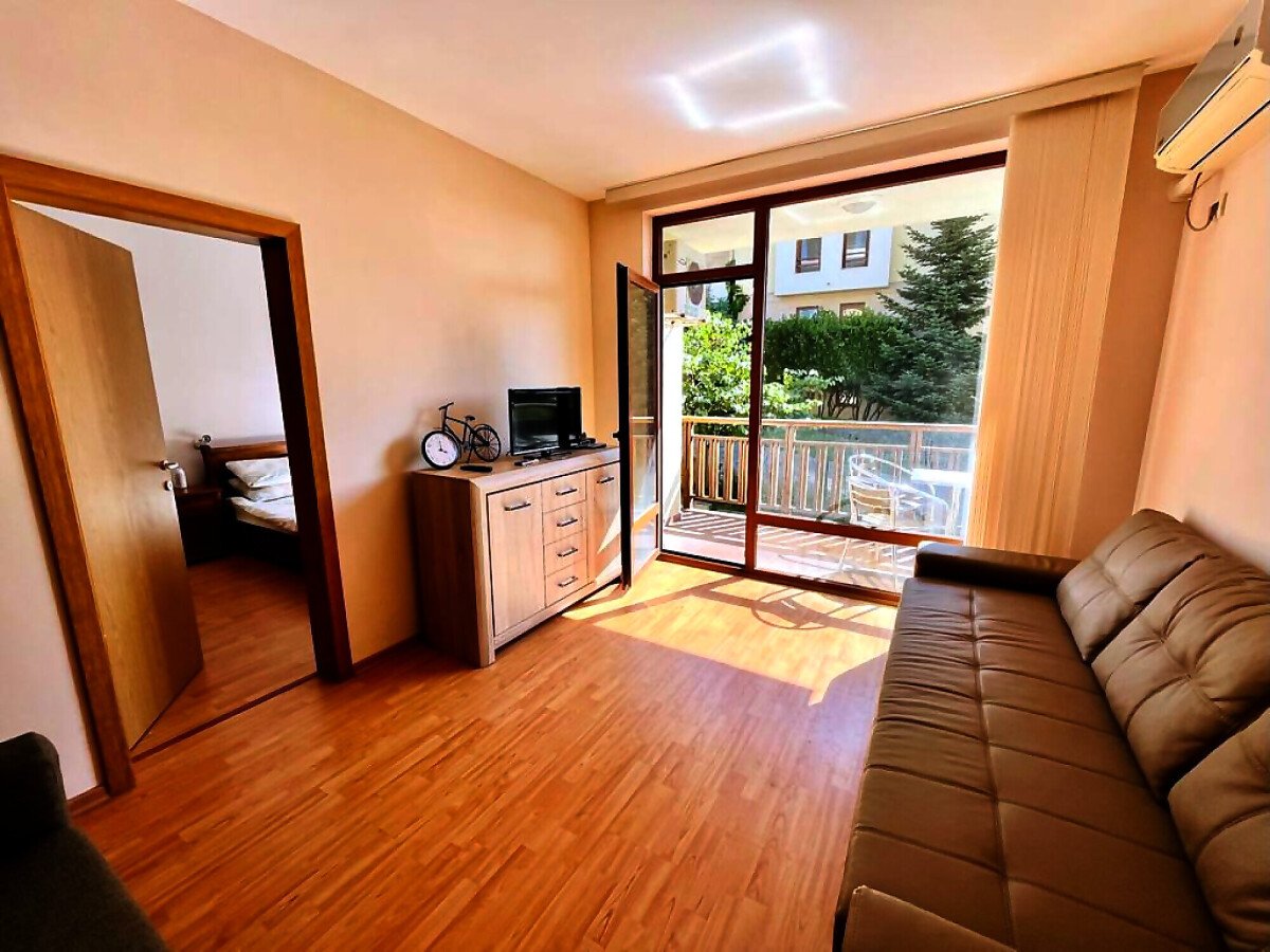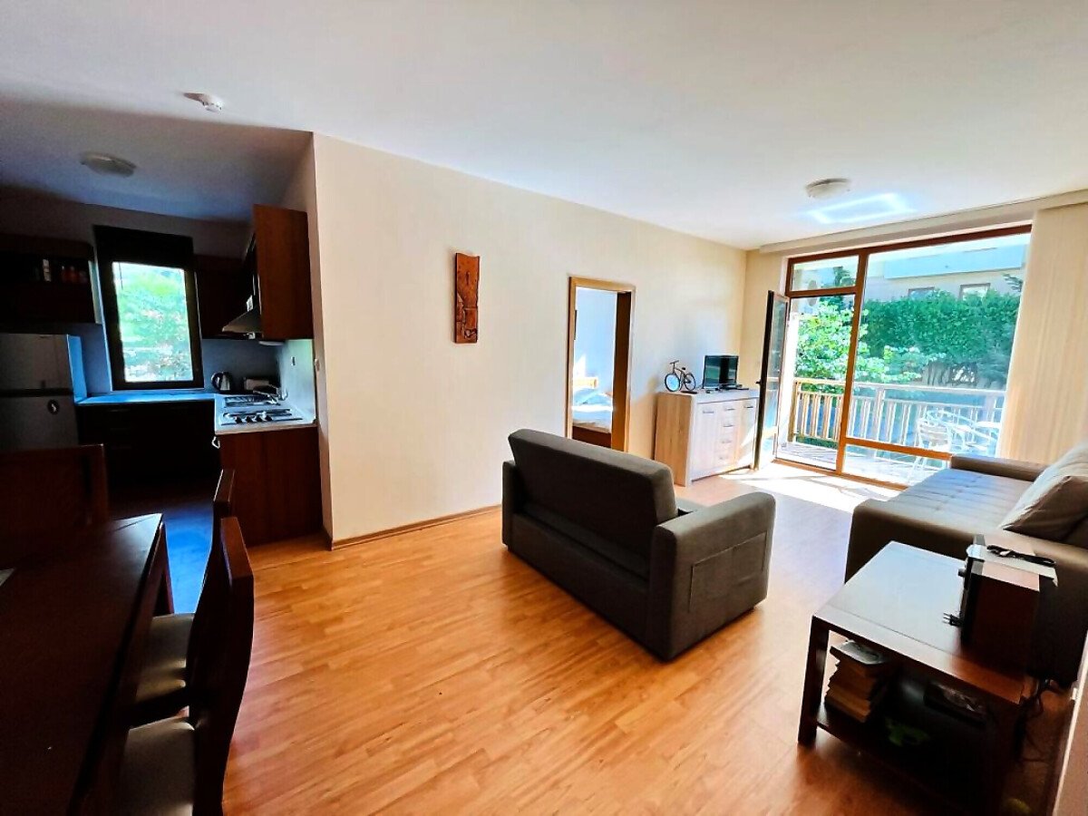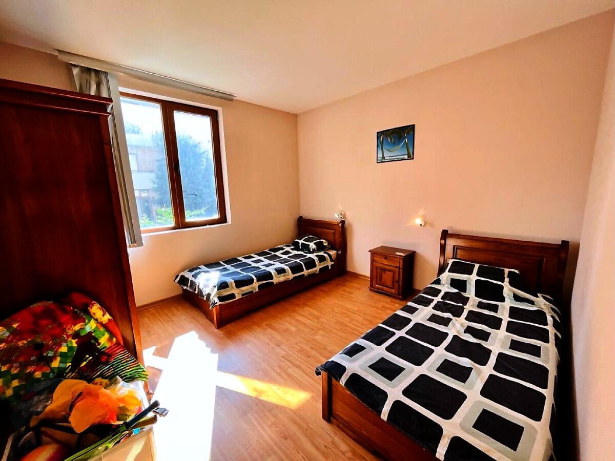 Апартаментът е светъл и просторен, много функционален, в идеално състояние. Състои се от всекидневна с обособен кухненски бокс и трапезария, 2 спални, 2 бани с тоалетна и вана, тераса с красива гледка към озеленената вътрешна територия на комплекса и частична гледка към морето. Имотът се продава обзаведен с хубави мебели, оборудван с техника, готов за нанасяне.