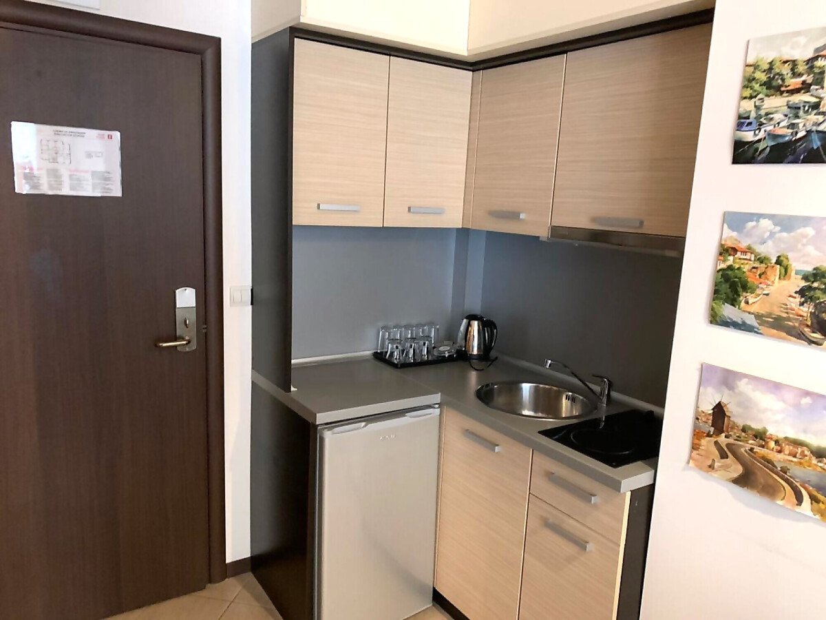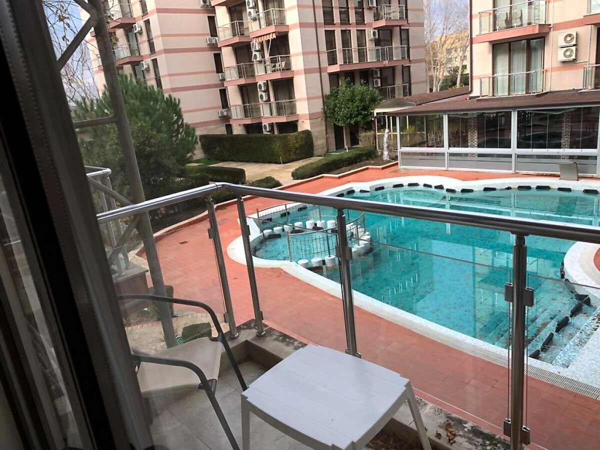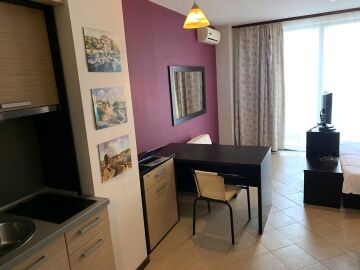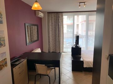Апартаментът е много функционален, оборудван с необходимата техника, напълно обзаведен, готов за нанасяне. Състои се от всекидневна с кухненски бокс и обособена спалня, баня с тоалетна и душ кабина, тераса с невероятна гледка към басейна.