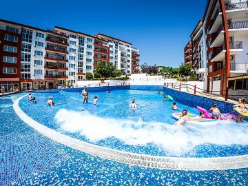 · повече от 10 плувни басейна, единият от които с изкуствени вълни, а другият - с джакузи, шезлонги