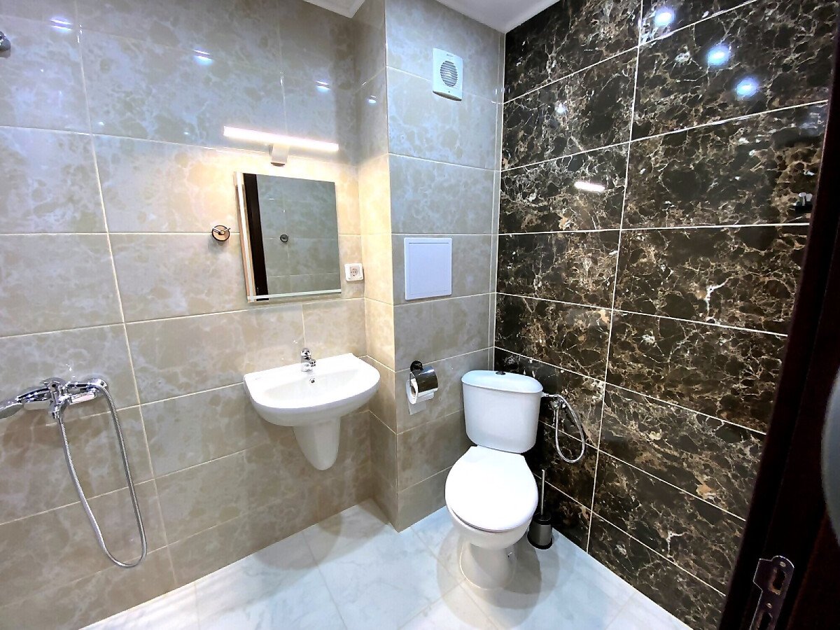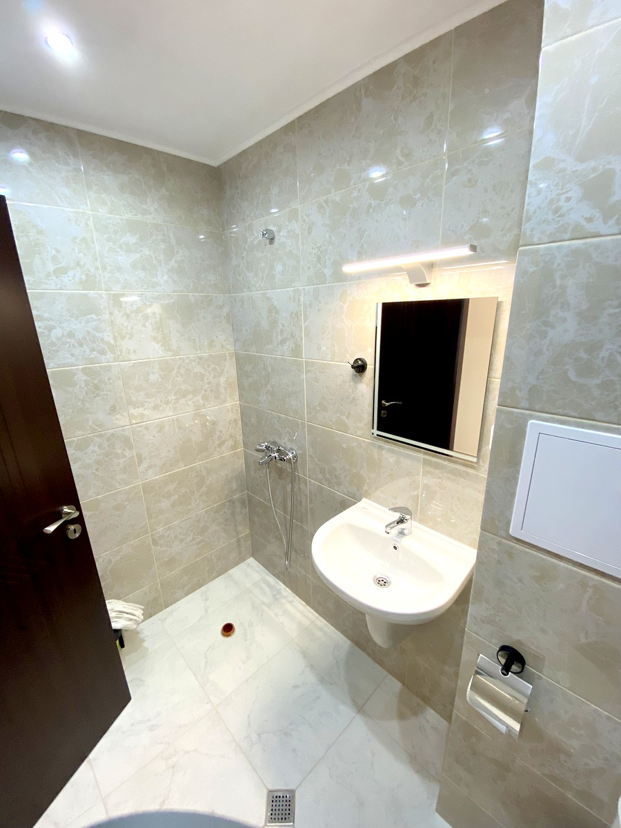 Банята е напълно завършена и функционална. В апартамента са поставени подови настилки, дограма и метална интериорна врата.