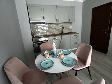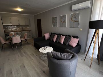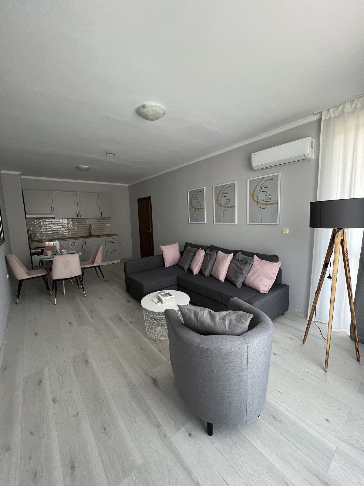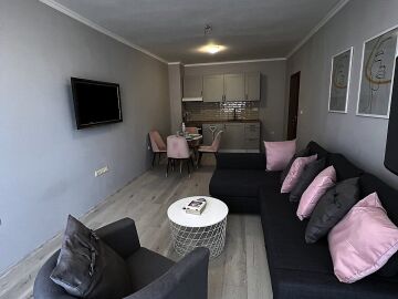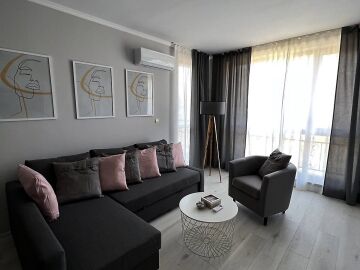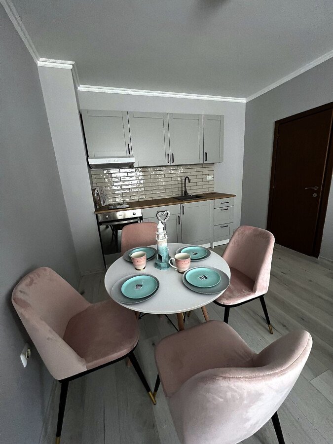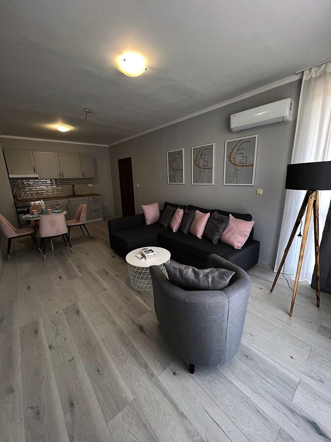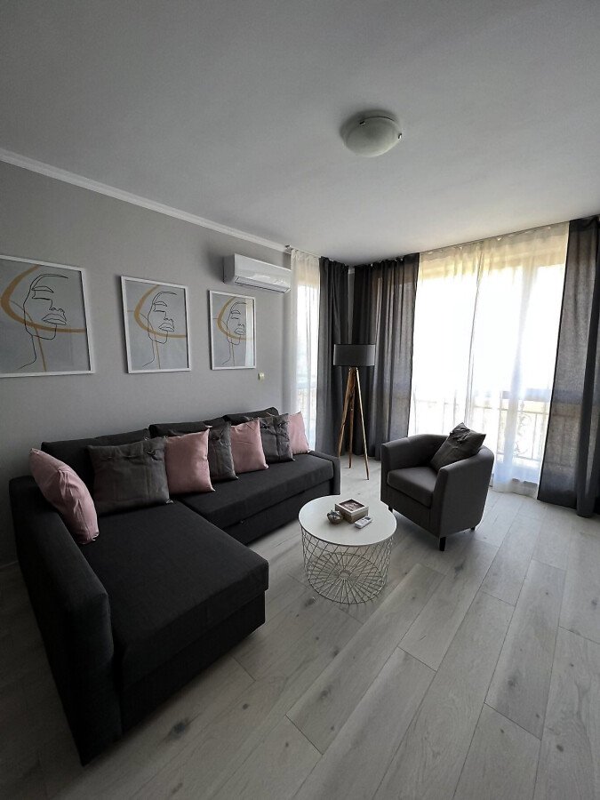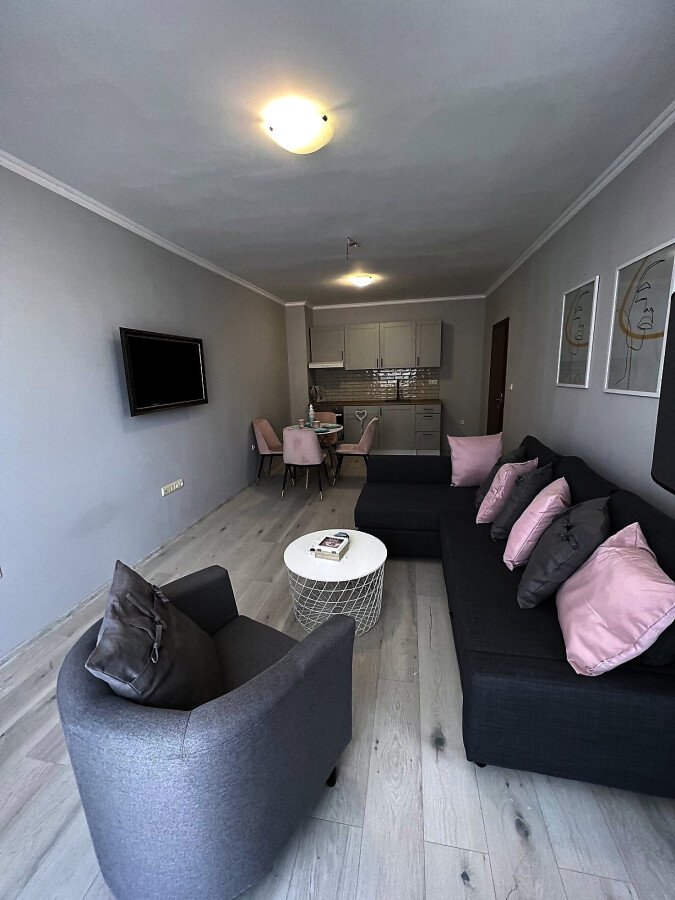 Апартаментът е реновиран, обзаведен стилно с нови мебели, оборудван с техника. Състои се от всекидневна с кухненски бокс и трапезария, баня с тоалетна, спалня, тераса.