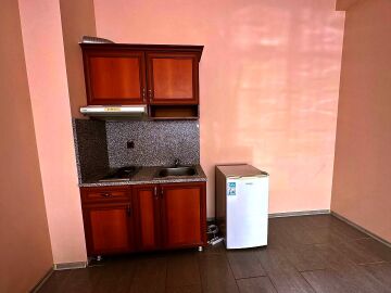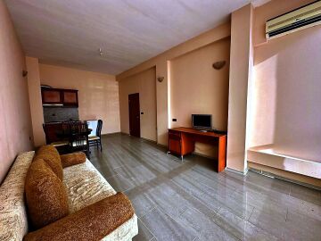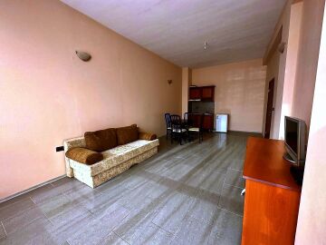 Апартаментът е просторен и функционален. Състои се от входно антре, всекидневна с трапезария и малък кухненски бокс, баня с тоалетна и вана, спалня, тераса с гледка към града.