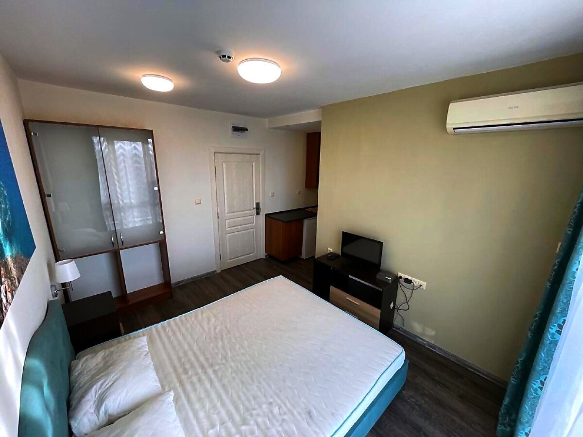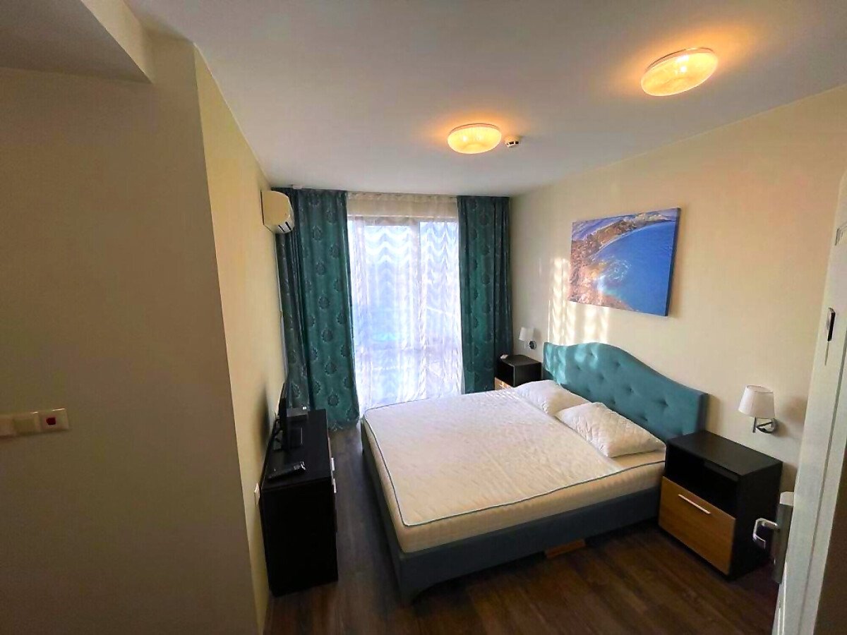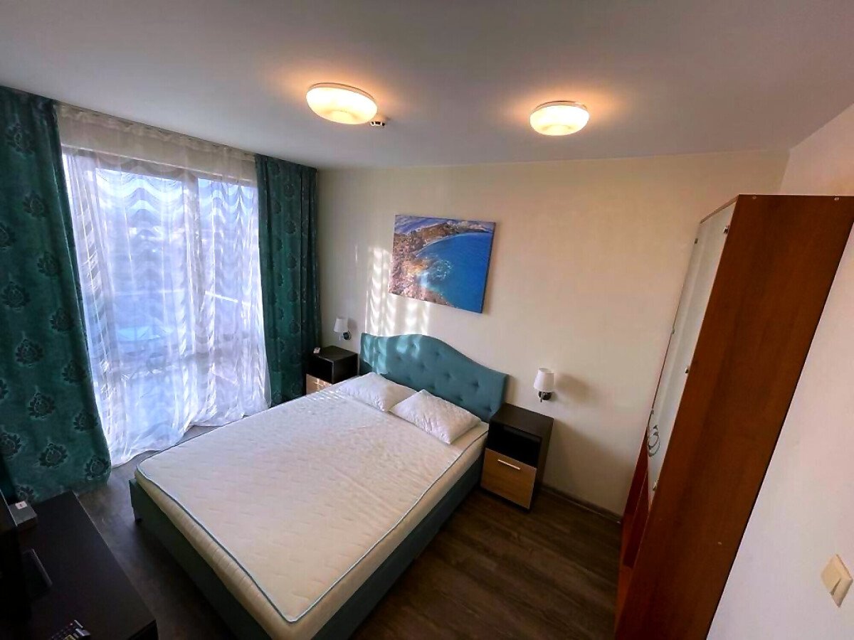 Студиото е светло, уютно и много функционално. Състои се от всекидневна с обособена спалня и кухненски бокс, баня с тоалетна и душ кабина, тераса с гледка към басейна. Продава се оборудвано с техника, напълно обзаведено, готово за нанасяне.
