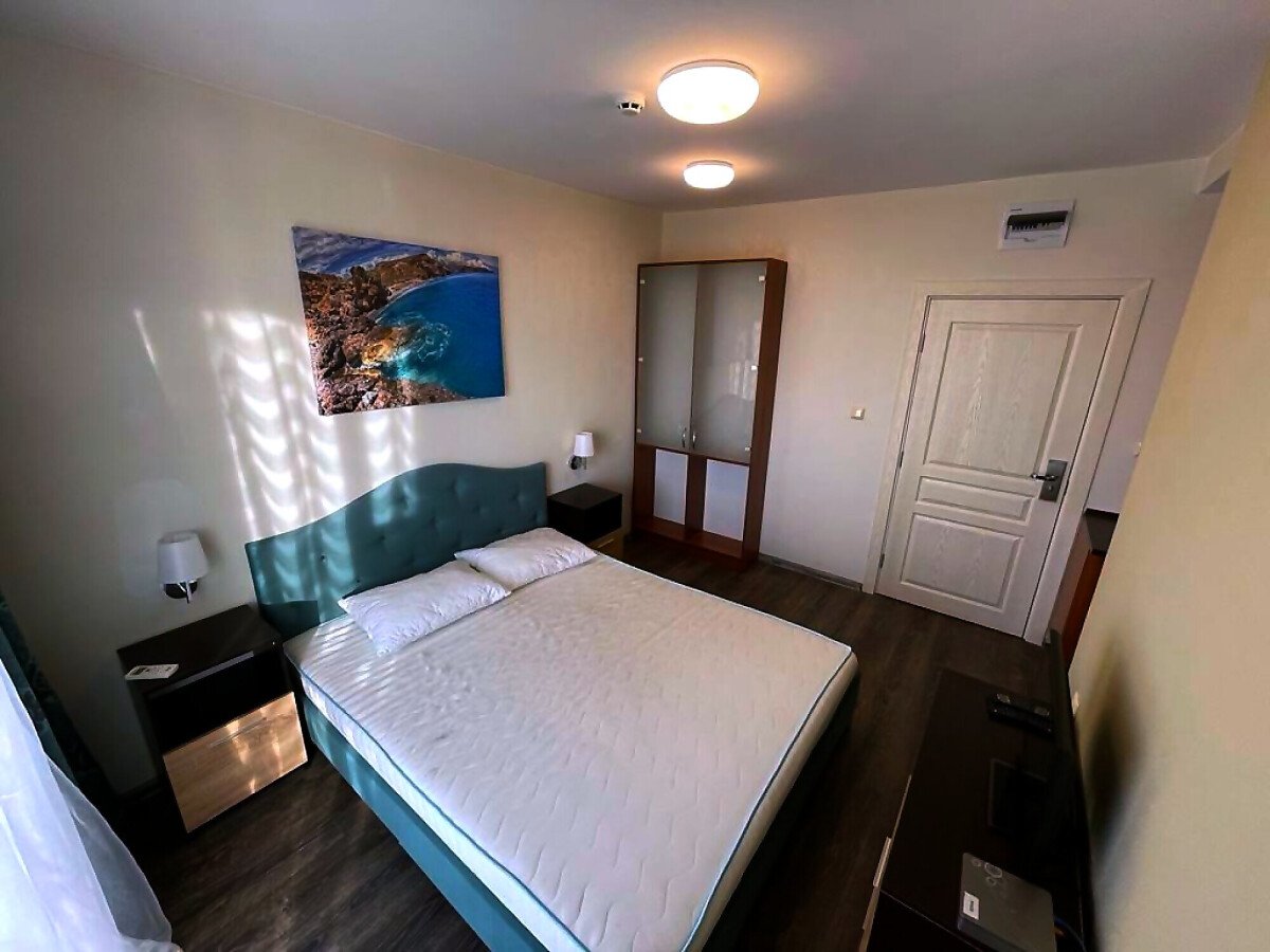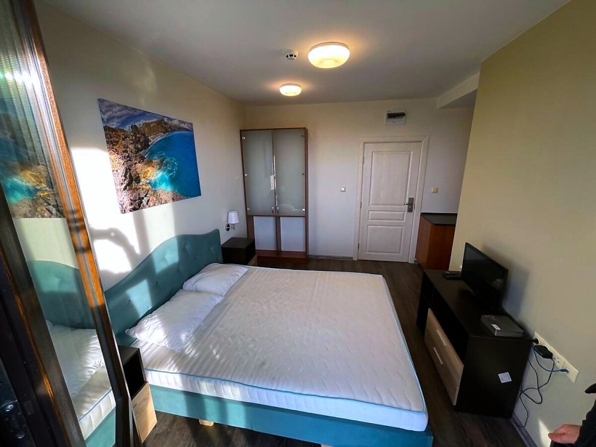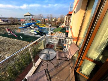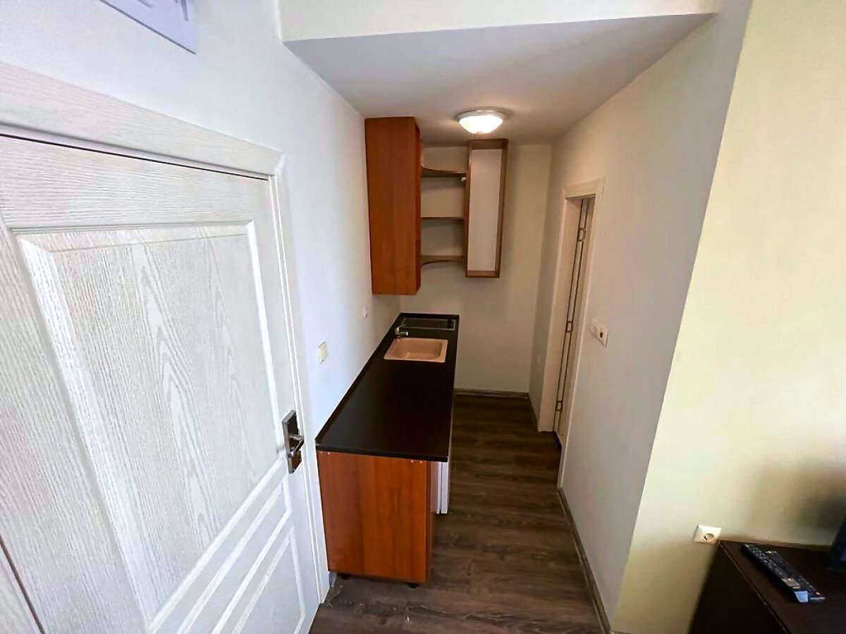 Студиото е светло, уютно и много функционално. Състои се от всекидневна с обособена спалня и кухненски бокс, баня с тоалетна и душ кабина, тераса с гледка към басейна. Продава се оборудвано с техника, напълно обзаведено, готово за нанасяне.