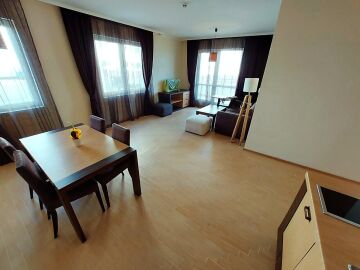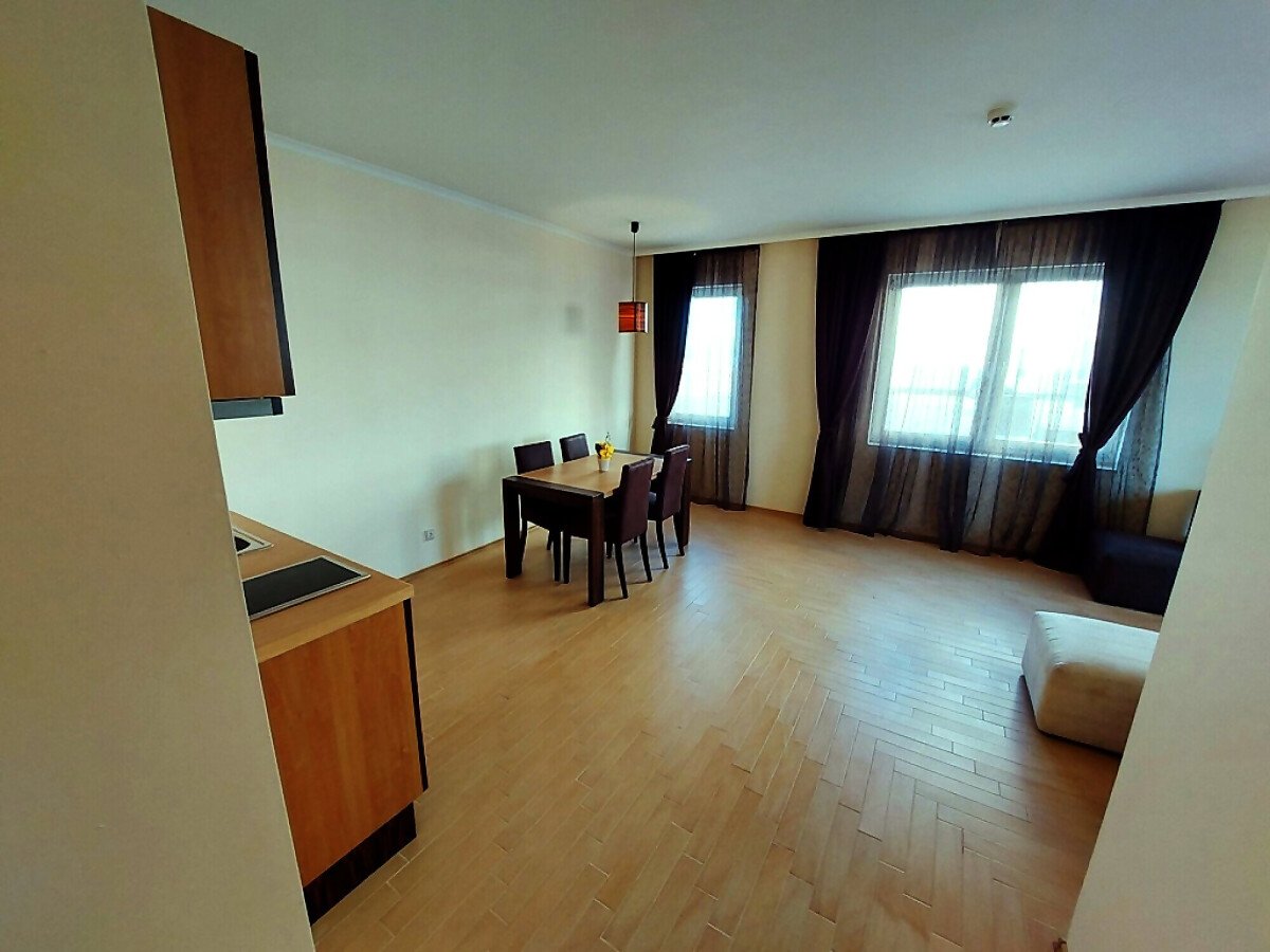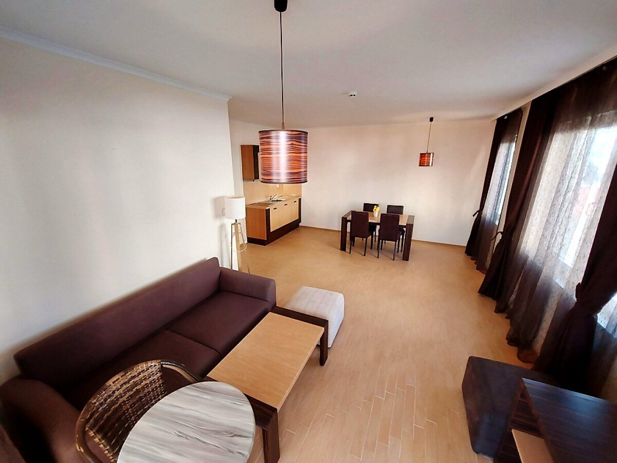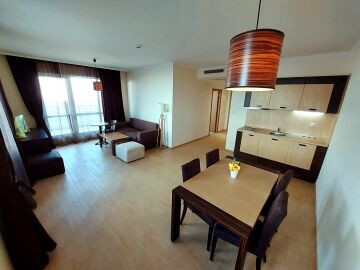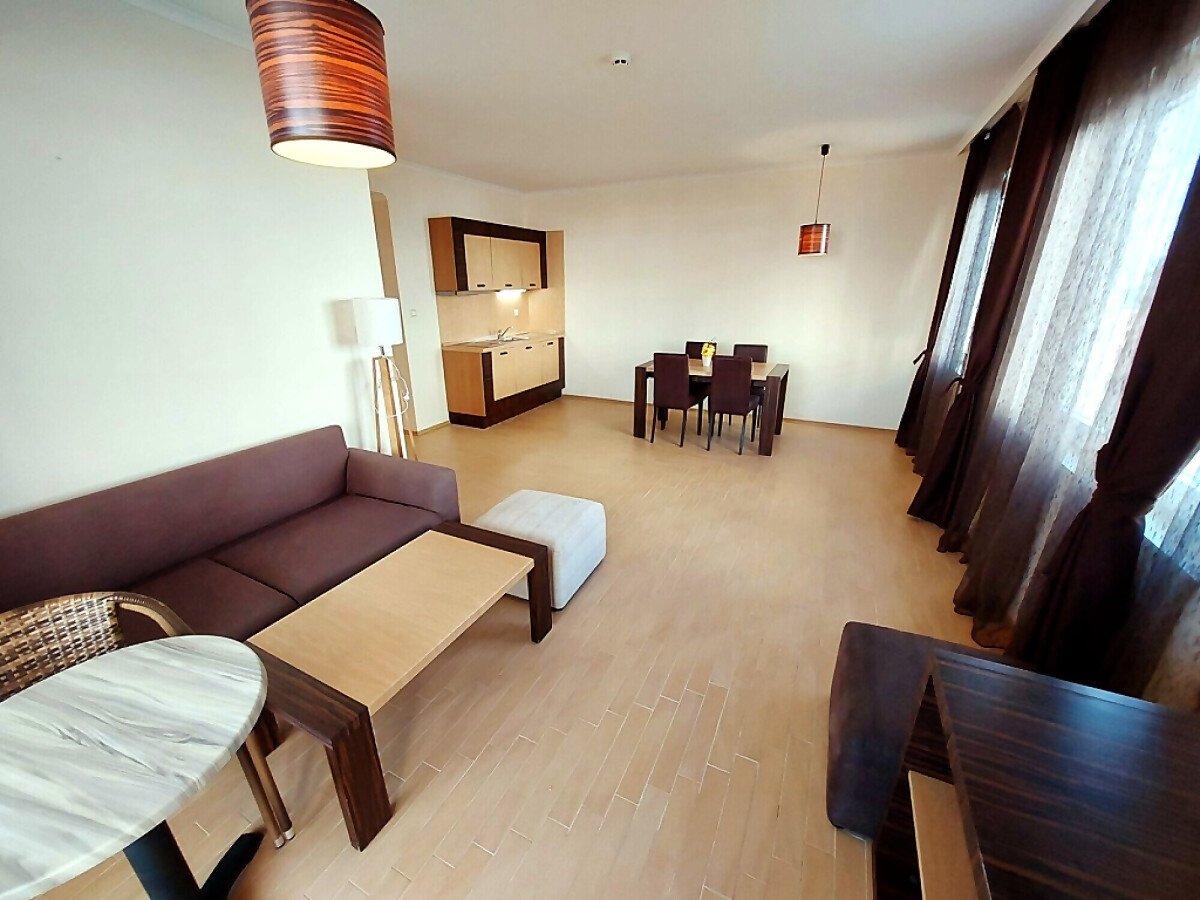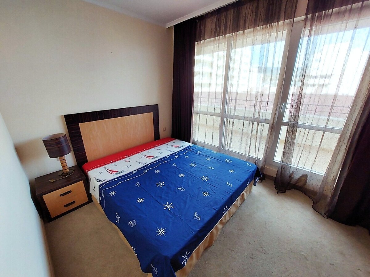 Апартаментът е просторен, светъл и много функционален. Разположен е на шести етаж, като в сградата има асансьор. Състои се от малък коридор, голяма всекидневна с кухненски бокс и кът за хранене, спалня, баня с тоалетна и вана, тераса с уникална гледка към морето и басейна. Продава се оборудван с необходимата домакинска техника, напълно обзаведен, готов за нанасяне.