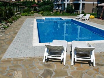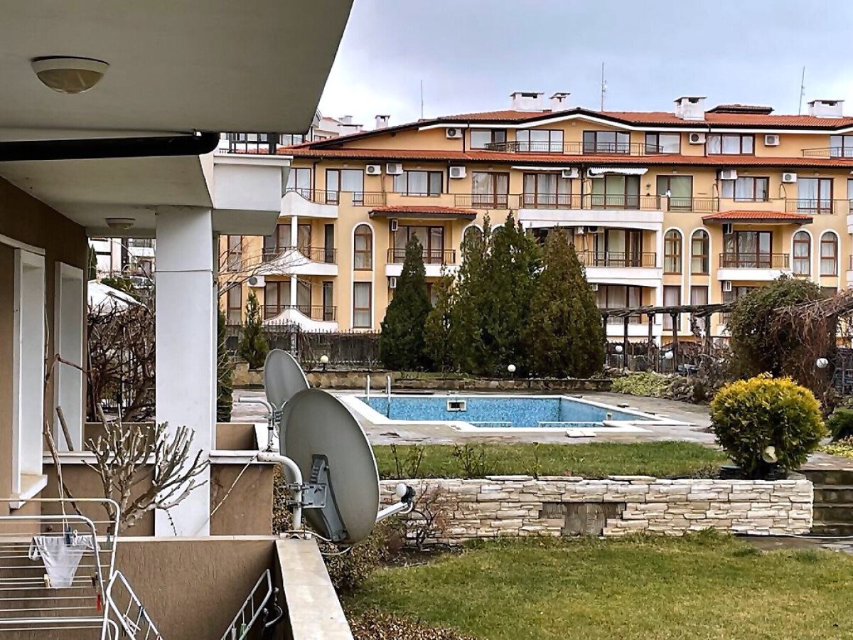 Комплексът е отлично поддържан и разполага с озеленена територия, открит плувен басейн с детска секция, зона за слънчеви бани, бар, тенис корт, поддръжка, паркинг.