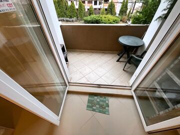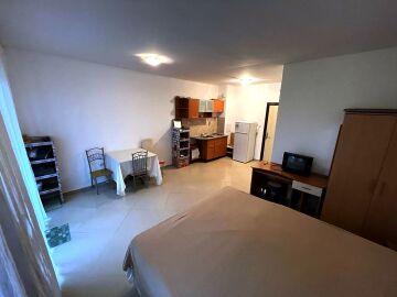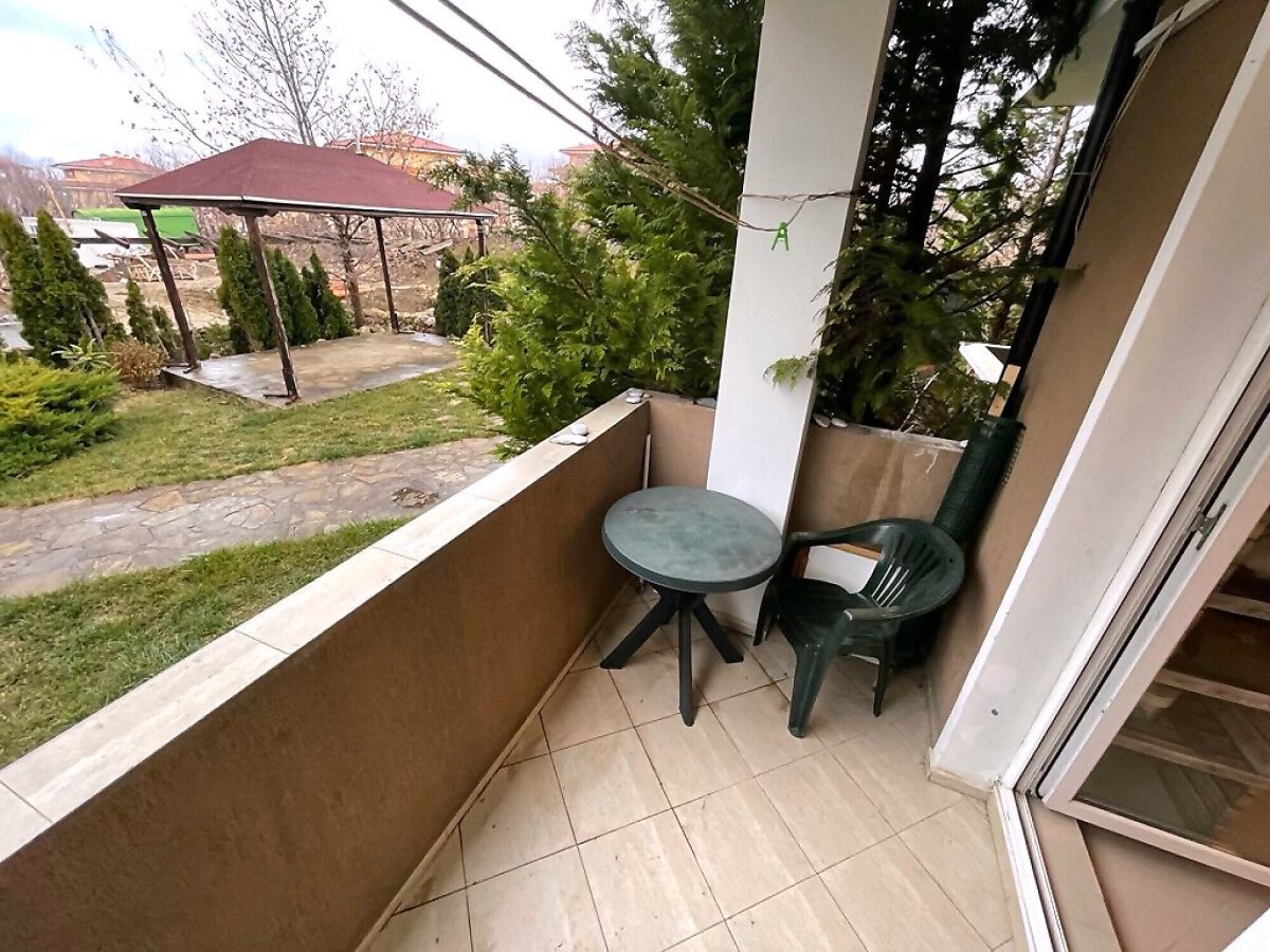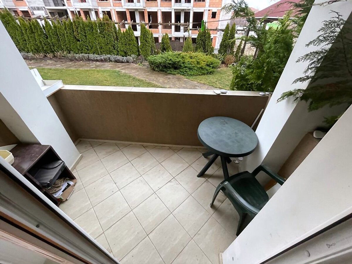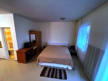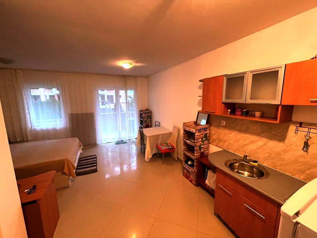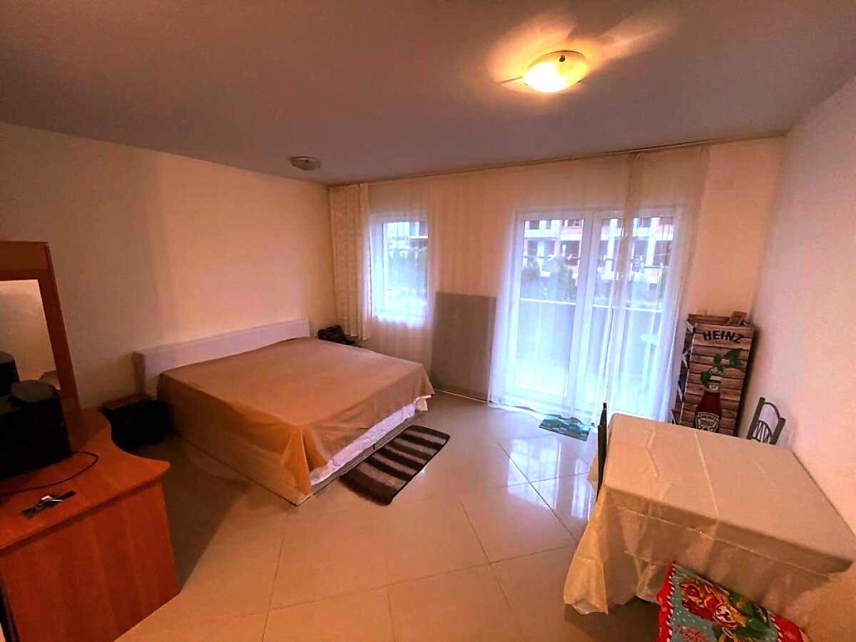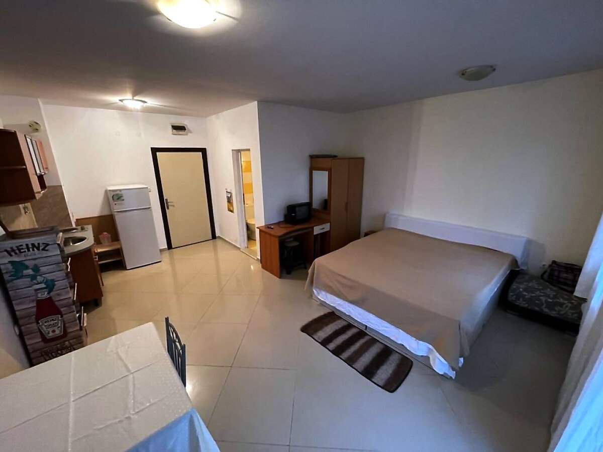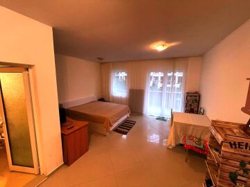 Студиото е много просторно, разположено на партерен етаж. Състои се от всекидневна с обособен кът за хранене и кухненски бокс, баня с тоалетна, тераса с красива гледка към двора и басейна. Продава се оборудвано с необходимата техника, напълно обзаведено, в много добро състояние.